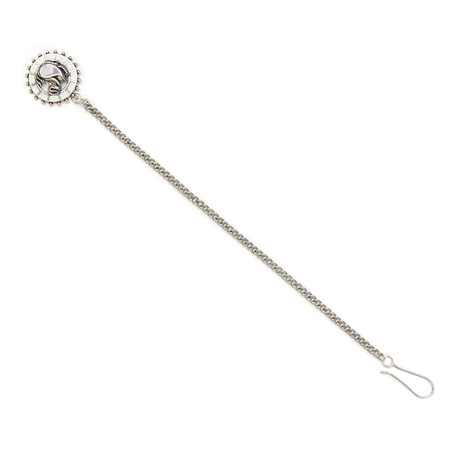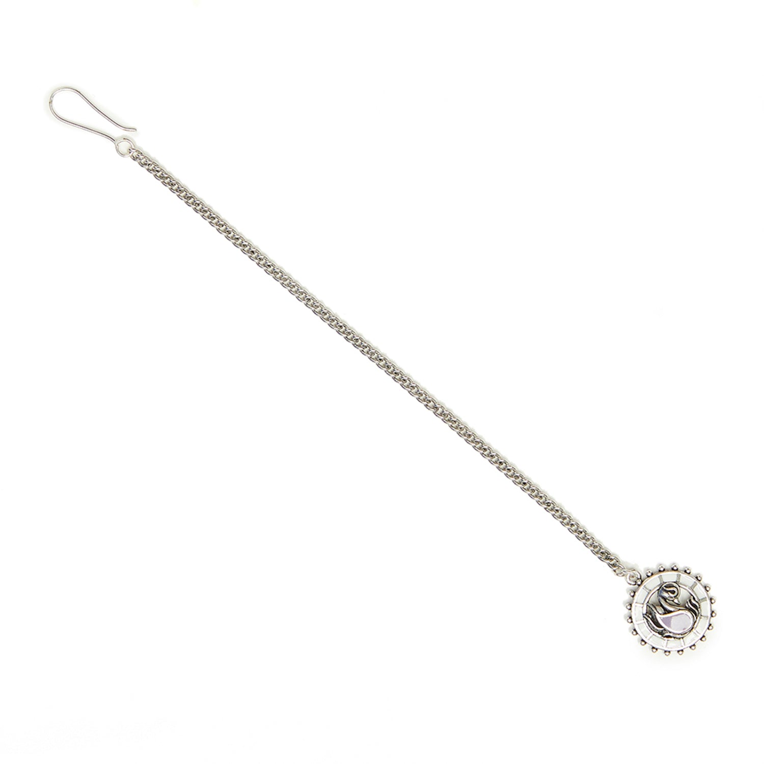 Traditional maang tika, made from brass and featuring a lovely silver plating. The peacock motif tika has been given light enamel embellishments. Pair the piece with an Indian or Indo-Western look. Also a good match for Bohemian outfits.