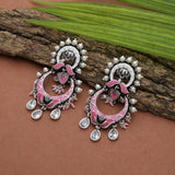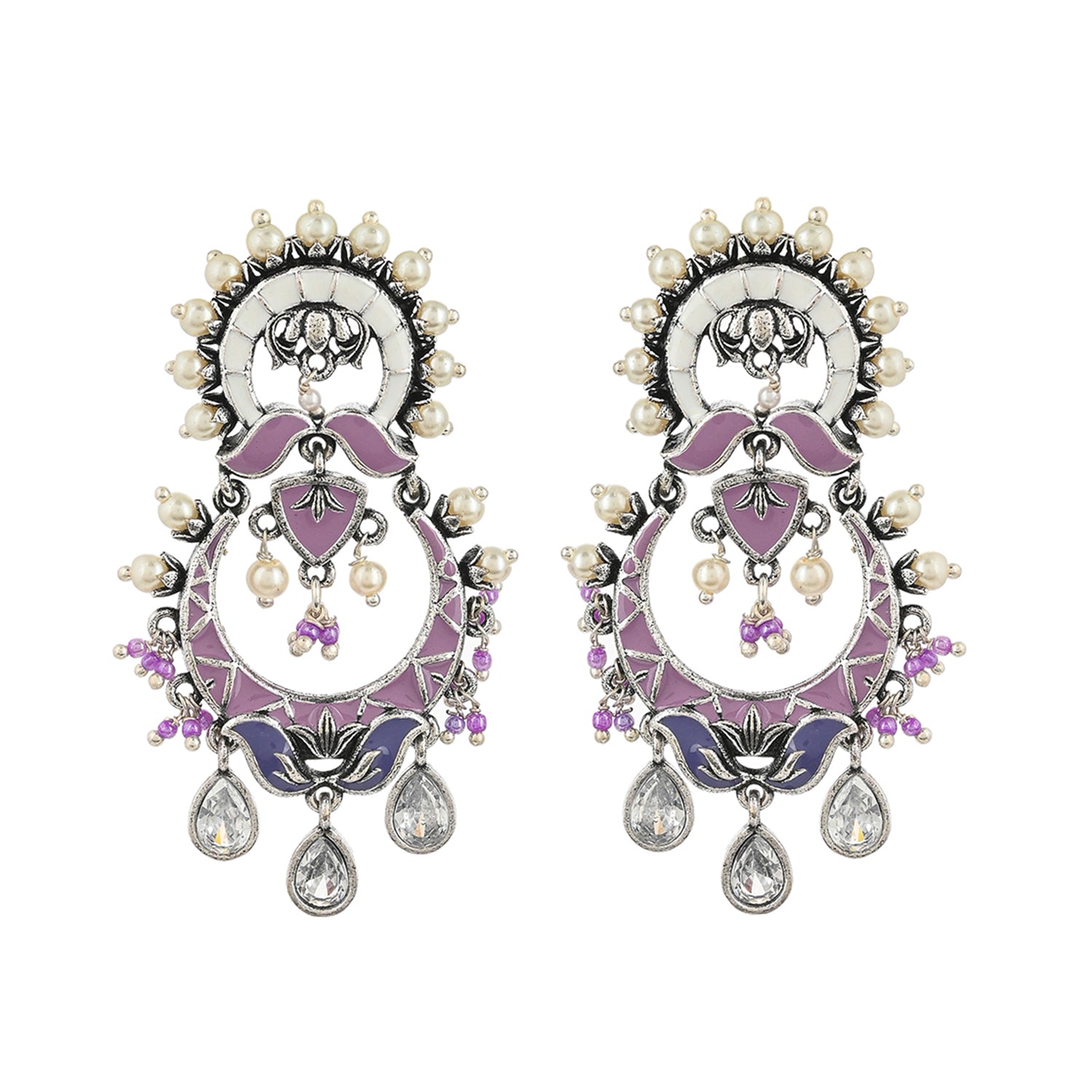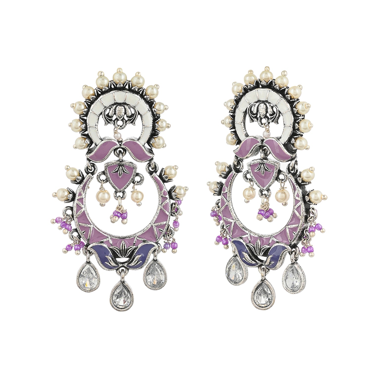 Silver plated drop earrings, fashioned out of brass and featuring delicate floral motifs. The pair has been embellished with faux pearls and kundan gems, and promises to be a comfortable wear at all times. A good match for Indian and Indo