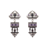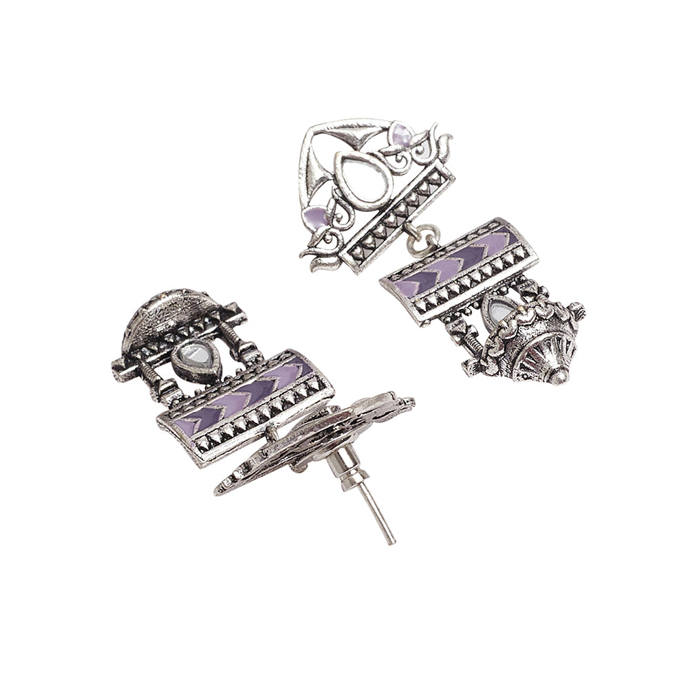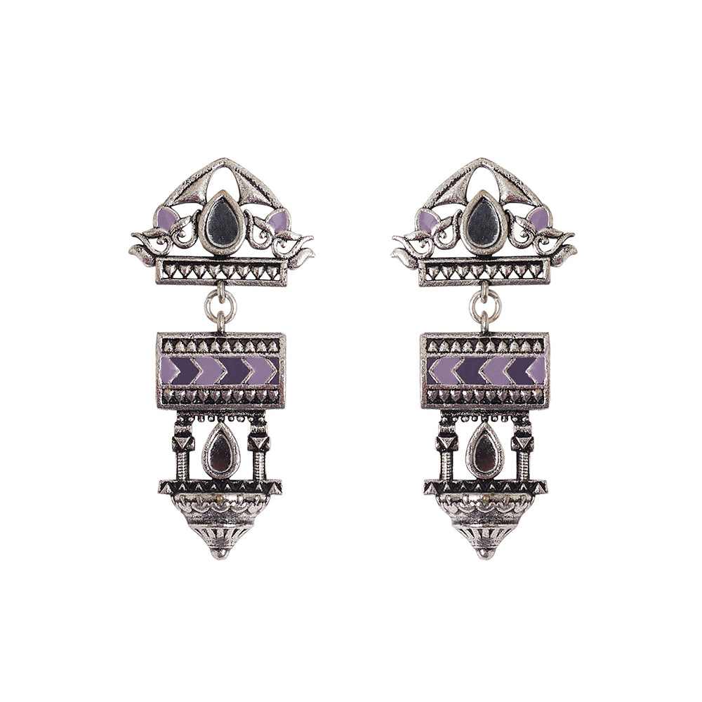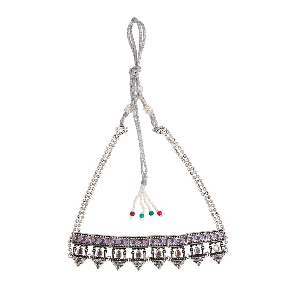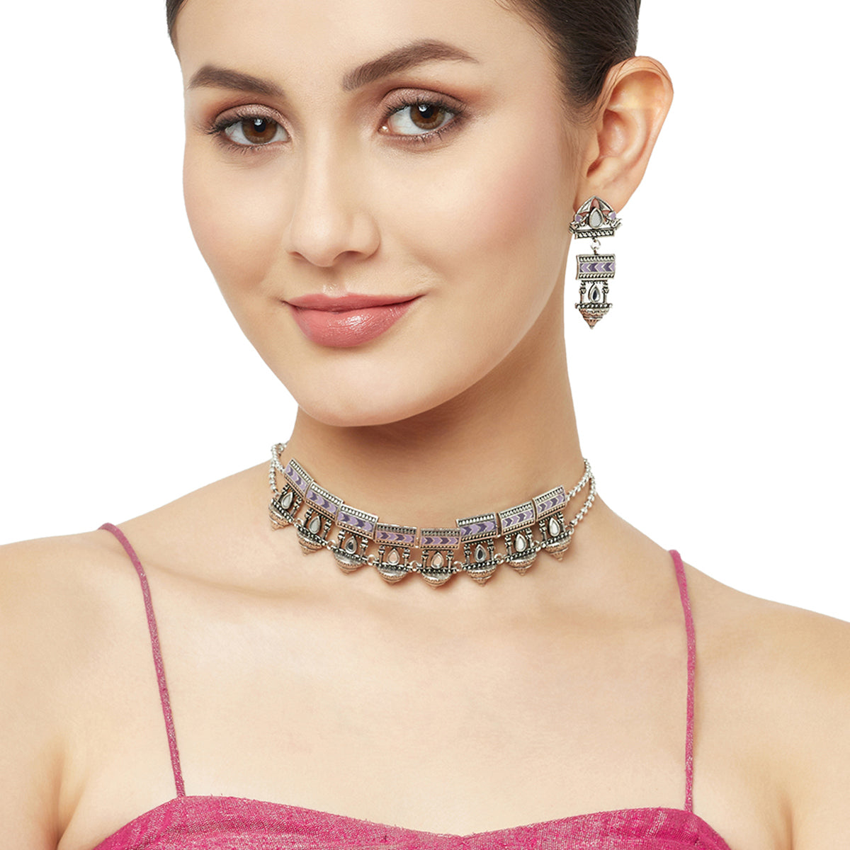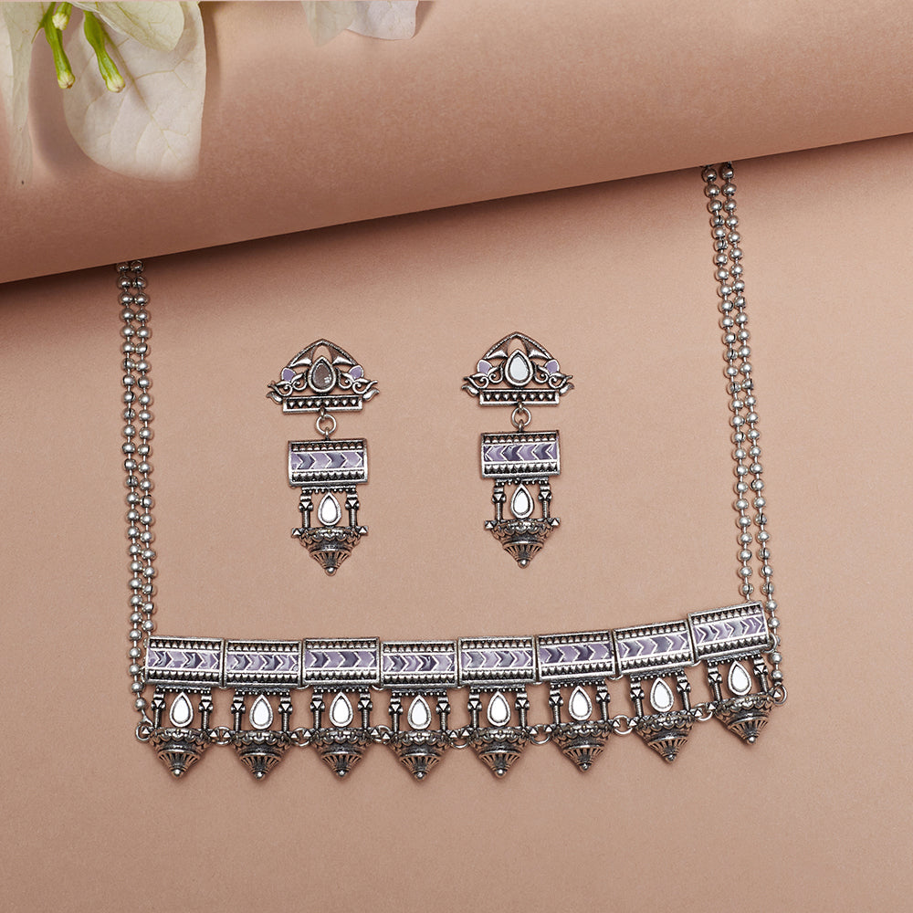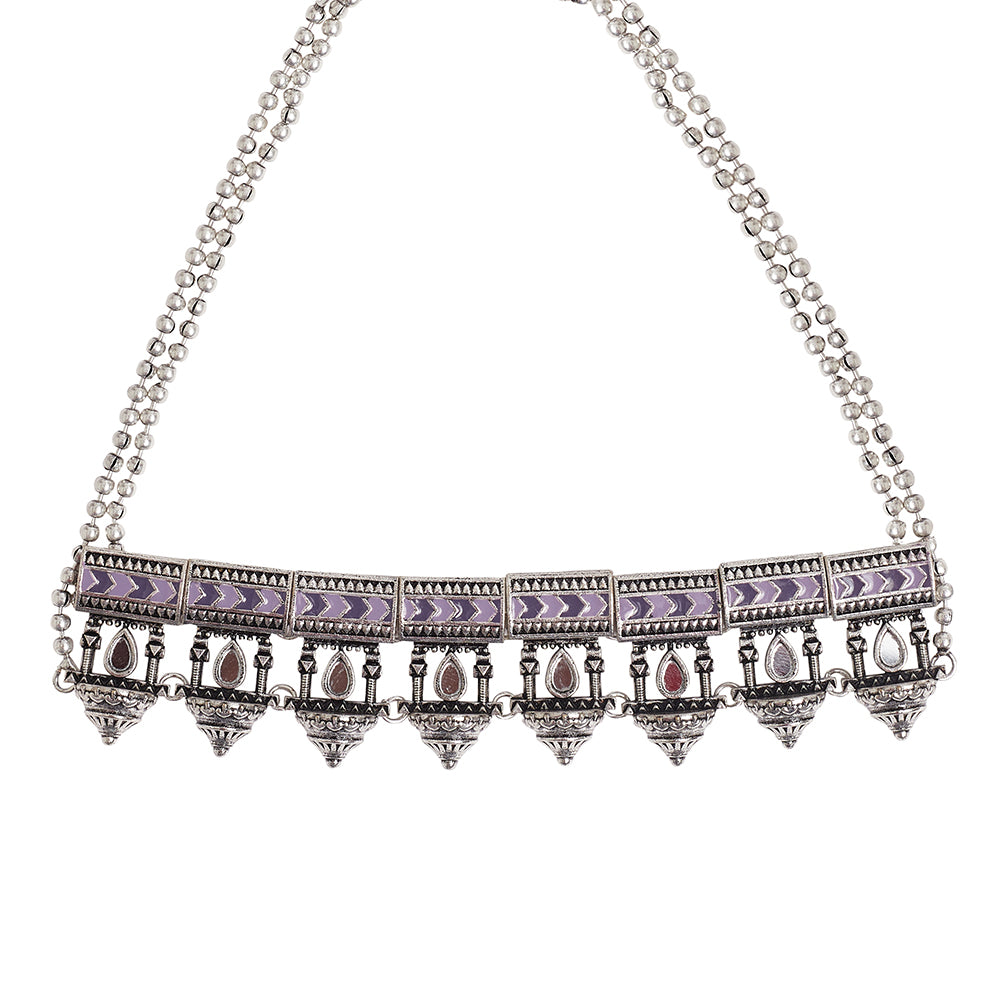 Oxidised plated brass jewellery set featuring a light embellishments and meenakari design. The beaded necklace and matching earrings are lightweight, comfortable and versatile. Pair the set with a casual Indo-Western or Bohemian outfit. Also a good match for traditional looks.