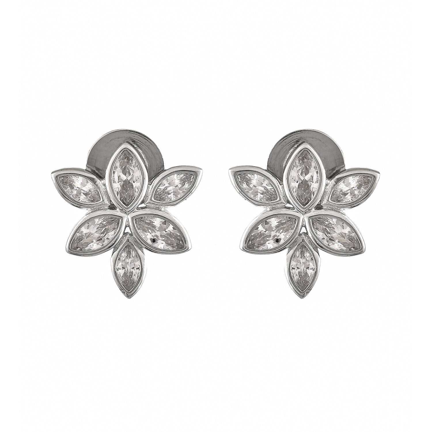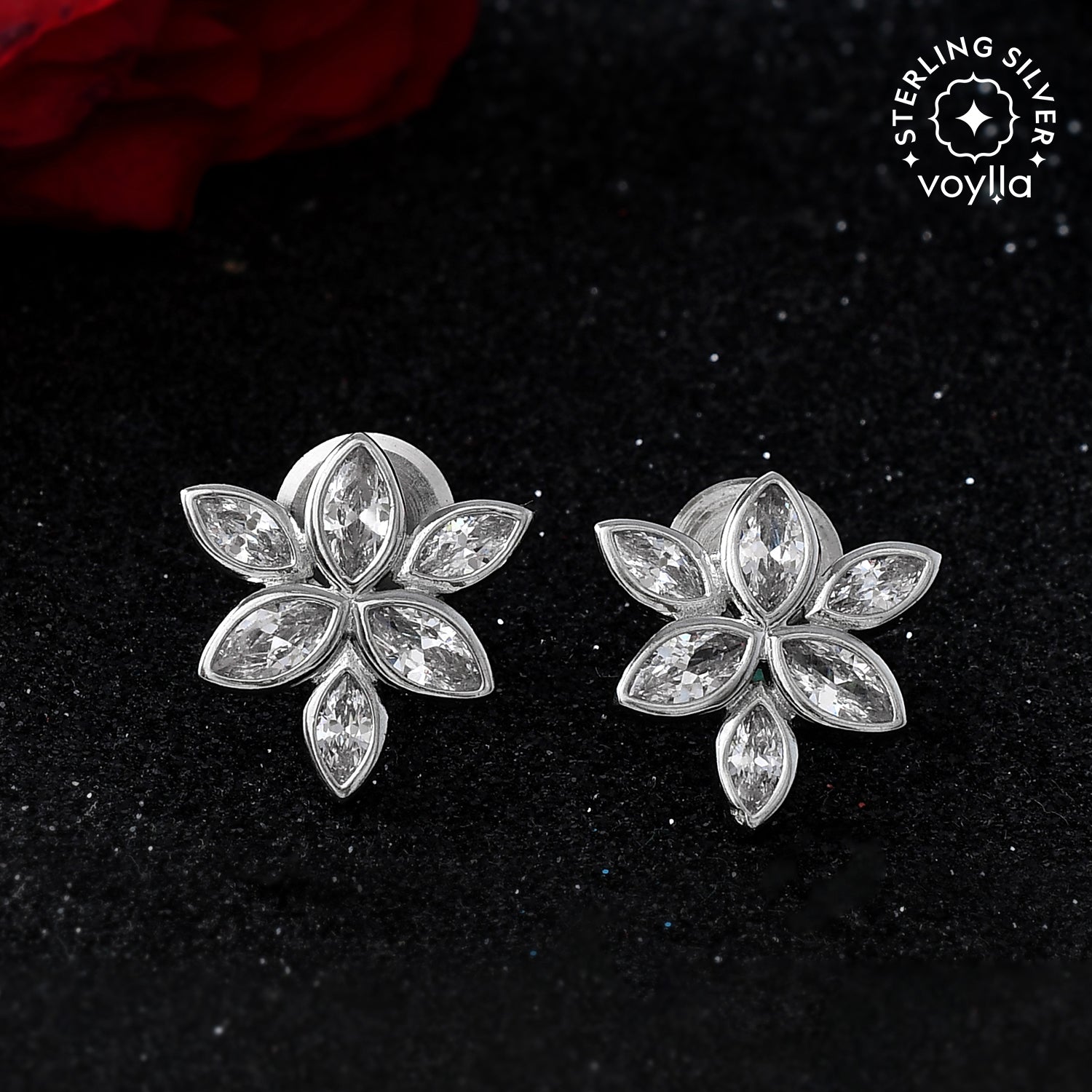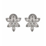Illuminate the spirit of love with our enchanting Cluster Petal Stud Earrings, The delicate floral design is adorned with sparkling cubic zirconia stones, forms a cluster of petals that gracefully captures the essence of blooming love. The lustrous white rhodium plating enhances the silver brilliance, symbolizing the purity and commitment inherent in your relationship.