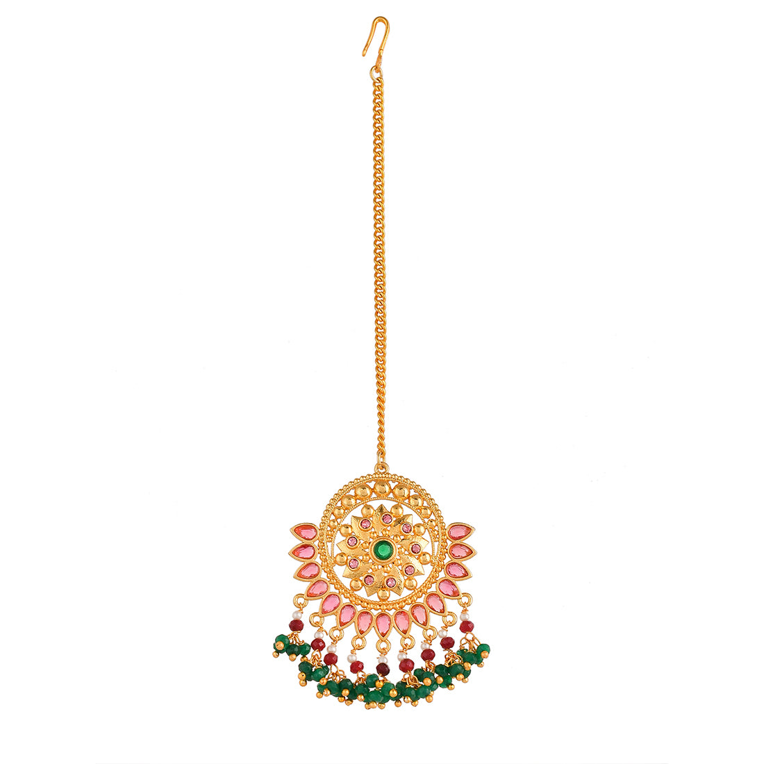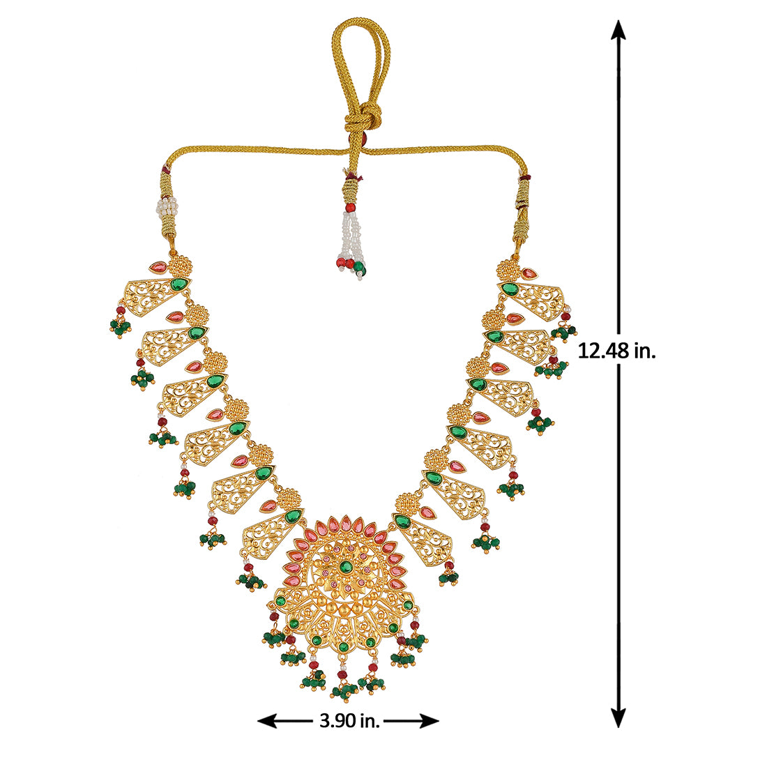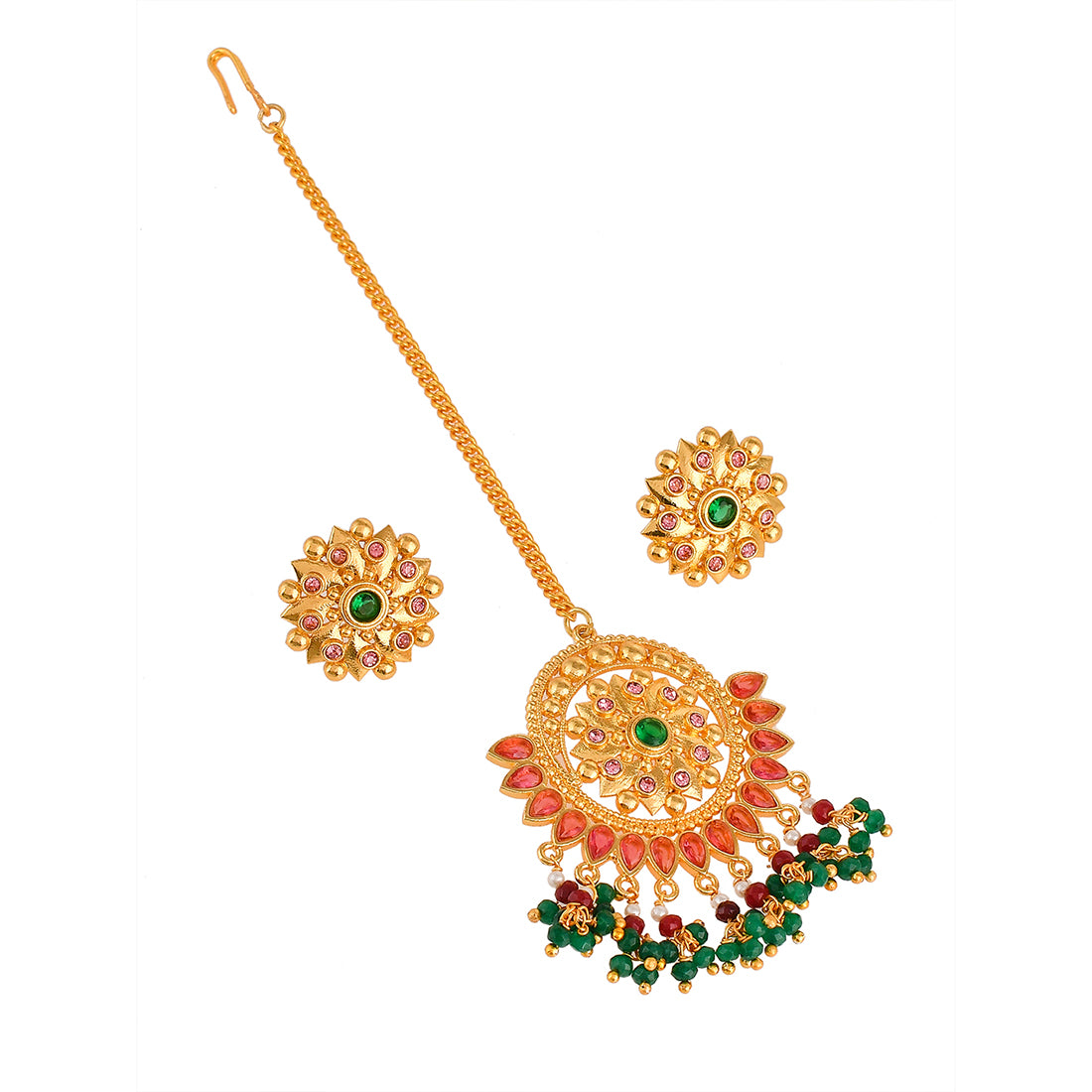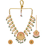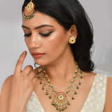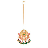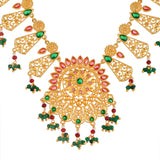 Yellow gold plated opulent jewellery set made from brass. The necklace, earrings and maang tika have been embellished with red and green stones. Good for formal Indian attire.