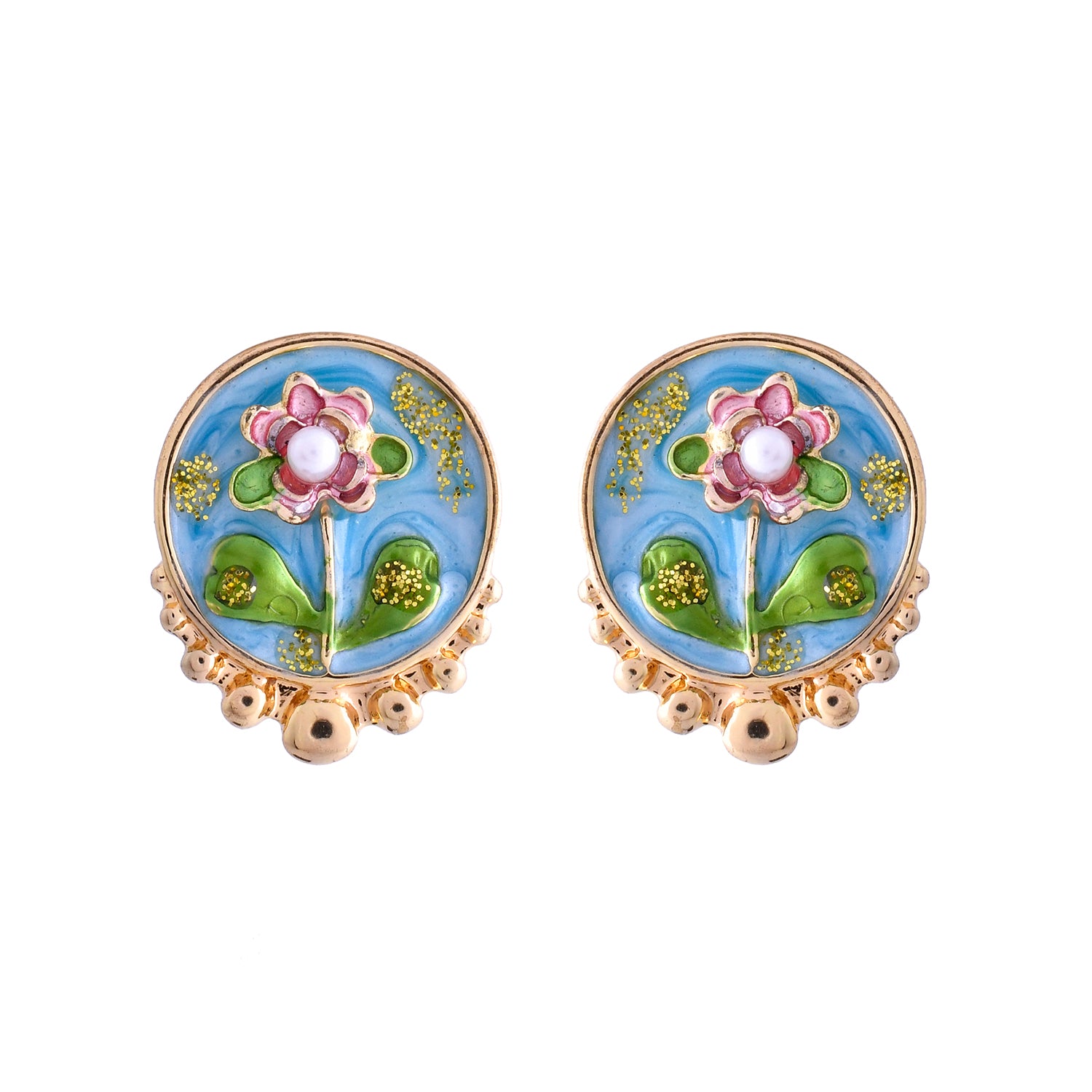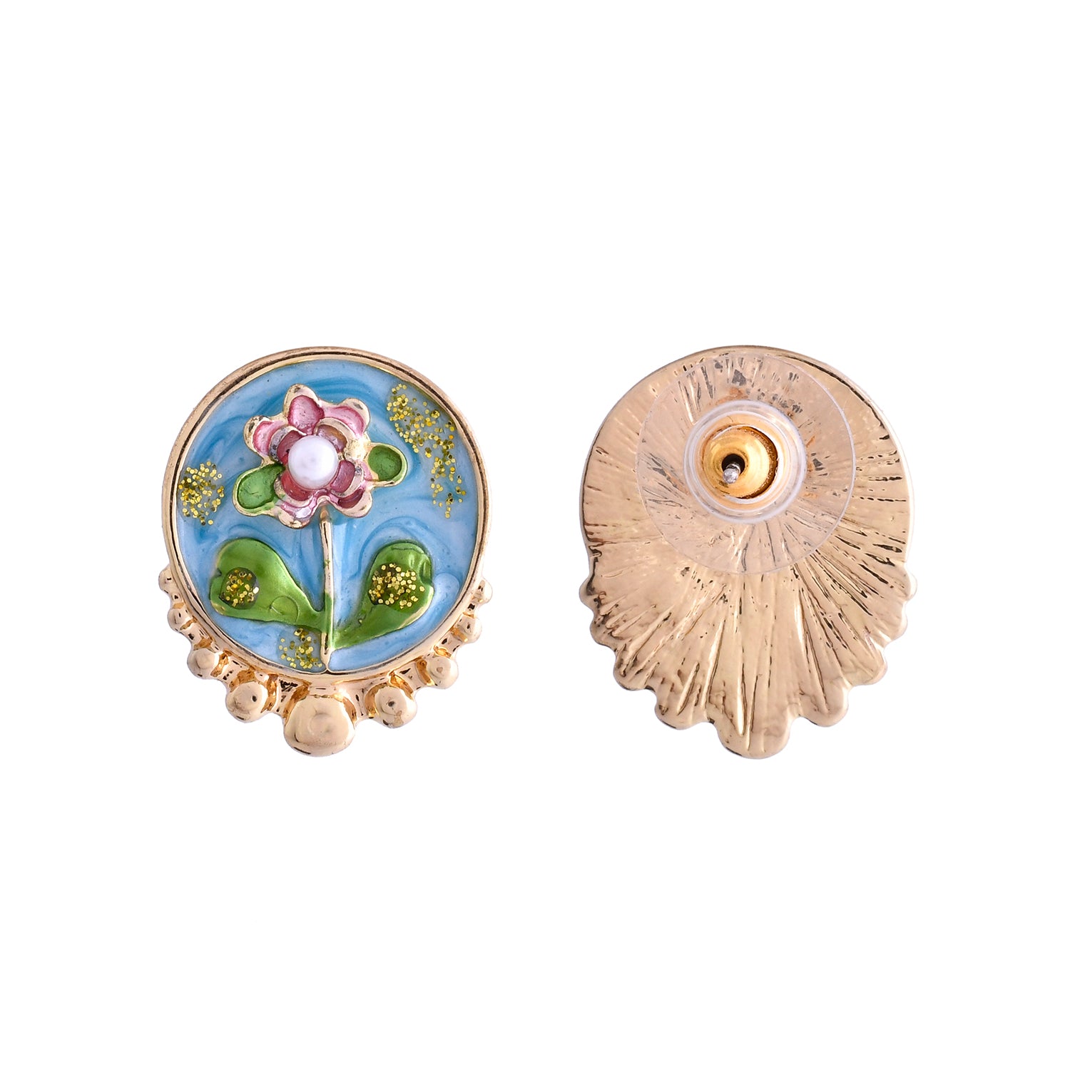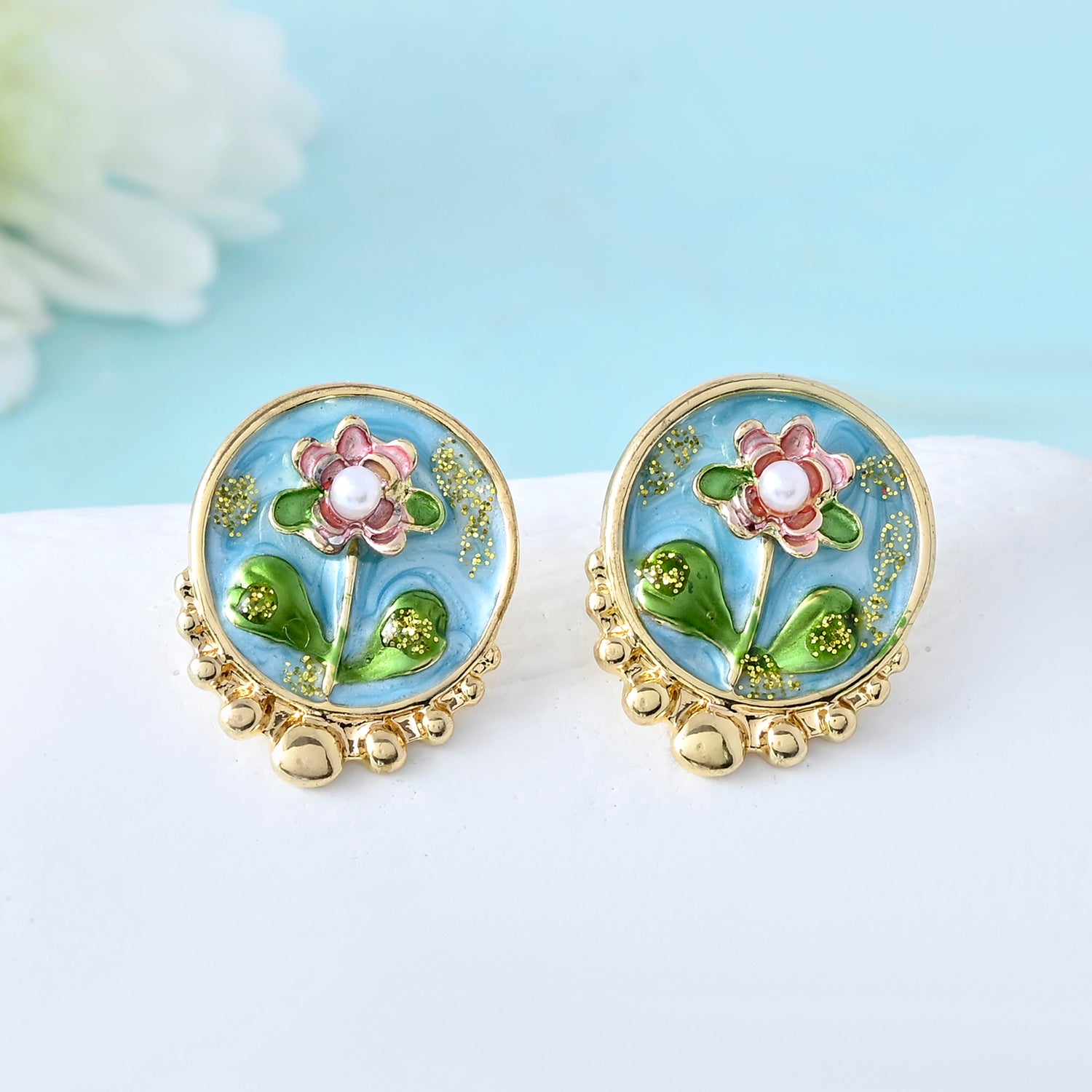 The Floral Artistry Golden Stud Earrings are a breathtaking blend of elegance and sophistication, making them a must-have for any jewelry collection. Expertly crafted from high-quality brass and featuring a luxurious gold plating, these earrings are part of the exquisite Blossom Collection. The intricate enamel design showcases a delicate flower with pink petals, a central pearl, green leaves, and golden accents, set against a serene blue background. These earrings are versatile, perfect for everyday wear as well as special occasions, adding a touch of chic and contemporary style to any outfit. They make an ideal gift for loved ones, whether it's for Valentine's Day, Diwali, Rakshabandhan, Christmas, or any other celebration. Surprise your girlfriend, wife, mother, or sister with these stunning earrings that embody timeless beauty and grace.