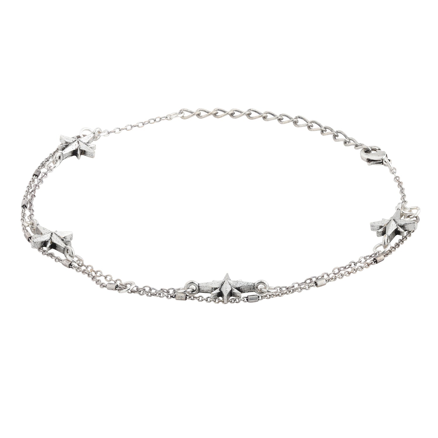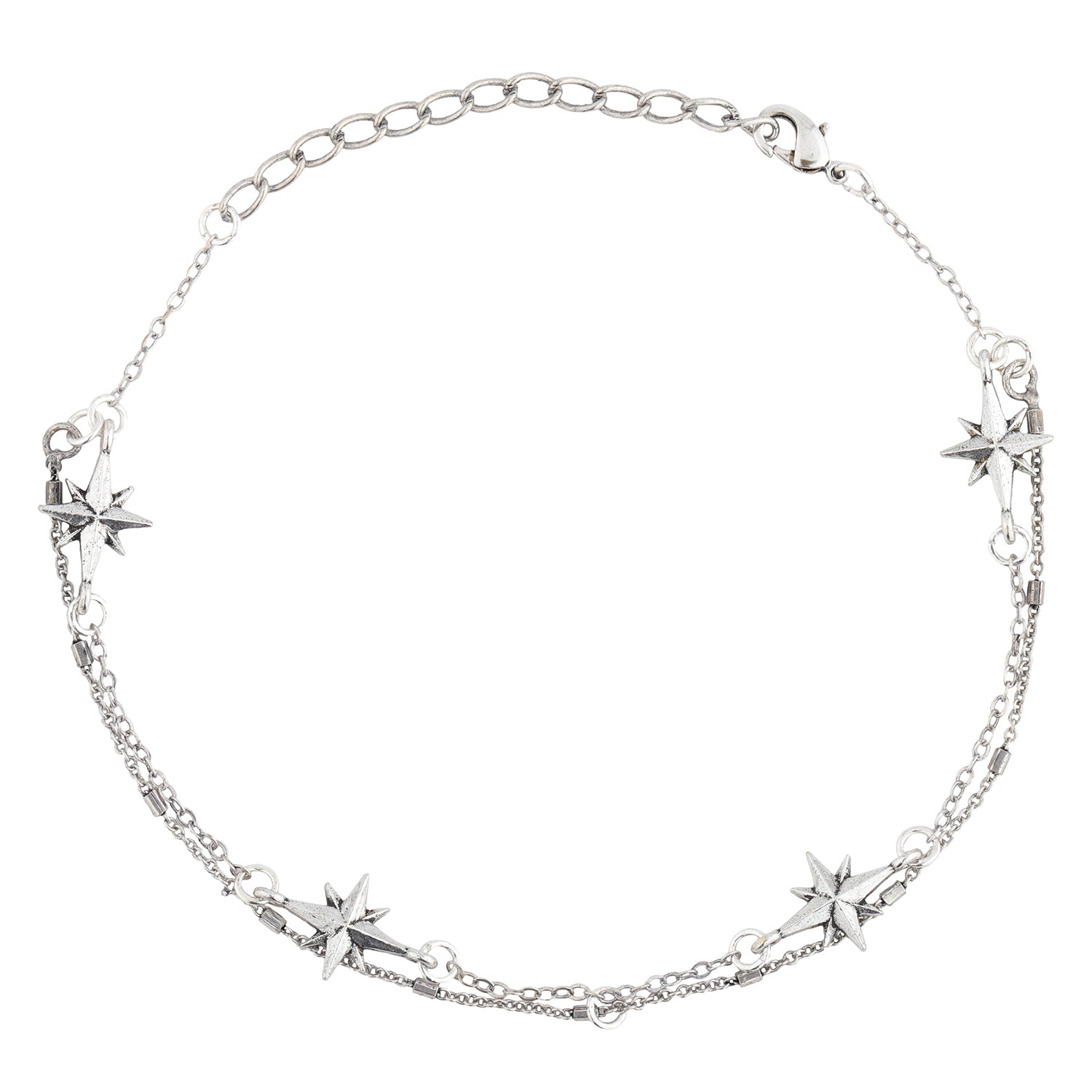Introducing the Boho Tribe Celestial Charm Oxidised Anklet, a captivating piece that embodies the essence of free-spirited bohemian culture. Crafted from high-quality brass with a stunning silver oxidised plating, this anklet features intricate celestial star charms that add a whimsical and elegant touch. Part of the Boho Tribe collection, it seamlessly blends traditional and contemporary elements, making it a versatile accessory for any occasion. Whether you're dressing up for a special event like Diwali, Rakshabandhan, or Holi, or simply adding a chic flair to your everyday wear, this anklet is perfect for travel, office jewelry, or a stylish vacation look. Its silver hue complements a wide range of outfits and colors, making it an ideal gift for women—be it Valentine's Day, Christmas, New Year, or as a thoughtful present for your sister, girlfriend, wife, or mother. Elevate your jewelry collection with this statement piece that exudes elegance and bohemian charm, while also resonating with the modern chic aesthetic.