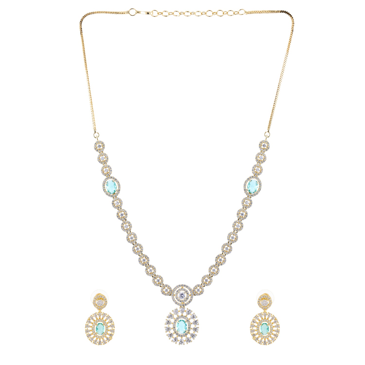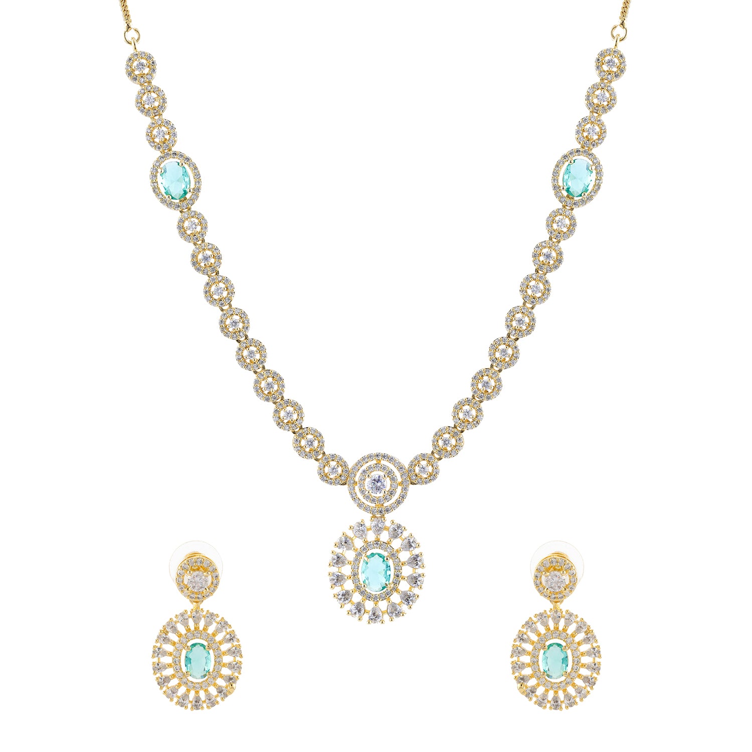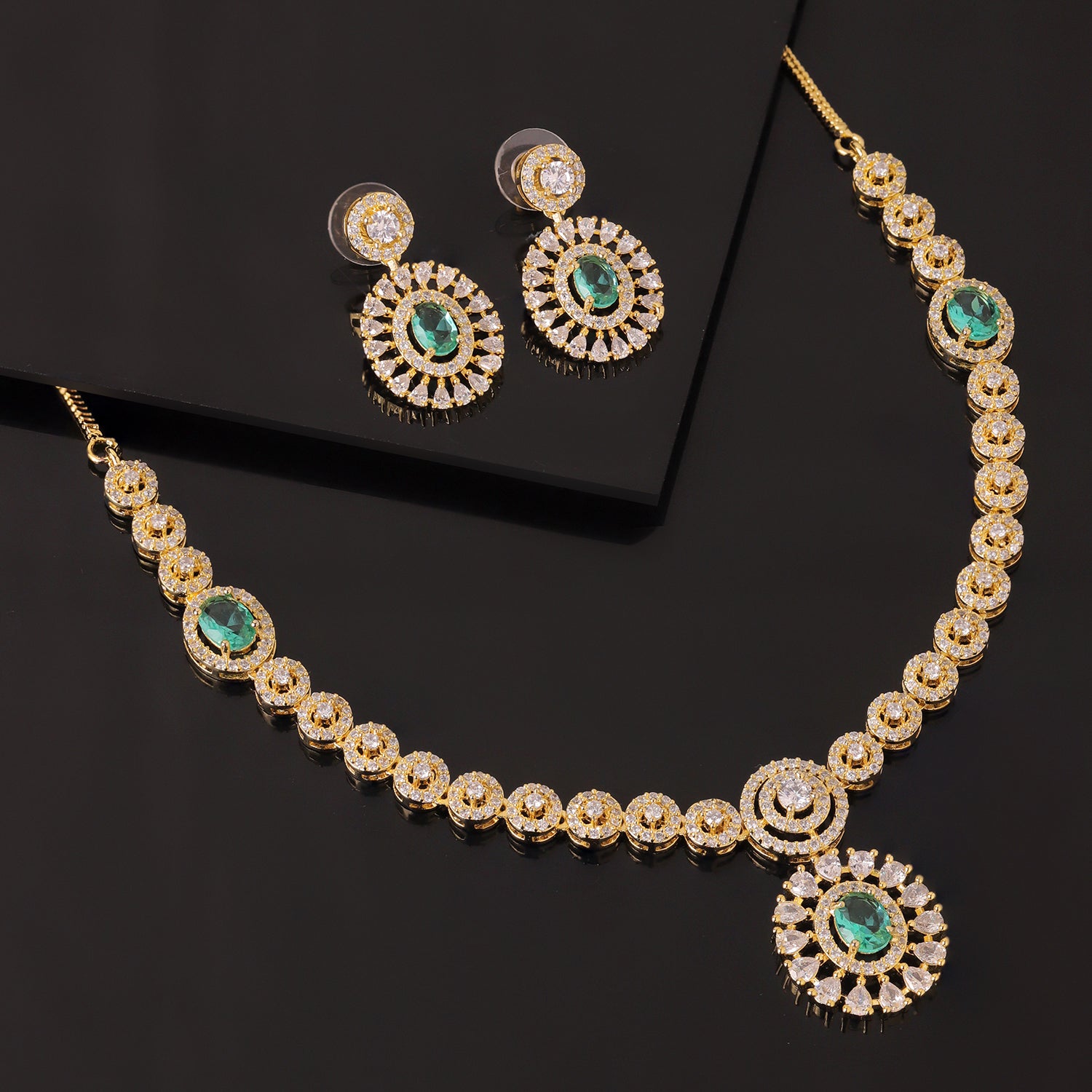 The Gold Elegance Emerald Halo CZ Necklace Set is a refined statement of timeless beauty designed for women who appreciate classic elegance with a modern finish. Crafted under Voylla’s premium Gold Elegance Collection, this jewellery set draws inspiration from regal emerald motifs framed in luminous cubic zirconia halos, creating a look that feels luxurious yet effortlessly graceful. The necklace features round emerald green centre stones surrounded by finely set clear CZ stones, forming a radiant halo pattern that reflects light from every angle. These motifs are seamlessly linked across the necklace, creating a balanced and fluid silhouette that sits beautifully along the neckline. The matching earrings mirror the same circular halo design, completing the set with a cohesive and polished appeal. Finished in rich yellow gold plating over high quality brass, this necklace set offers durability along with a warm golden glow that enhances both traditional and contemporary outfits. The craftsmanship ensures smooth edges, secure stone placement, and comfortable wear, making it suitable for long celebrations without feeling heavy. An adjustable chain allows flexibility in styling, accommodating different necklines with ease. Styling the Gold Elegance Emerald Halo CZ Necklace Set is effortless. Pair it with silk sarees, lehengas, embroidered suits, or festive anarkalis for weddings and family functions. The elegant green tones also complement neutral gowns and fusion wear, making this set versatile enough for both traditional and modern wardrobes. Whether worn as a bridal accent or a festive highlight, it adds instant sophistication. This necklace set also makes a meaningful gift choice. Ideal for Valentine’s Day, anniversaries, birthdays, propose day, or special milestones, it is a thoughtful jewellery gift for your wife, girlfriend, or loved one. Designed to remain timeless beyond trends, the Gold Elegance Emerald Halo CZ Necklace Set is a piece she will treasure and return to for years to come.