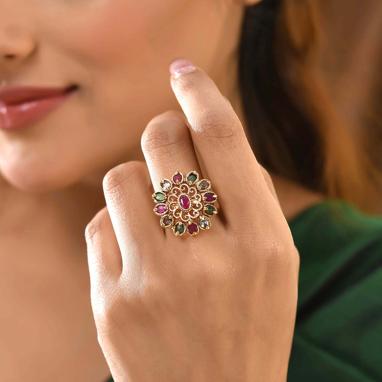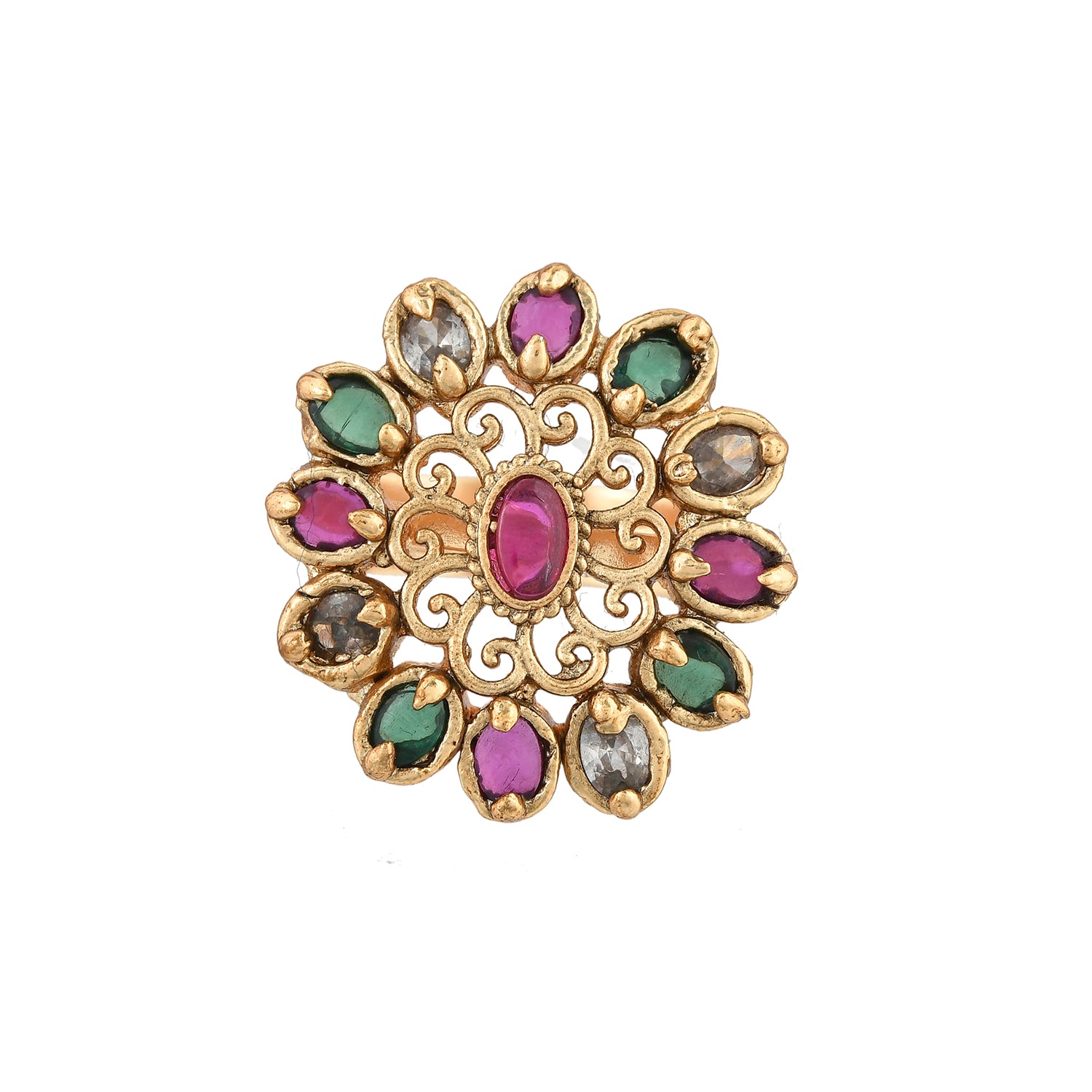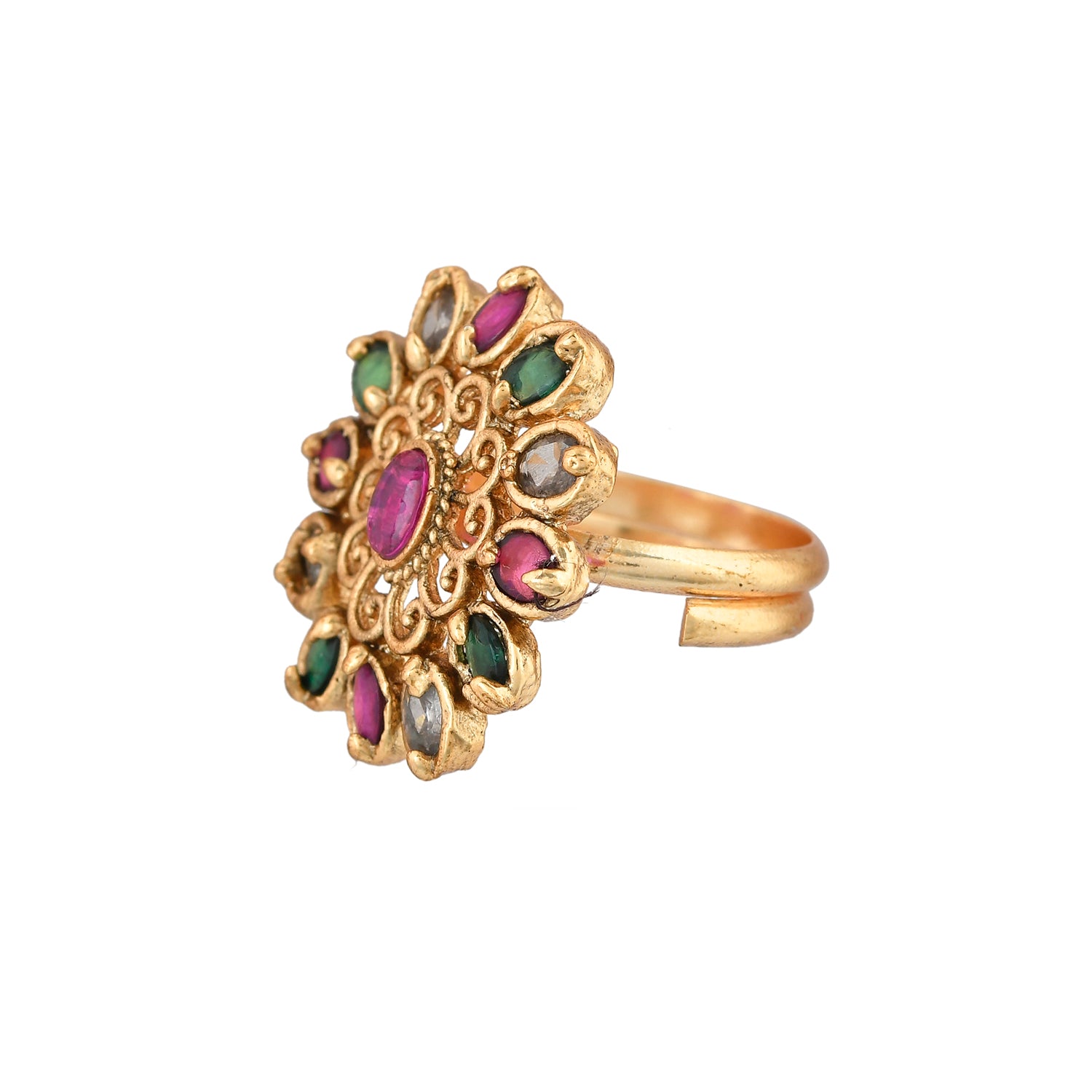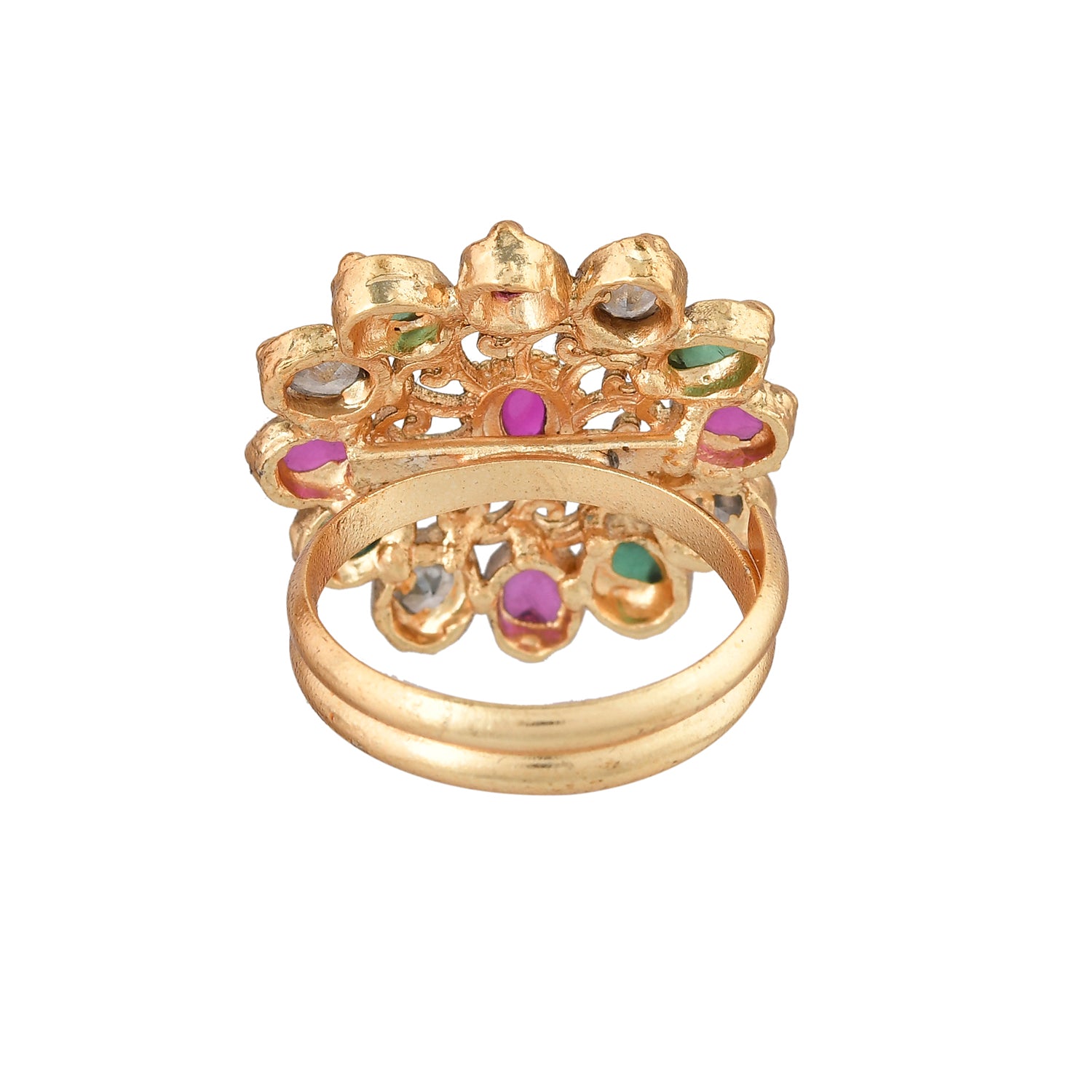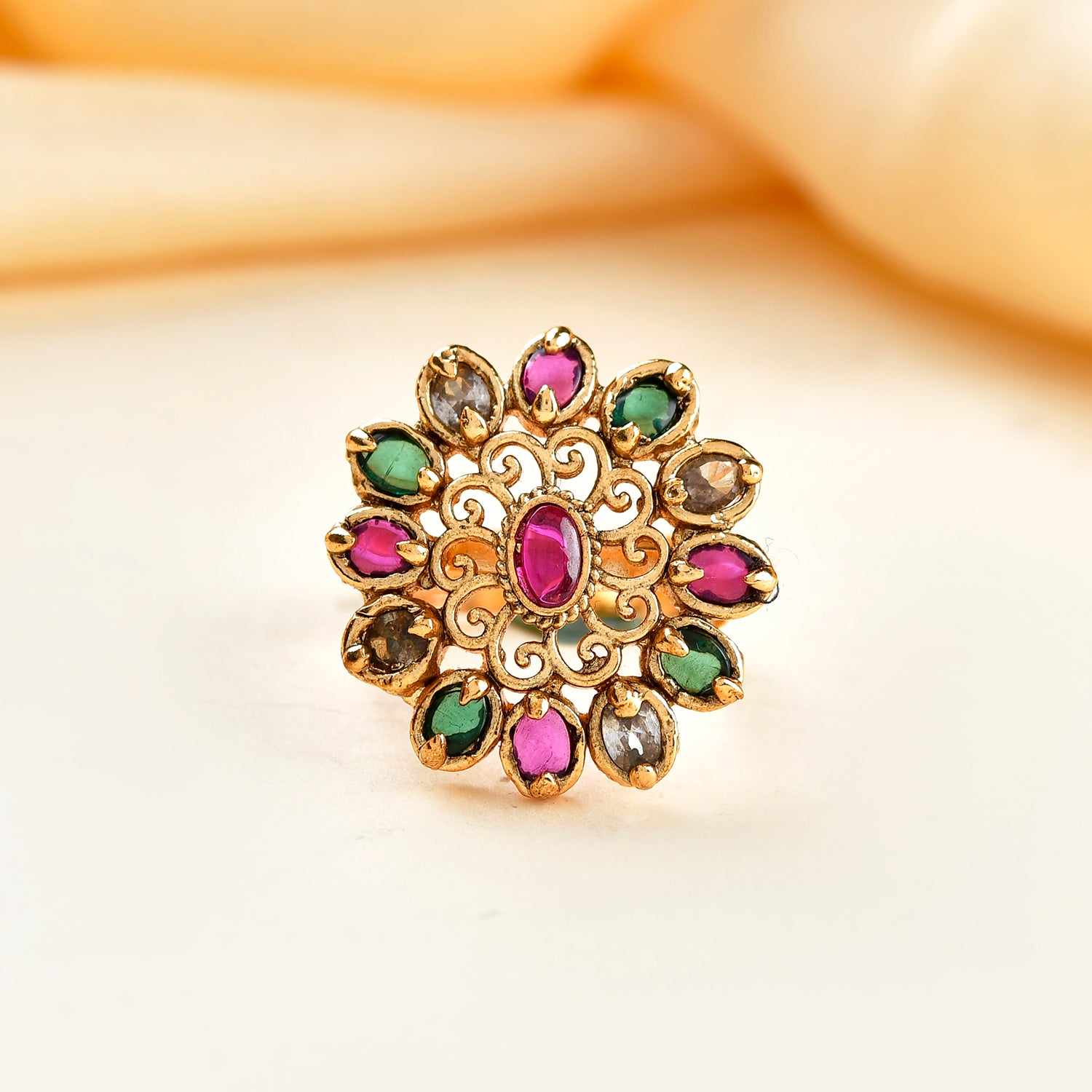 The Kusuma Temple Ring is a stunning piece of jewelry that embodies the essence of traditional Indian craftsmanship. This exquisite ring features a central oval-shaped pink stone surrounded by an intricate design of alternating green and smoky grey stones, all set in a gold-plated alloy. The detailed filigree work adds a touch of elegance and sophistication, making it a perfect addition to the Gold Opulence collection. Ideal for festive occasions, weddings, and pooja ceremonies, this ethnic ring is a statement piece that complements both traditional and contemporary outfits. The vibrant colors and royal design make it an excellent gift for women on special occasions such as Valentine's Day, Diwali, Rakshabandhan, Christmas, and New Year. Whether for a girlfriend, wife, mother, or sister, this ring is sure to be cherished and admired.