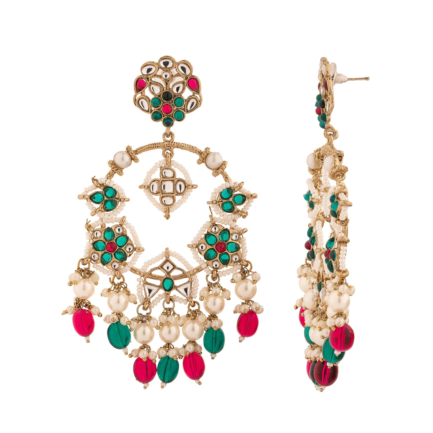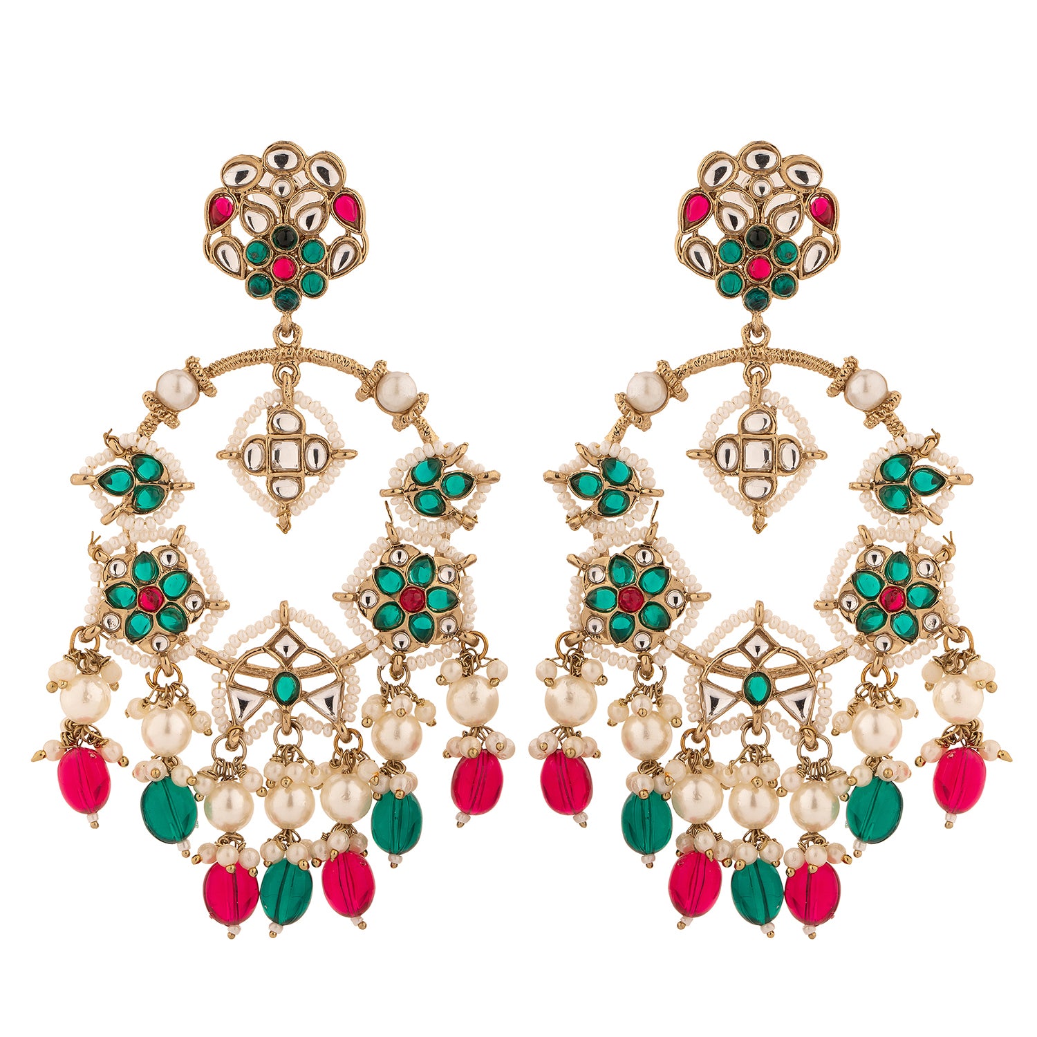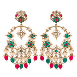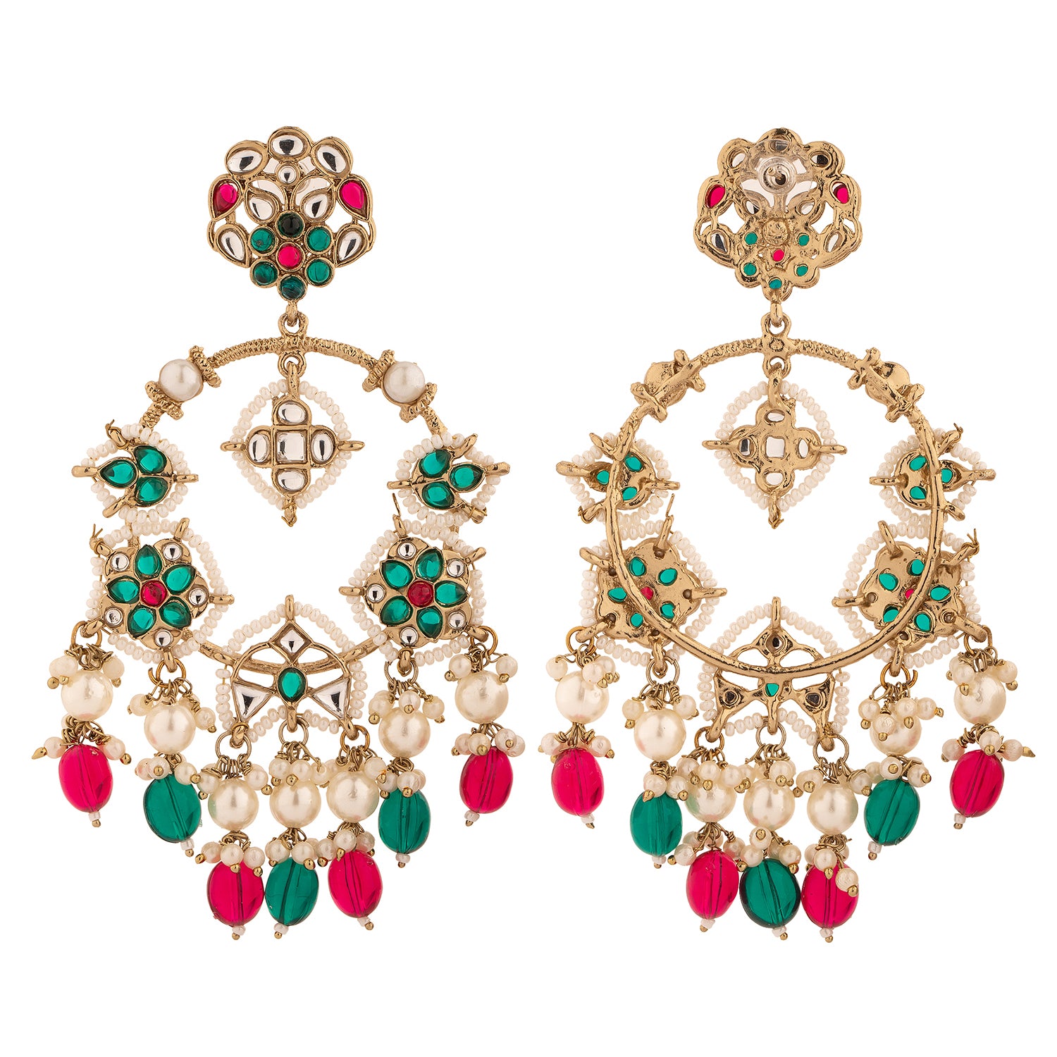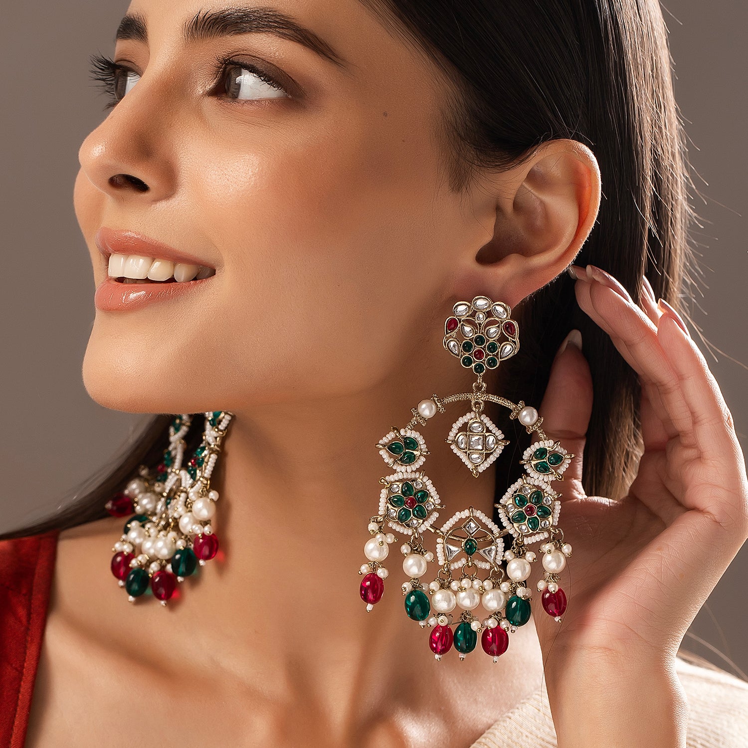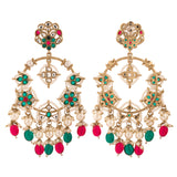 Gold Opulence Rangrez Pearl Chaandbali Earrings – a breathtaking fusion of heritage and modern elegance, designed to captivate with its intricate craftsmanship and regal charm. These statement earrings for women are crafted from high-quality brass, lavishly plated in gold, ensuring a radiant finish that exudes timeless luxury. The elaborate chaandbali silhouette, adorned with lustrous pearls, shimmering American diamonds, and exquisite kundan detailing, evokes a majestic aura, making it an ideal choice for festive wear, wedding jewelry, and pooja adornments. The delicate interplay of gold and pearl accents reflects an opulent aesthetic that complements both traditional and contemporary attire. Whether you're dressing up for a cocktail party, a Diwali celebration, or Rakshabandhan, these earrings promise an elevated charm, adding a graceful touch to sarees, lehengas, or even fusion ensembles. A quintessential gift for women, perfect for a girlfriend, wife, mother, or sister, making celebrations like Christmas, New Year, and Valentine's Day even more special. Their lightweight yet sturdy construction ensures day-long comfort, making them ideal for everyday earrings as well as chic statement jewelry for special occasions. Elevate your style quotient effortlessly with these Indian jewelry masterpieces, merging tradition with modern sophistication.