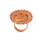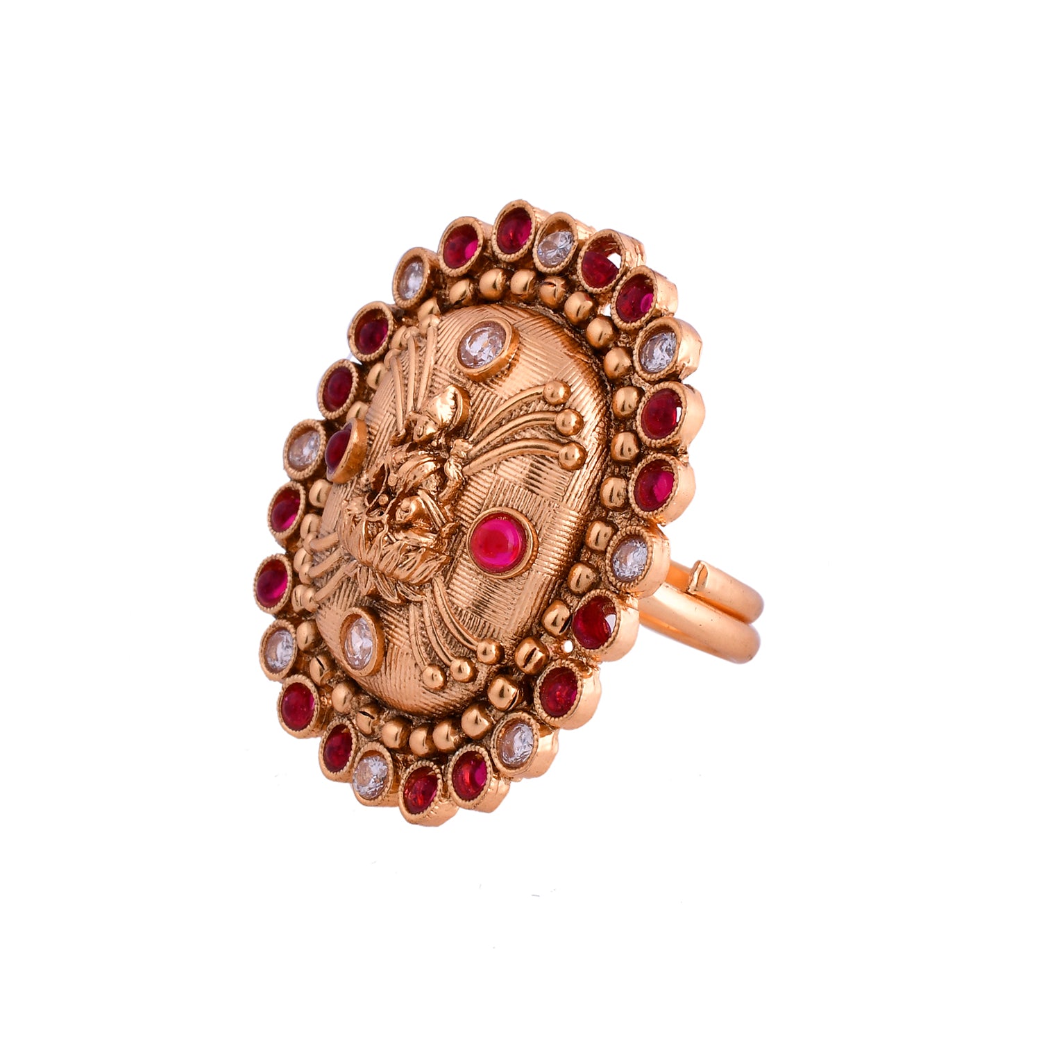 The Voylla Sri Mahalakshmi Mudrika Temple Ring is a stunning piece of jewelry that embodies the essence of traditional Indian craftsmanship. Made from high-quality alloy and plated with gold, this ring features an intricate design of Goddess Mahalakshmi seated on a lotus, surrounded by a halo of sparkling kundan stones in vibrant red and clear hues. Part of the Gold Opulence collection, this statement ring is perfect for festive occasions, weddings, and pooja ceremonies, adding a touch of elegance and royalty to any outfit. The rich gold color and detailed craftsmanship make it an ideal gift for women, whether for Valentine's Day, Diwali, Rakshabandhan, or Christmas. Pair it with ethnic wear for a complete look or use it as a standout piece with contemporary outfits. This ring is not just a piece of jewelry but a symbol of divine grace and opulence, making it a cherished addition to any collection.