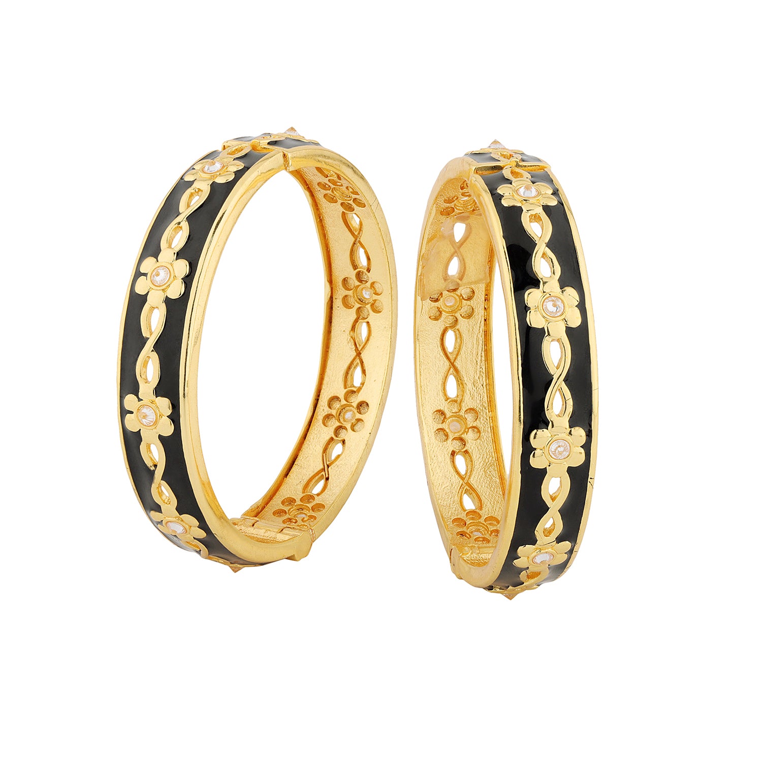 The Gota Patti Maharani Kala Gul Bangles are a celebration of regal charm and timeless craftsmanship. Made from durable brass, these ethnic enamel bangles feature a striking black enamel base beautifully adorned with delicate golden floral motifs and sparkling reverse AD stones. The sleek yet ornate design makes them a perfect pair of festive jewellery bangles that can easily transition from traditional wedding wear to elegant festive styling.The contrast of deep black enamel with golden detailing evokes the grandeur of Rajasthan’s royal courts, making these bangles an essential addition to your ethnic jewellery collection. Whether you’re the bride, her sister, or simply love collecting stylish bangles that stand out, these pieces are designed to complement lehengas, sarees, and even chic Indo-western looks. They are not just accessories but statement bangles that speak of heritage and elegance, while also being versatile enough for pujas, festive occasions, and weddings. Gift them as a thoughtful jewellery gift for women, or style them yourself for occasions where you want to look effortlessly royal.