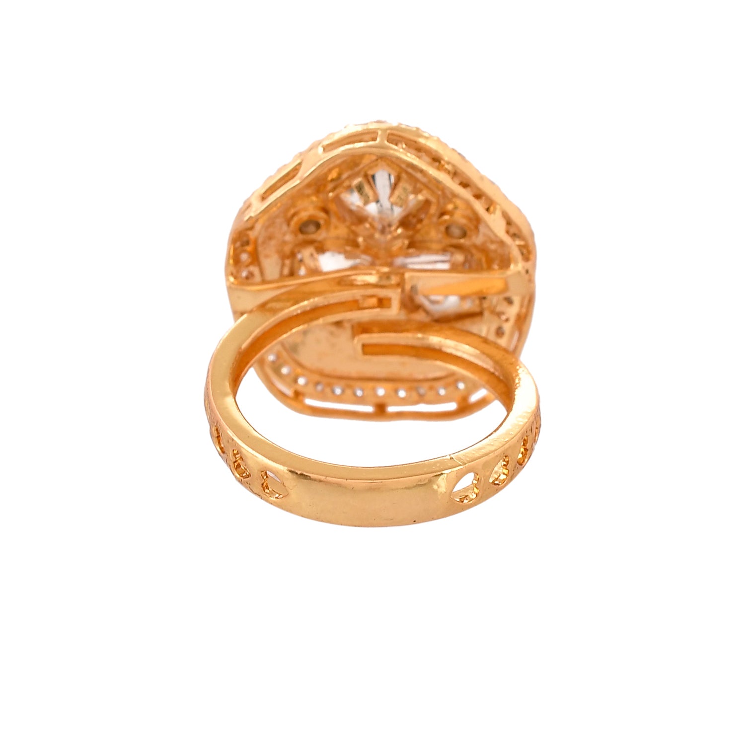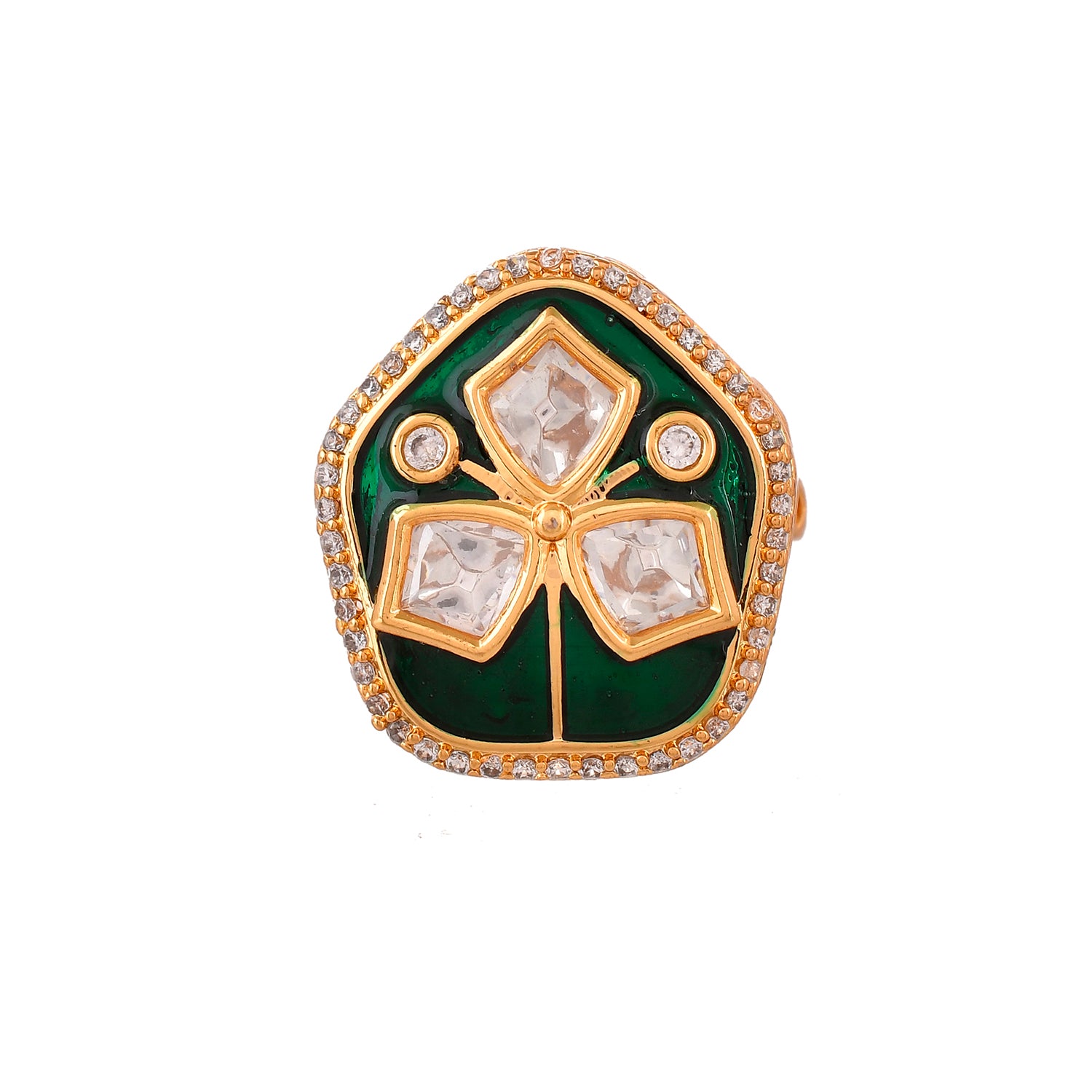 The Meena Glow Ring from the Kundan Elegance collection is a true masterpiece crafted from high-quality brass and plated with gold for a lustrous finish. This stunning Ethnic Ring features three vibrant Kundan stones meticulously set in a floral pattern, complemented by intricate green enamel work and sparkling stones adorning the edges. Ideal for festive occasions, weddings, or as a statement piece, this ring is versatile enough to enhance both traditional Indian attire and contemporary outfits. Perfect for gifting on special occasions like Diwali, Rakshabandhan, Valentine's Day, or Christmas, this elegant piece is sure to delight women of all ages, making it a cherished gift for mothers, wives, girlfriends, sisters, and more. The Meena Glow Ring is not just a piece of jewelry; it embodies elegance, tradition, and timeless beauty.