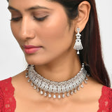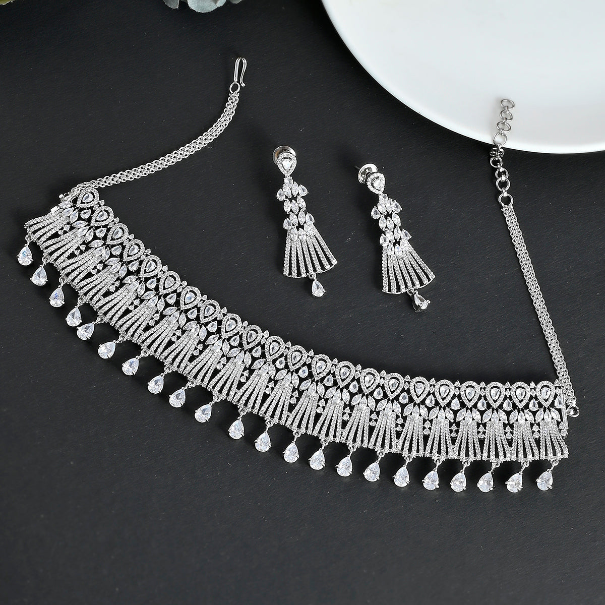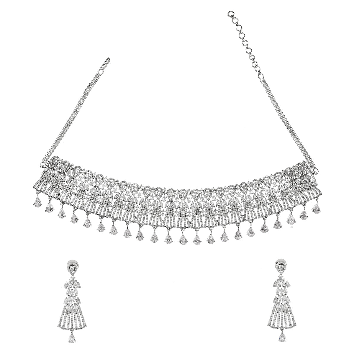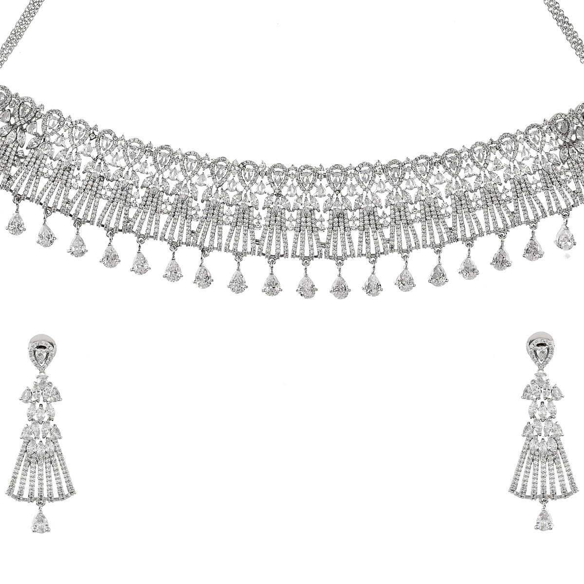 Brass has been used in the making of this jewellery set, which features a classic cutwork design. The necklace and earrings have been given silver plating and heavily embellished with zirconia gemstones. Pair with a designer saree.