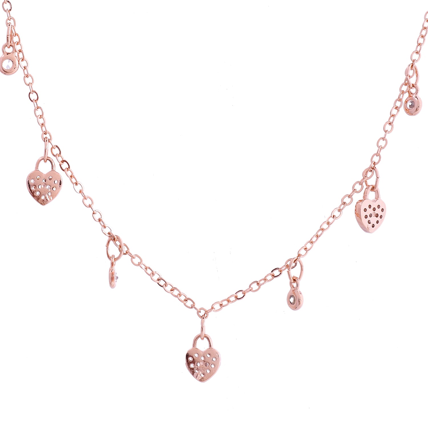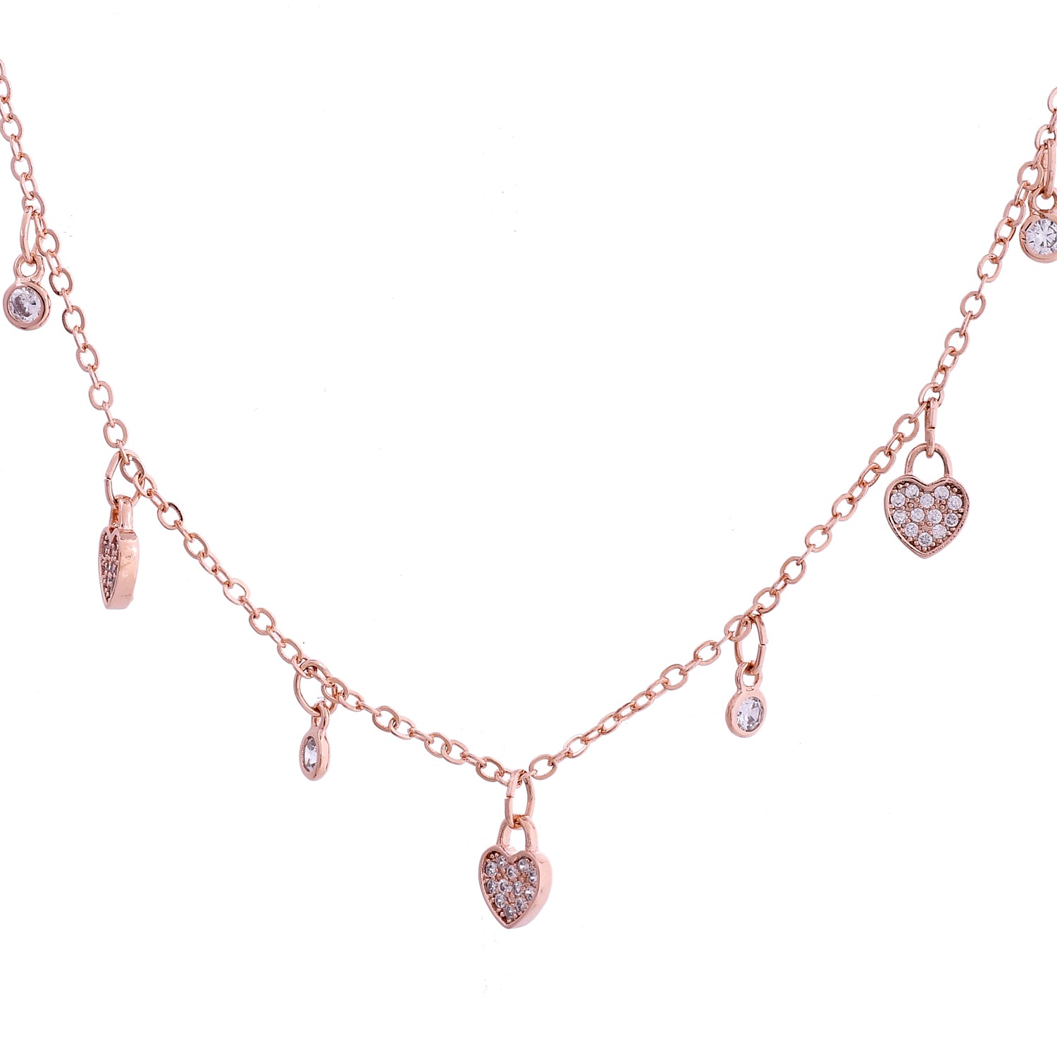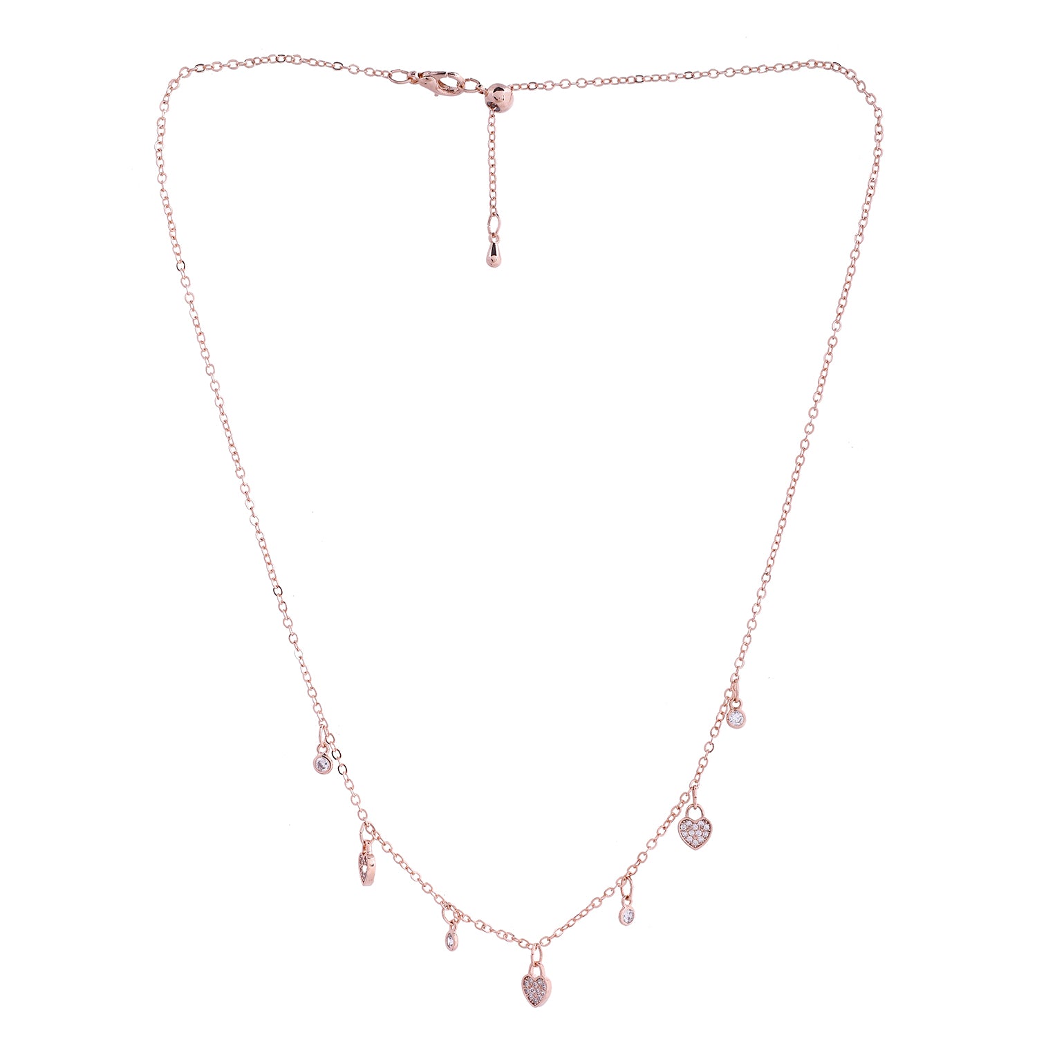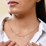 The Heart of Joy Charm Necklace from the Sparkling Elegance collection is a testament to sophisticated design and high-quality craftsmanship. Made from durable stainless steel and plated in luxurious rose gold, this necklace features a delicate chain adorned with charming heart-shaped pendants. Each heart is intricately set with sparkling American diamonds, adding a touch of elegance and glamour. This versatile piece is perfect for everyday wear or special occasions, easily complementing both casual and formal outfits. Ideal for gifting, it’s a thoughtful choice for Valentine's Day, Diwali, Rakshabandhan, Christmas, or any other celebration. The Heart of Joy Charm Necklace is more than just a piece of jewelry; it’s a symbol of love and joy, making it an essential addition to any collection.
