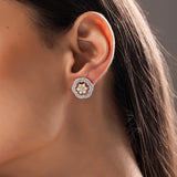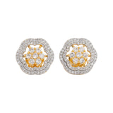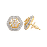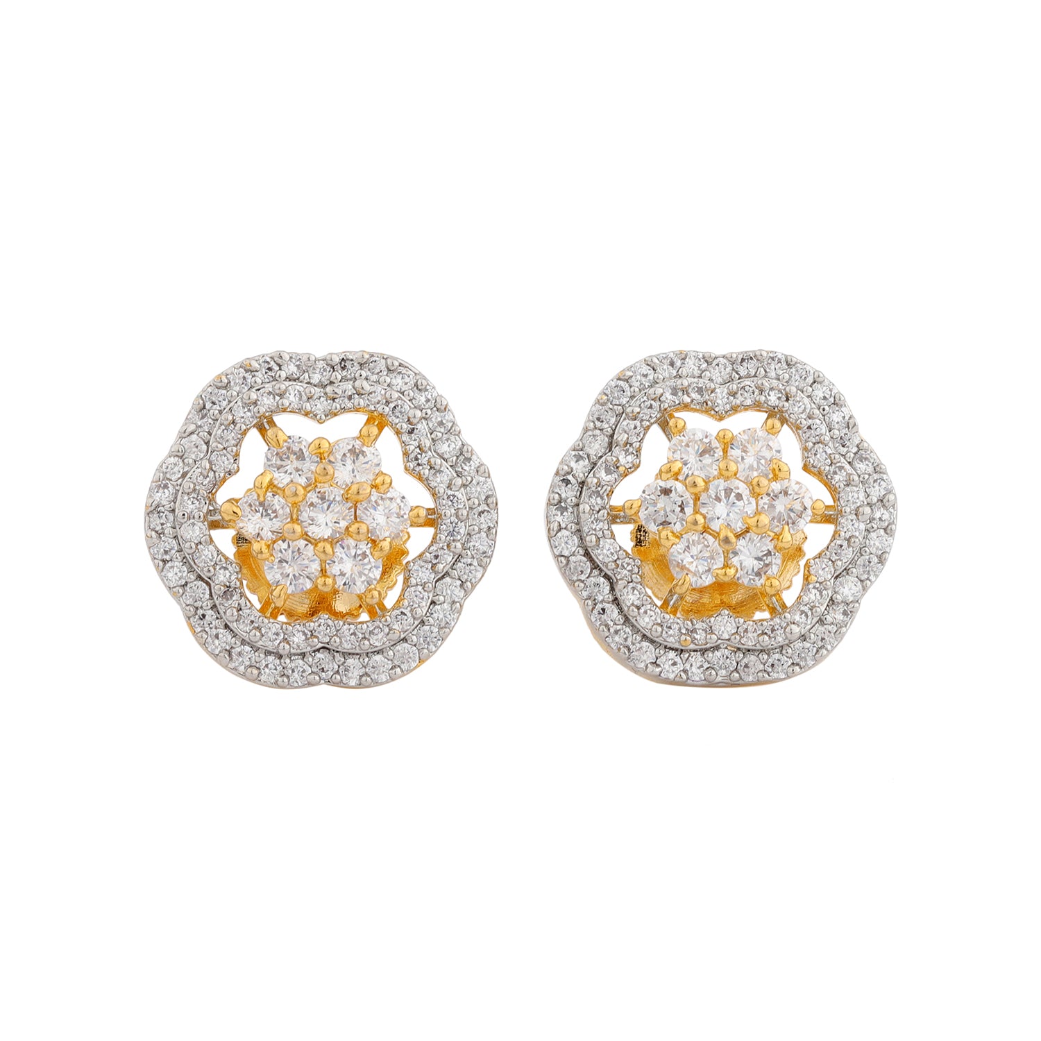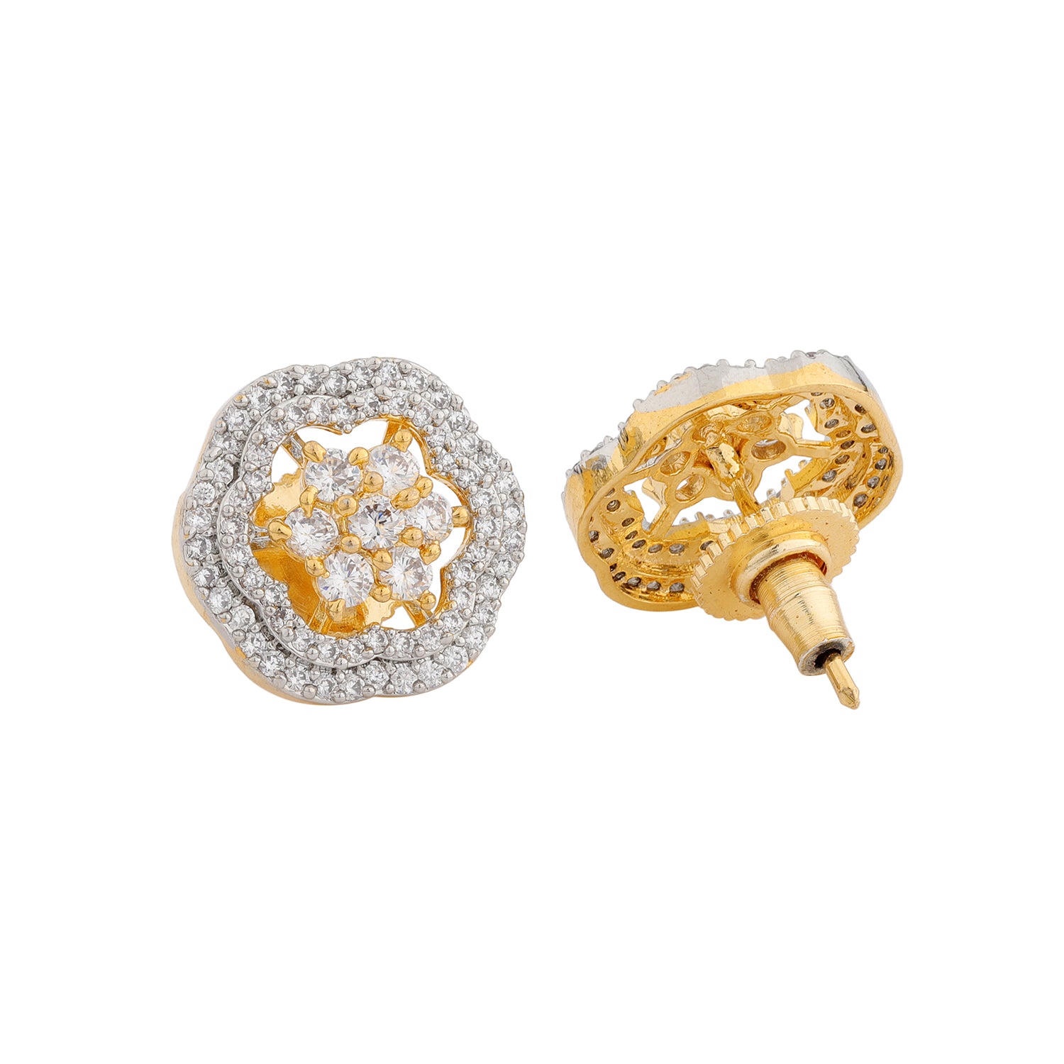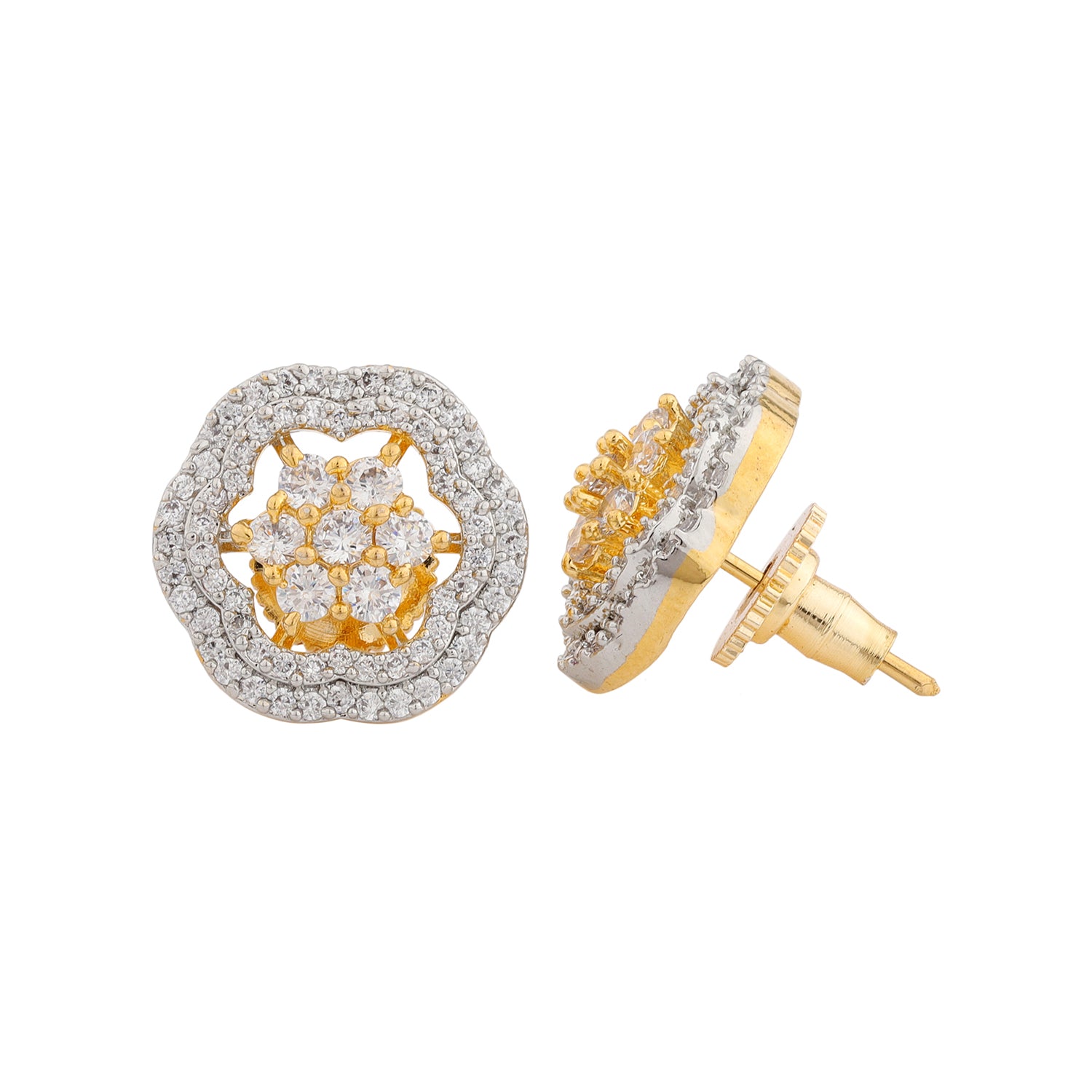 Add a touch of brilliance to your ensemble with these exquisitely designed American Diamond stud earrings, crafted in premium brass with a dual-tone plating of gold and white rhodium. The intricate floral-inspired design features dazzling AAA-quality American Diamonds, arranged to reflect maximum brilliance. The unique halo effect enhances their charm, making them a perfect statement piece for any outfit. Whether you're looking for chic everyday earrings, elegant office jewelry, or stylish party earrings, these versatile studs fit the bill. Their timeless charm makes them a great Raksha Bandhan gift for sisters, a romantic Valentine’s Day present, or a thoughtful Diwali or Christmas gift. Elevate your Western wear, festive ensembles, or even casual outfits with this sparkling elegance.