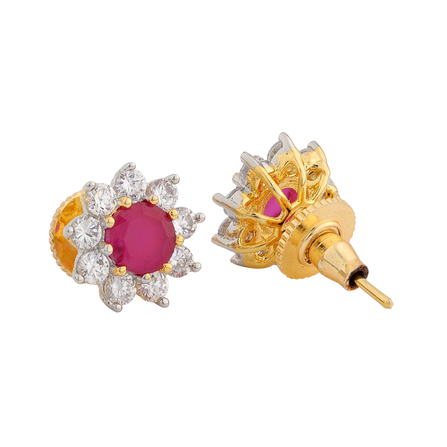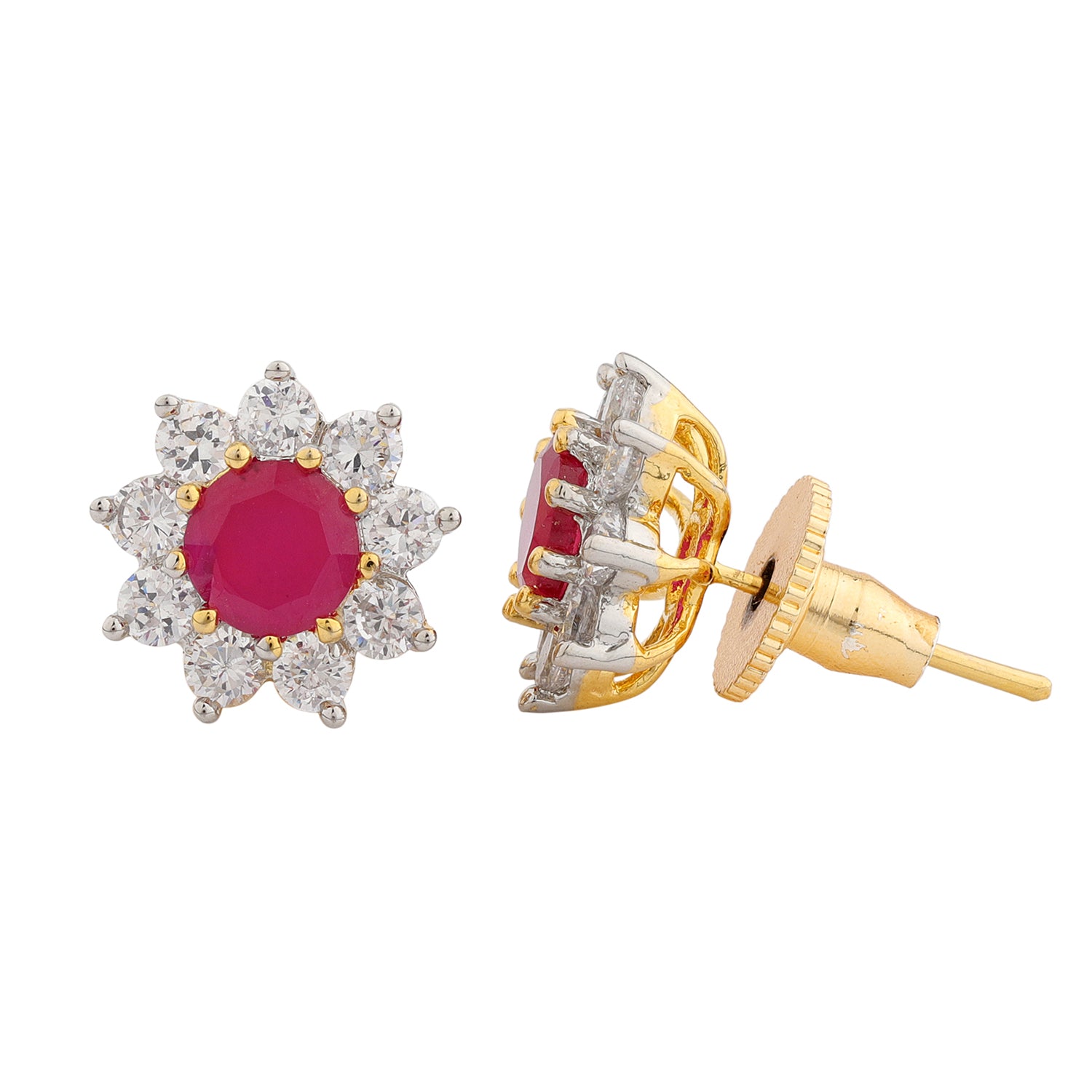 Add a touch of timeless glamour to your look with these Sparkling Scarlet Radiance Stud Earrings, designed to make you shine on every occasion! Crafted from high-quality brass and finished with a white rhodium plating, these exquisite studs feature a dazzling red American diamond at the center, symbolizing passion and bold elegance. The halo of clear shimmering stones around the vibrant red gem creates a stunning floral-inspired design, perfect for weddings, festive celebrations, or even everyday wear. Whether you're pairing them with an elegant saree, a sleek gown, or your favorite office ensemble, these earrings will elevate your style effortlessly. The lightweight yet luxurious design makes them a thoughtful gift for women, ideal for Valentine’s Day, Raksha Bandhan, Diwali, Christmas, and special occasions. If you're looking for a chic, travel-friendly, and versatile piece to add to your collection, these statement earrings are your perfect match!