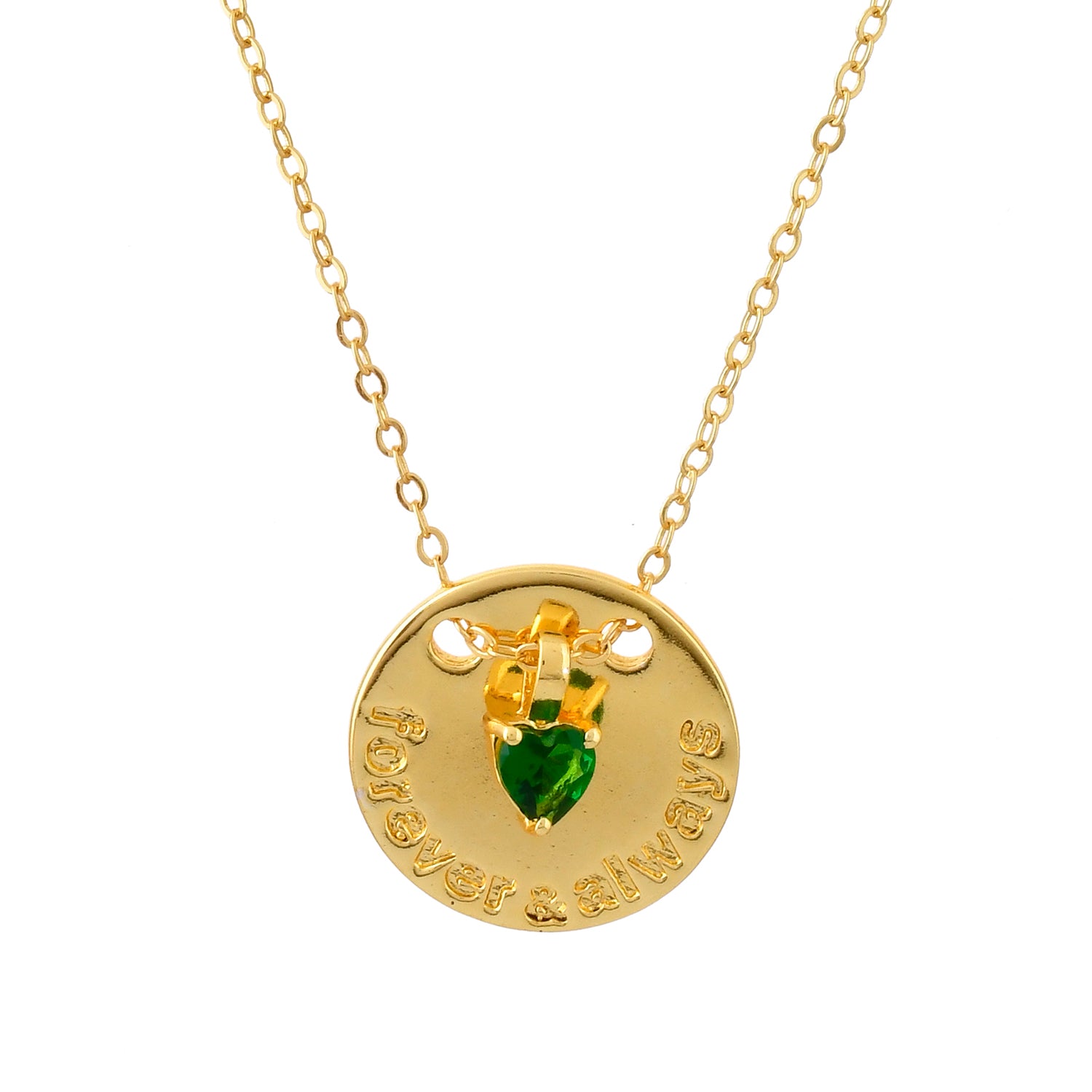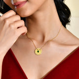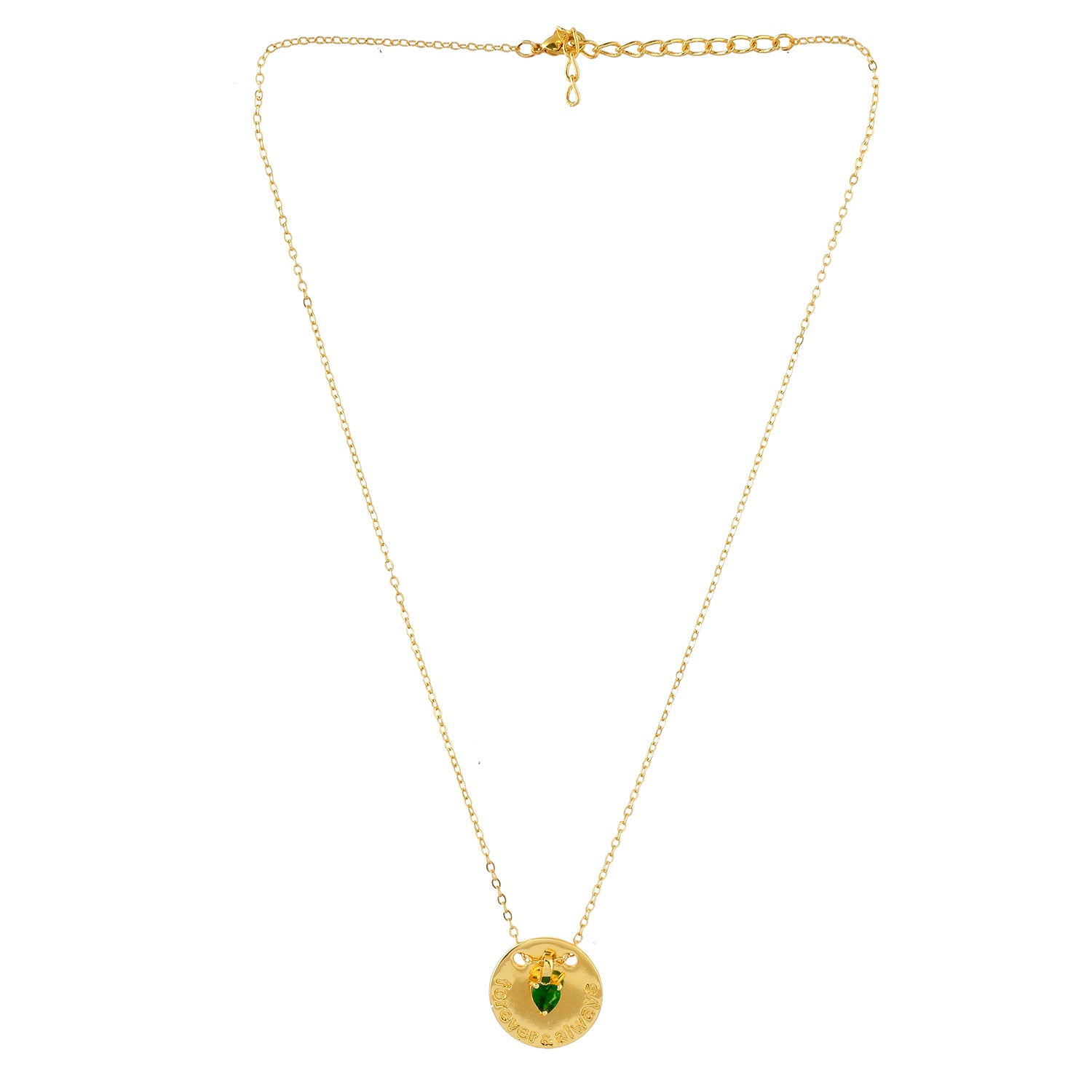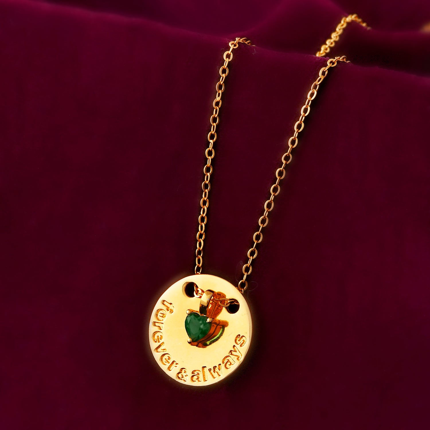 The Valentine's Day Forever & Always Pendant Necklace is a stunning piece crafted from high-quality brass with a luxurious gold plating, making it a perfect addition to the Valentine's Collection. The pendant features a beautifully designed green cubic zirconia stone set in the center, symbolizing everlasting love. The intricate design includes the words "forever & always" engraved around the stone, adding a sentimental touch. This women's pendant necklace is ideal for gifting on special occasions such as Valentine's Day, weddings, festivals like Diwali and Rakshabandhan, and other celebrations. It pairs elegantly with both casual and formal attire, making it versatile for party wear, festive occasions, and cocktail events. The rich gold color complements a variety of outfits, enhancing the wearer's style and elegance. This pendant necklace is a thoughtful gift for women, including sisters, girlfriends, wives, mothers, and lovers, making it a cherished keepsake for any woman in your life.