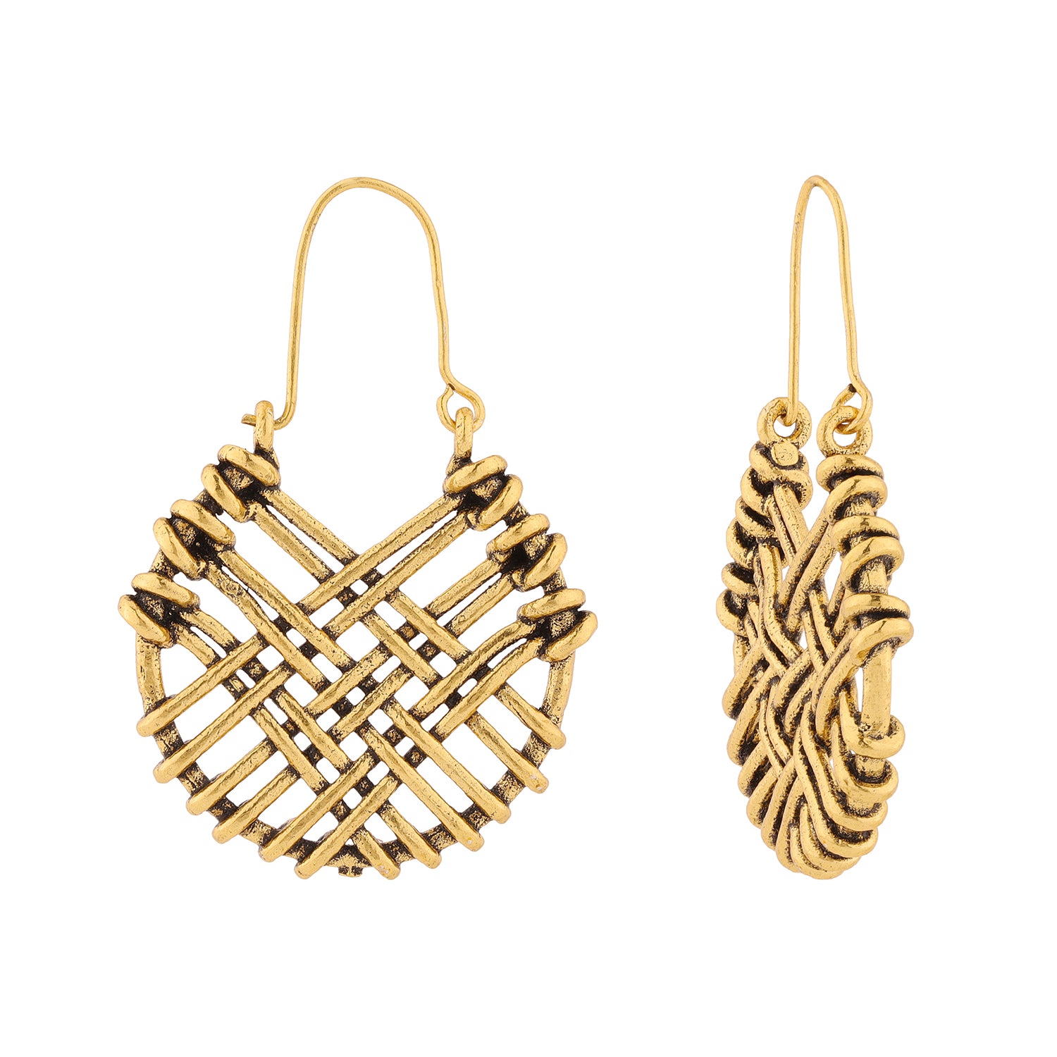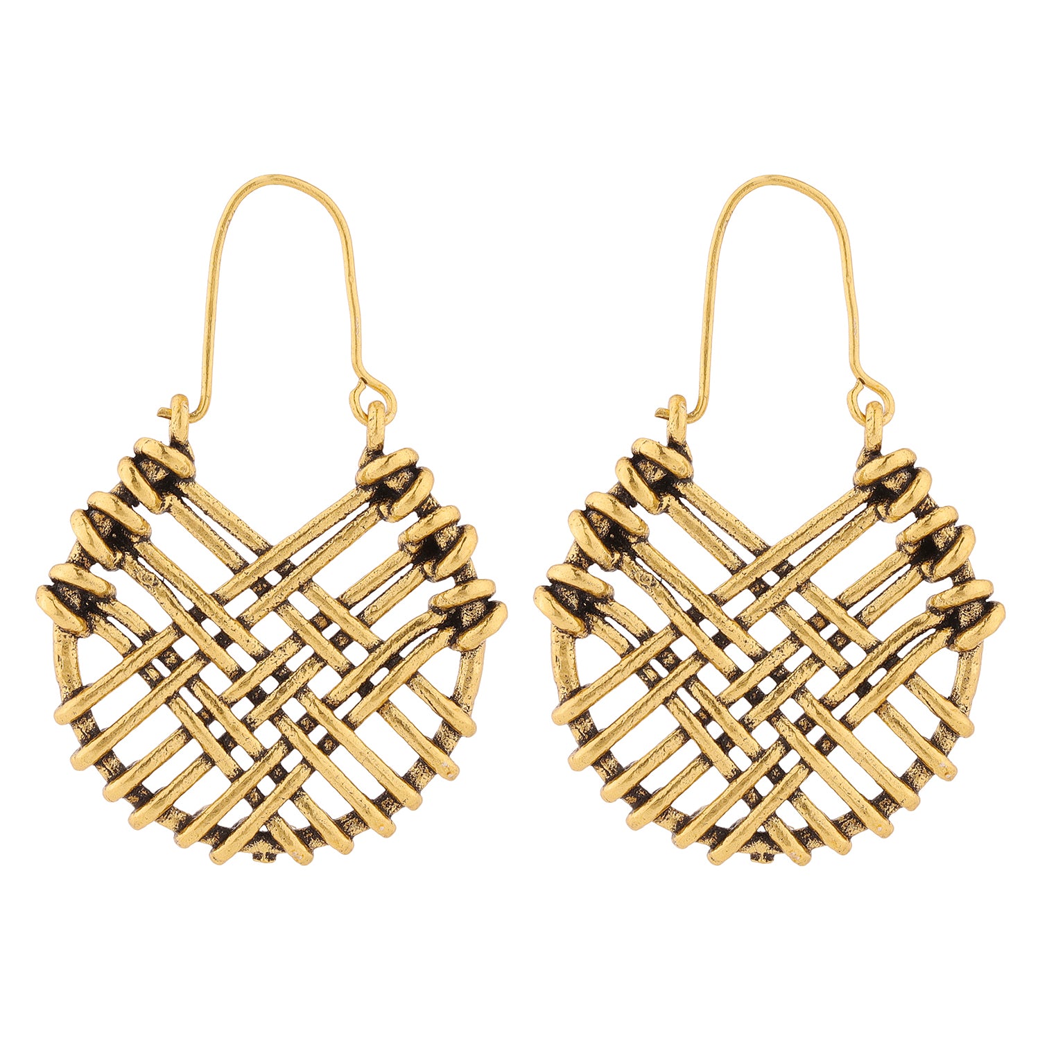 Introducing the Woven Wonder Interlinked Dangler Earrings, a perfect blend of intricate design and unparalleled craftsmanship. Made from high-quality brass and featuring an elegant gold oxidized plating, these earrings are a stunning addition to the Woven Wonder collection. The exquisite interlinked design draws inspiration from traditional basket weaving, showcasing the beauty of natural patterns and artful construction. These versatile earrings can elevate any look, whether paired with casual outfits, vacation wear, or office attire. Their gold oxidized finish adds a chic, boho touch that is sure to turn heads. Ideal as a gift for women on special occasions like Valentine's Day, Diwali, Rakshabandhan, Christmas, and New Year, these statement earrings are perfect for sisters, girlfriends, wives, mothers, or friends. Embrace the timeless elegance and sophistication of these handcrafted earrings, making every moment memorable.