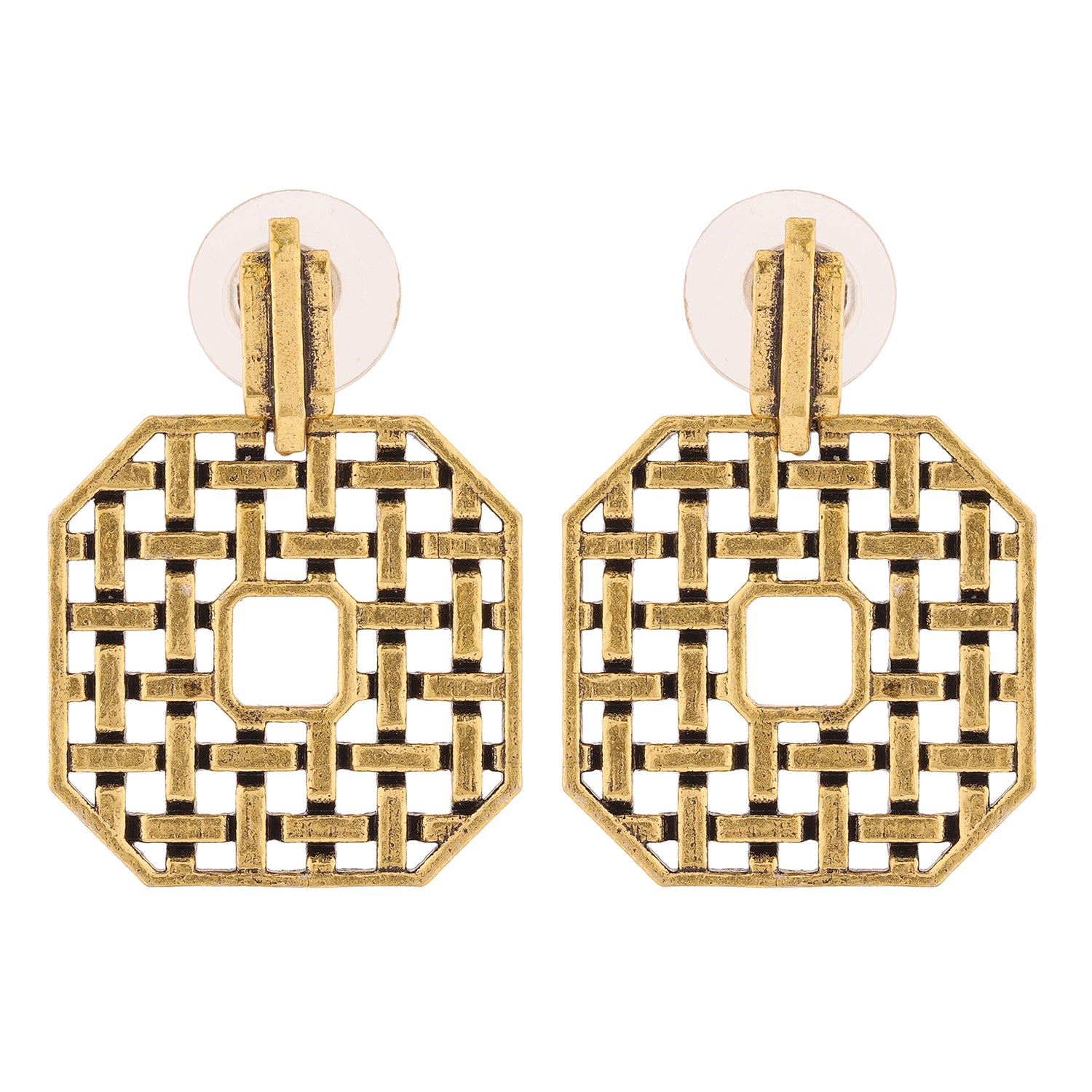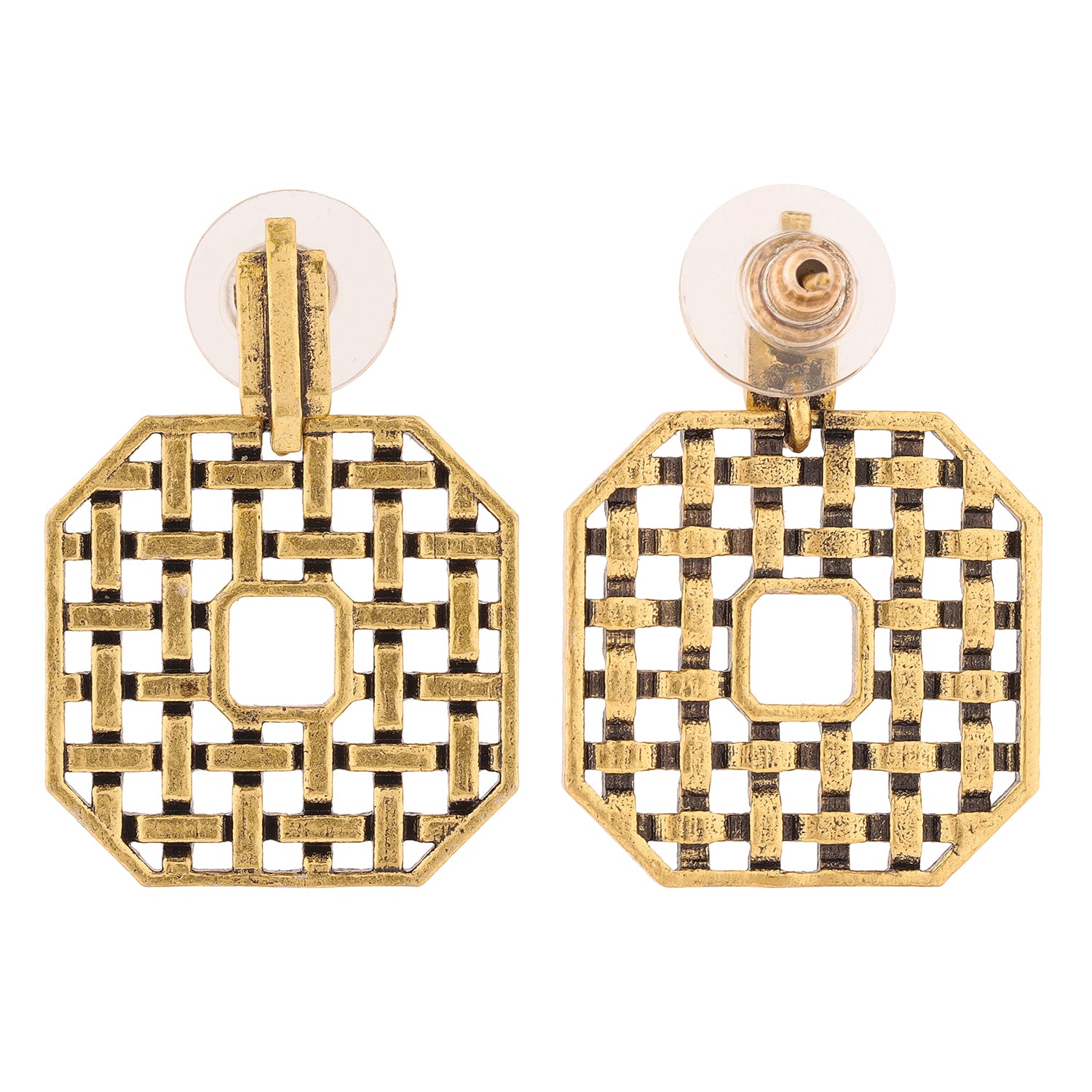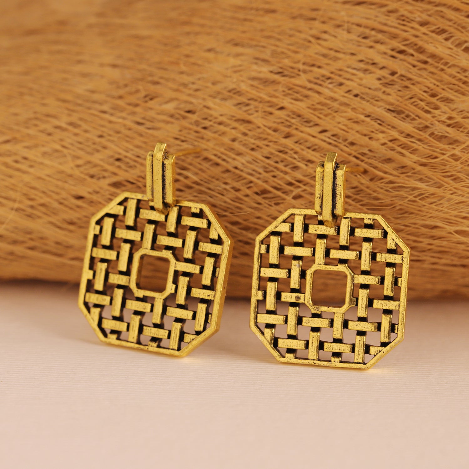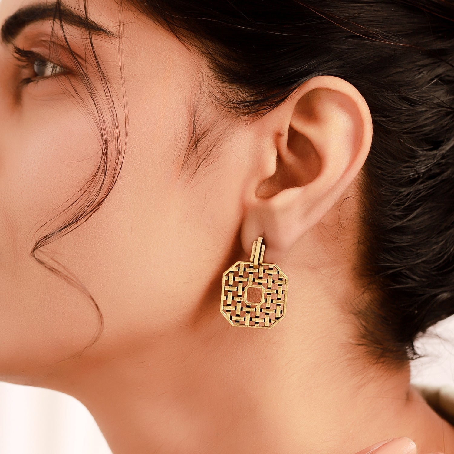 Introducing the Woven Wonder Plain Weaving Dangler Earrings, a stunning addition to any jewelry collection. These earrings are crafted from high-quality brass and feature a beautiful gold oxidized plating, giving them a chic and timeless appeal. The intricate woven design is inspired by traditional basket weaving, showcasing the artistry and craftsmanship involved in creating each piece. Perfect for everyday wear, vacation wear, or as a statement accessory for special occasions, these earrings add a touch of elegance to any outfit. The versatile design makes them an ideal gift for women, whether for Valentine's Day, Diwali, Rakshabandhan, Christmas, or any other special occasion. Pair them with casual or office attire for a sophisticated look, or dress them up with boho-chic outfits for a more relaxed, stylish vibe. These earrings are not just a piece of jewelry but a celebration of the beauty of natural patterns and the artful construction of woven forms.