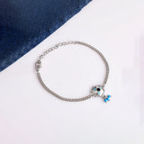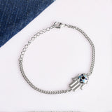 This exquisite gold-plated bracelet features a simple yet captivating design with an engraved evil eye in hand and a beautiful simple chain. The expert craftmanship attention to detail make it a truly remarkable piece that is both elegant and eye-catching.