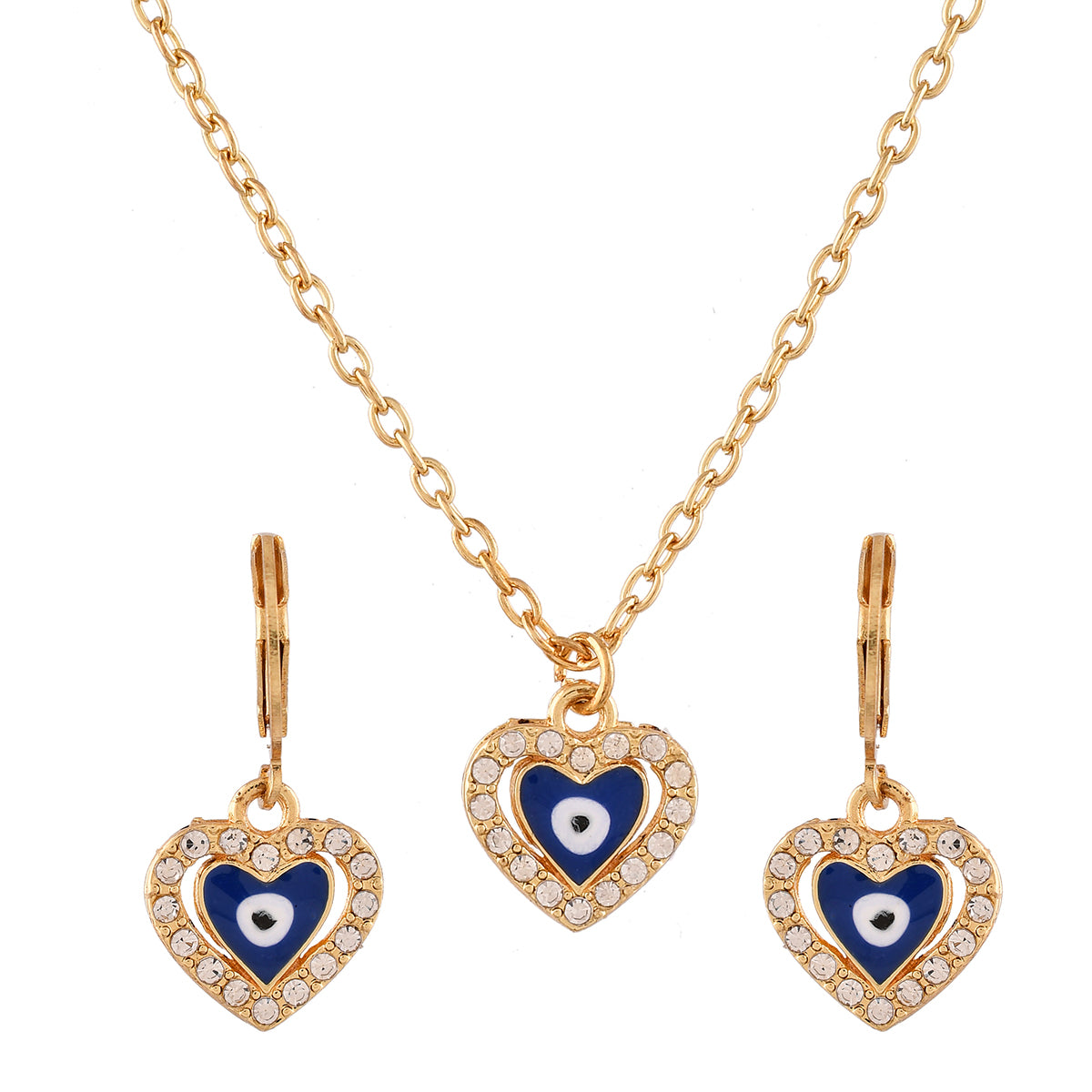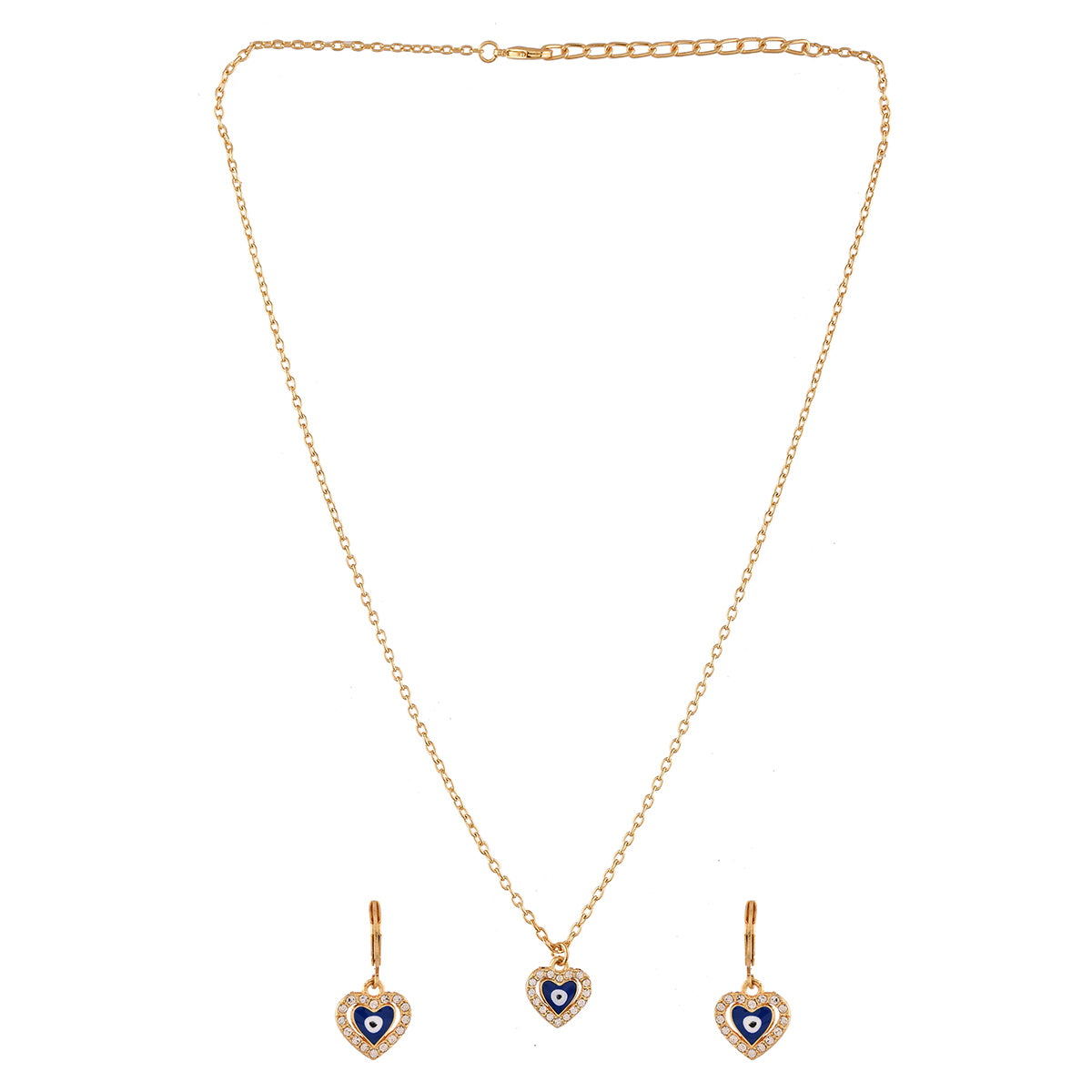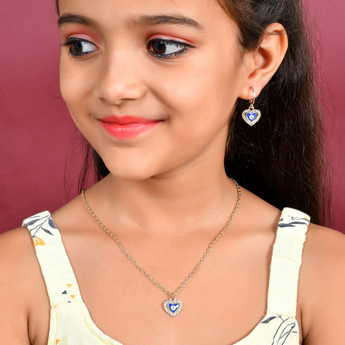 Elevate your little princess's style with our "Guardians of Love" pendant set with earrings, a remarkable addition to our Trendy Essentials collection, specially designed for young girls. This enchanting jewelry ensemble features a heart-shaped pendant and matching earrings, adorned with the protective and mystical Evil Eye motif, elegantly crafted in striking gold finish.