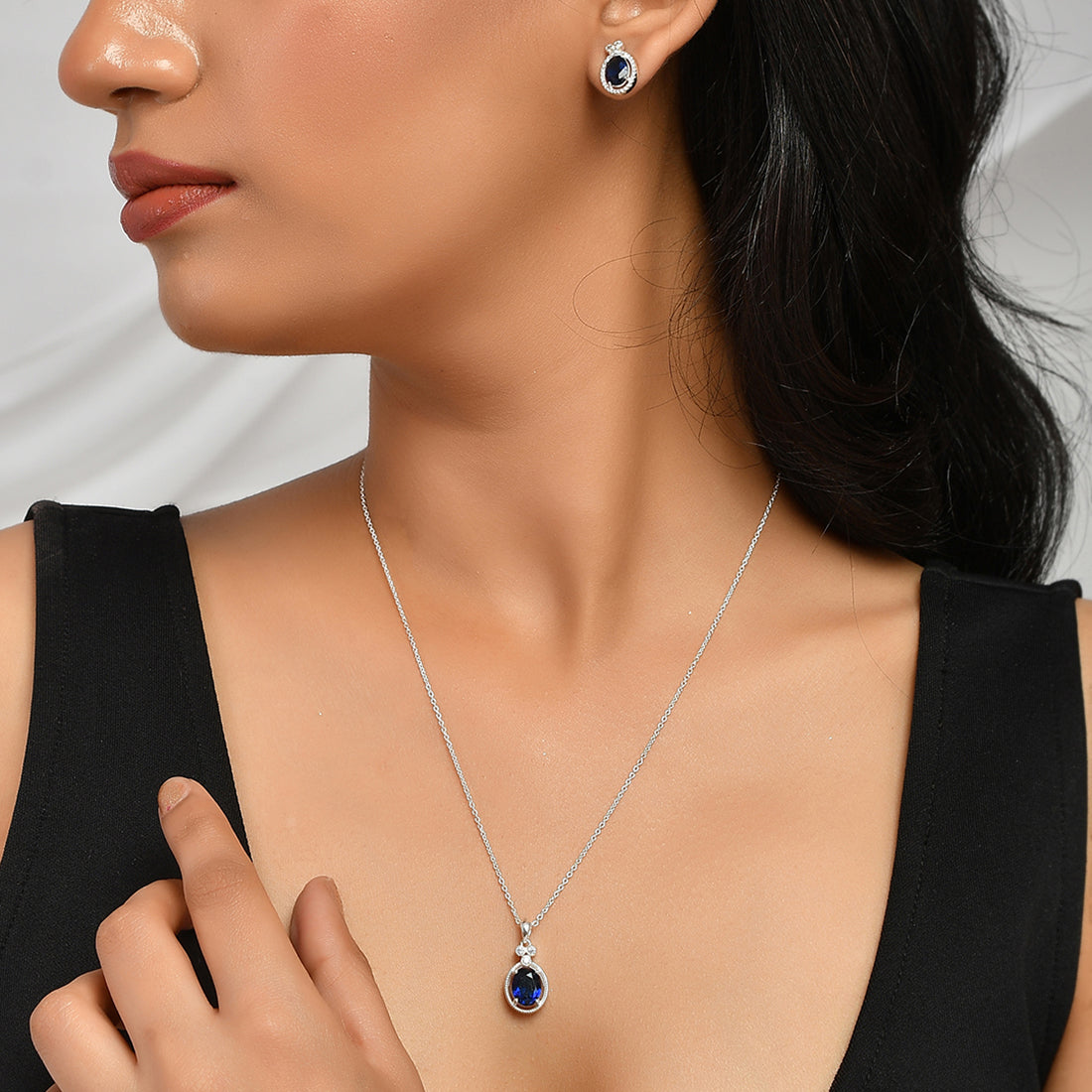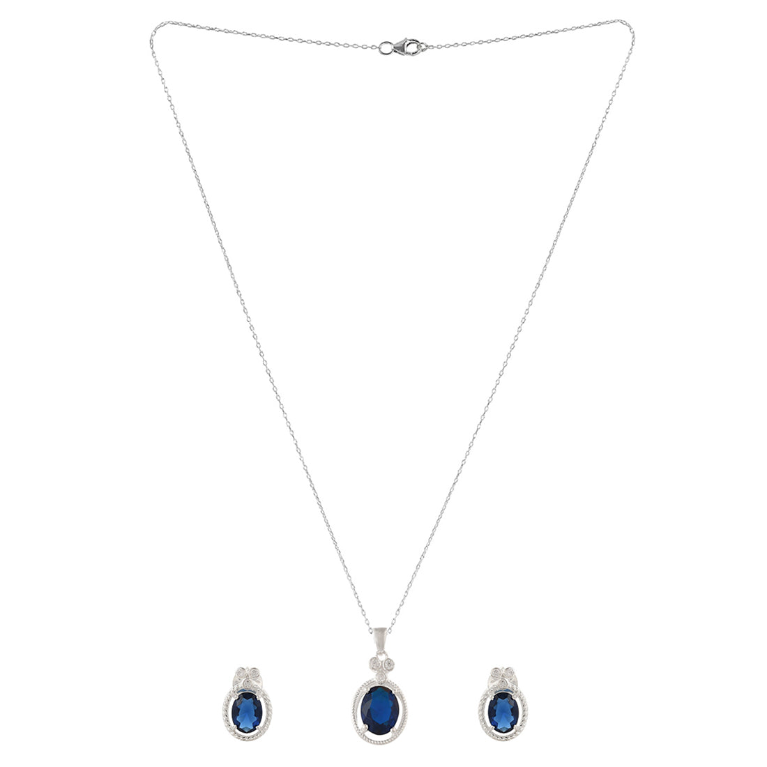 925 Sterling Silver Blue Oval Cut CZ Pendant Set