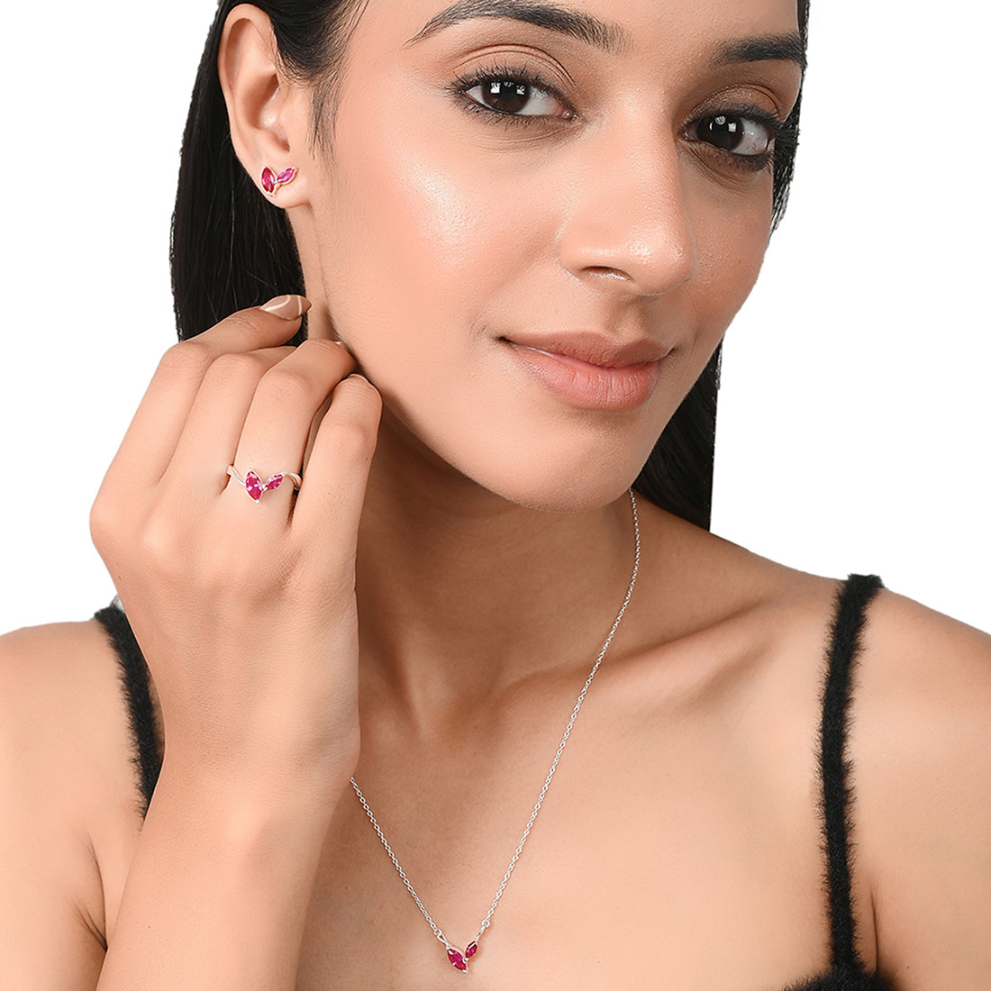 925 Sterling Silver Jewelry Box Set with Necklace, Earrings & Adjustable Ring