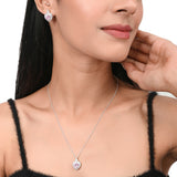 Look enticing with this enviable silver pendant featuring pink coloured stones on a dainty chain with matching earrings. This entrancing set is perfect for your formal wear.