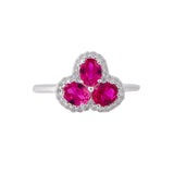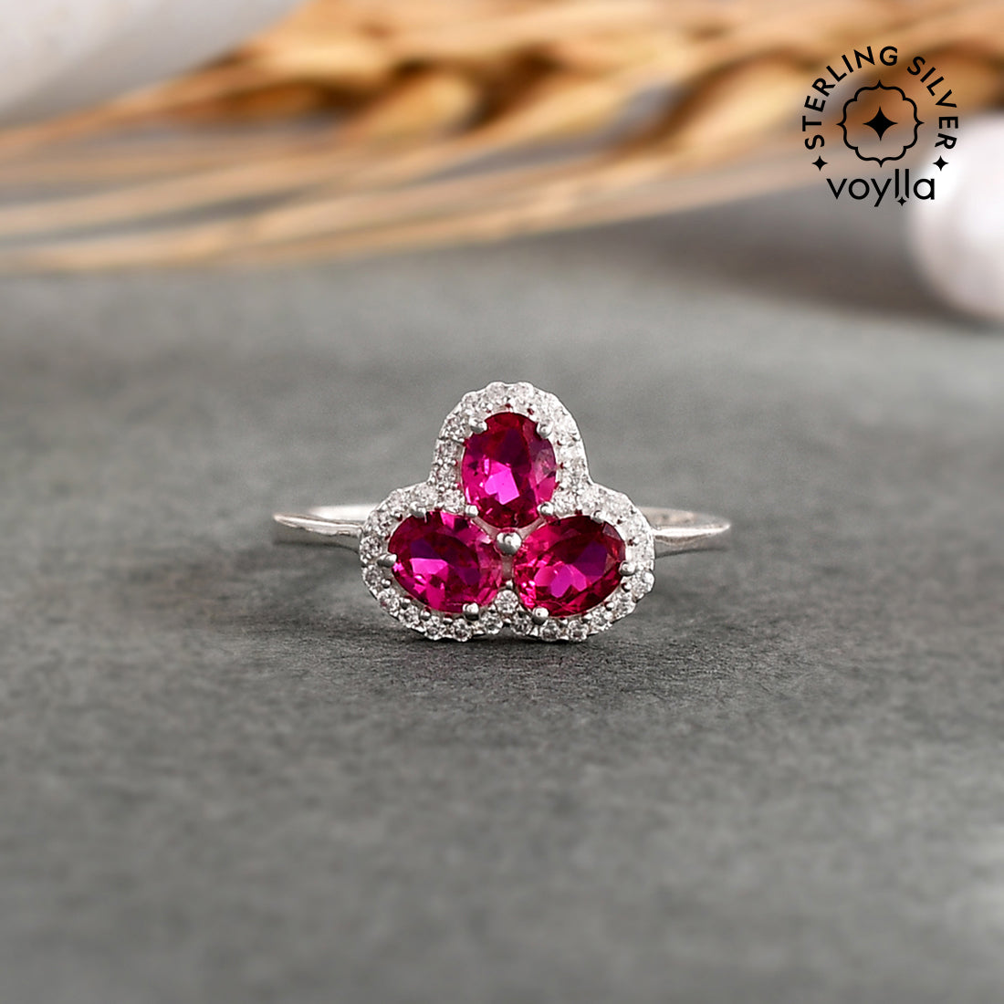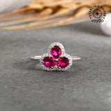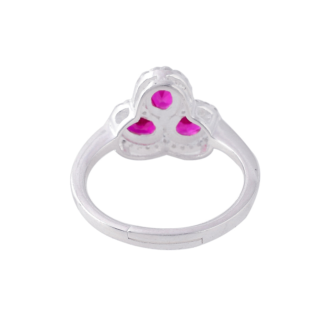 Floral motif ring, fashioned out of 925 sterling silver and white rhodium plated. Embellished with pink, oval cut CZ gemstones. Good for everyday wear.