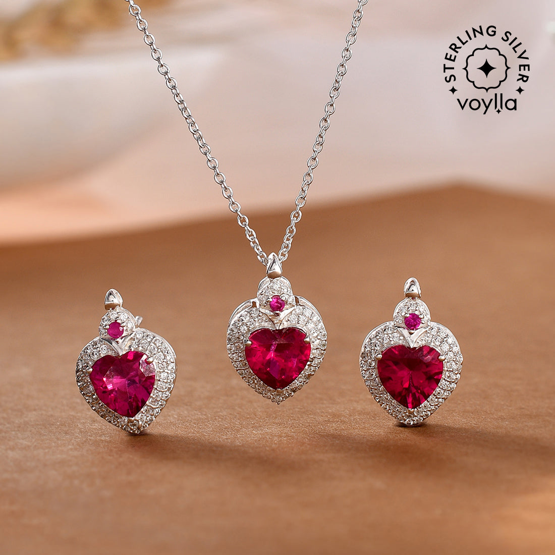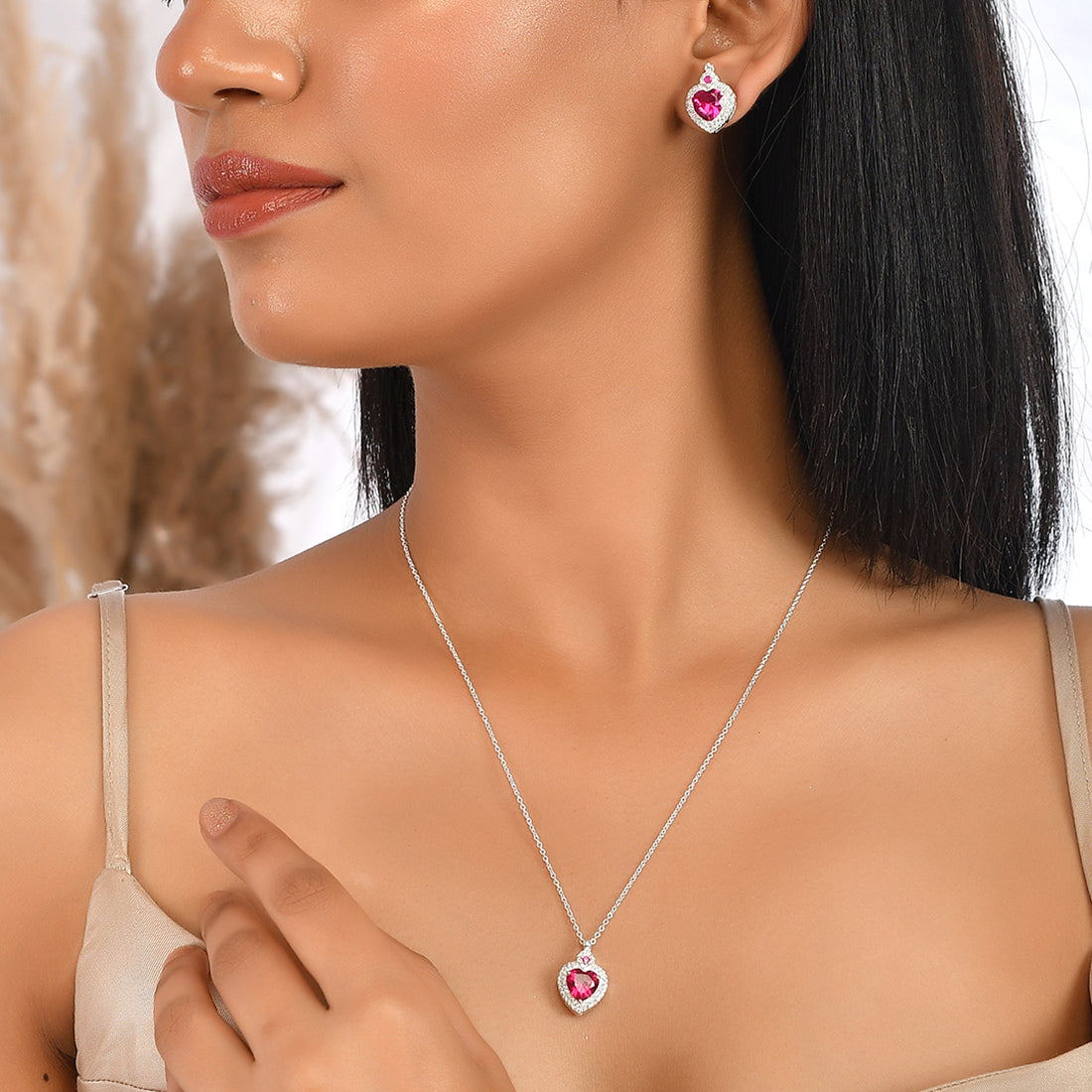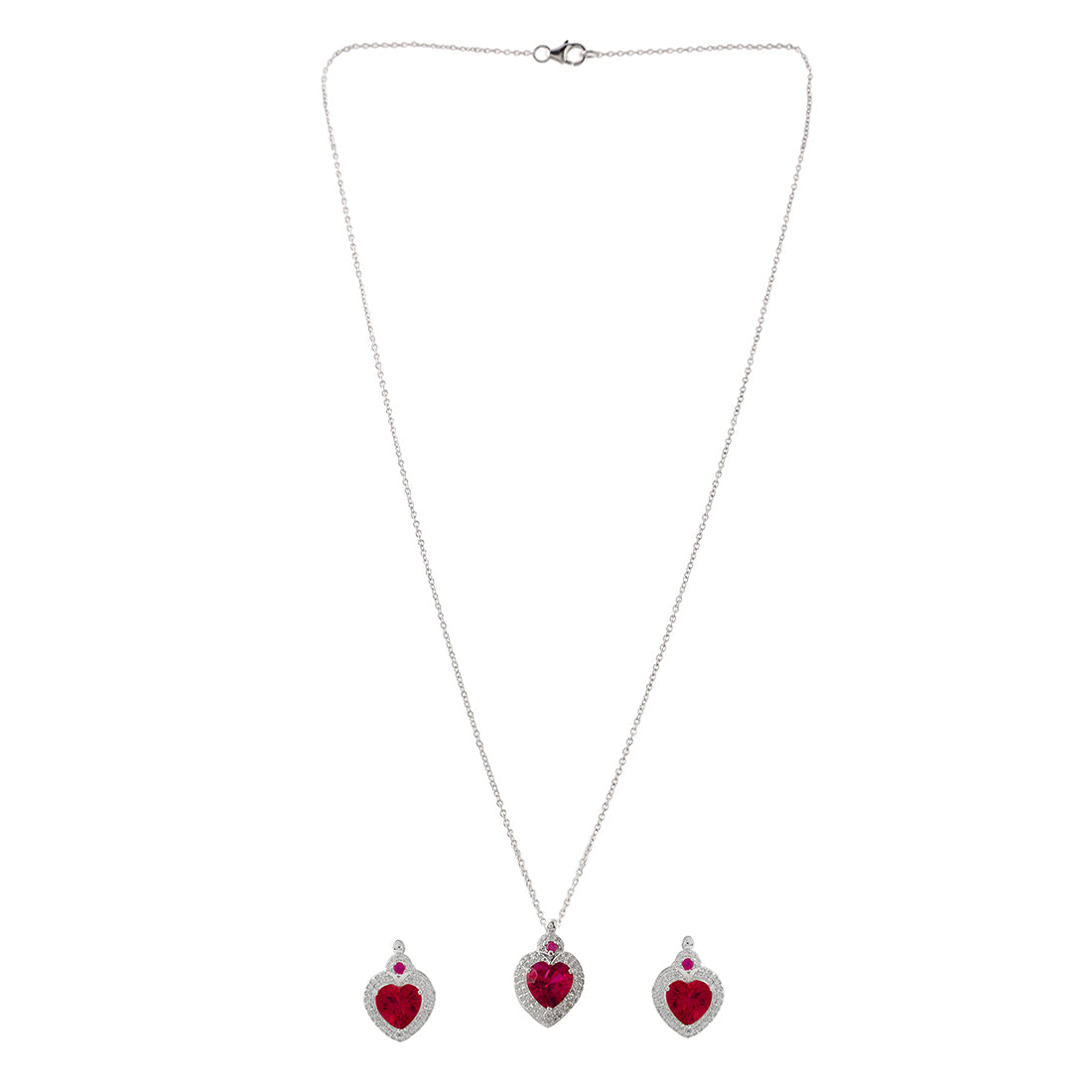 Red, heart shaped cubic zirconia gemstones adorned pendant set, fashioned out of 925 sterling silver. The set has been given a white rhodium plating and can be paired with just about everything.