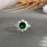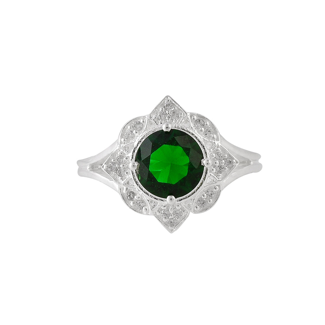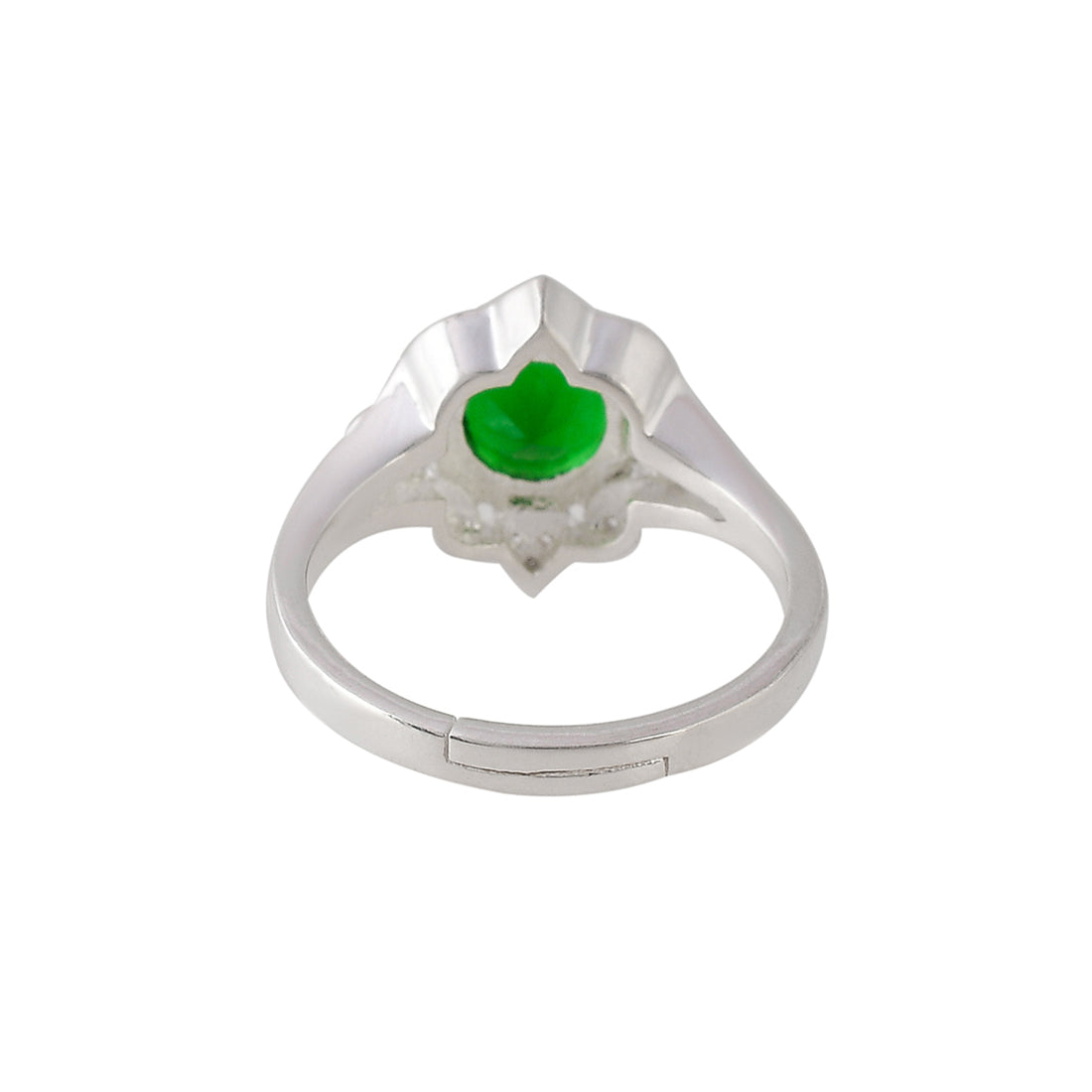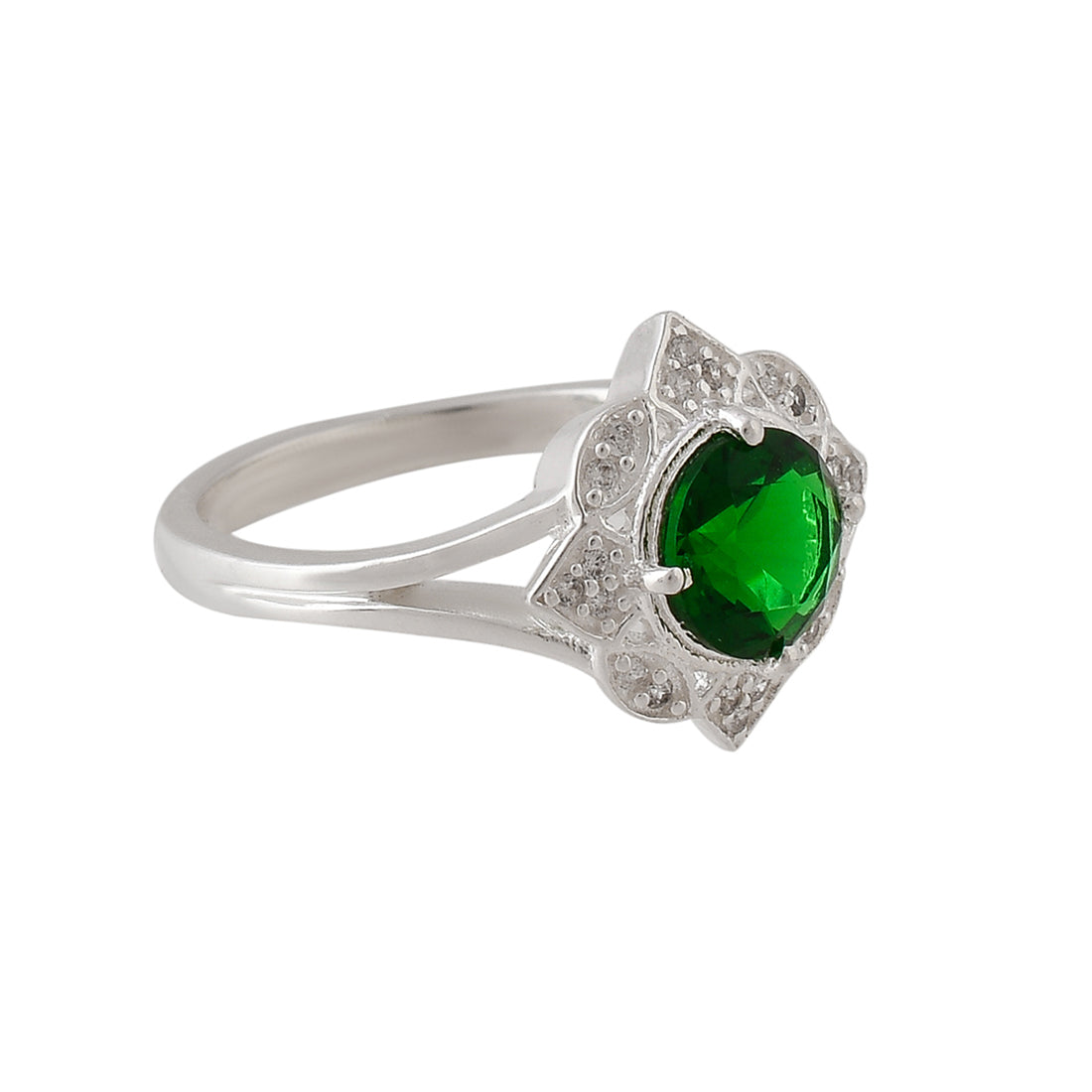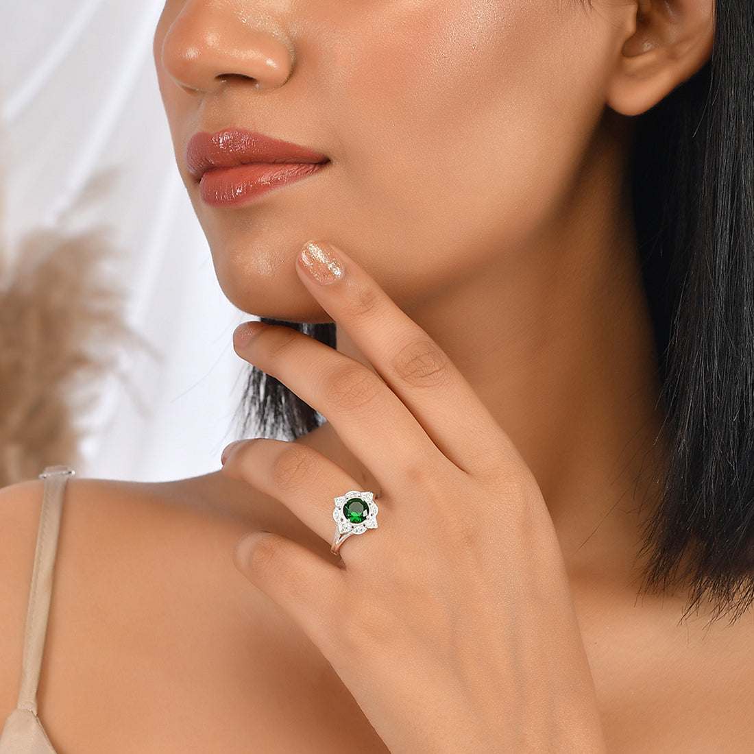A 925 sterling silver ring for women with white rhodium plating. Adorned with a round cut green zirconia gemstones. Perfect for everyday as well as occasional wear.