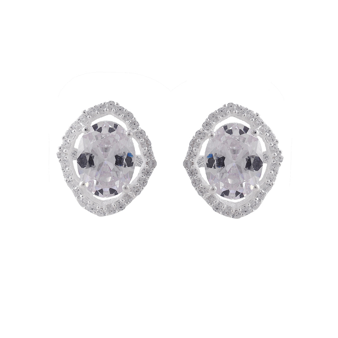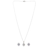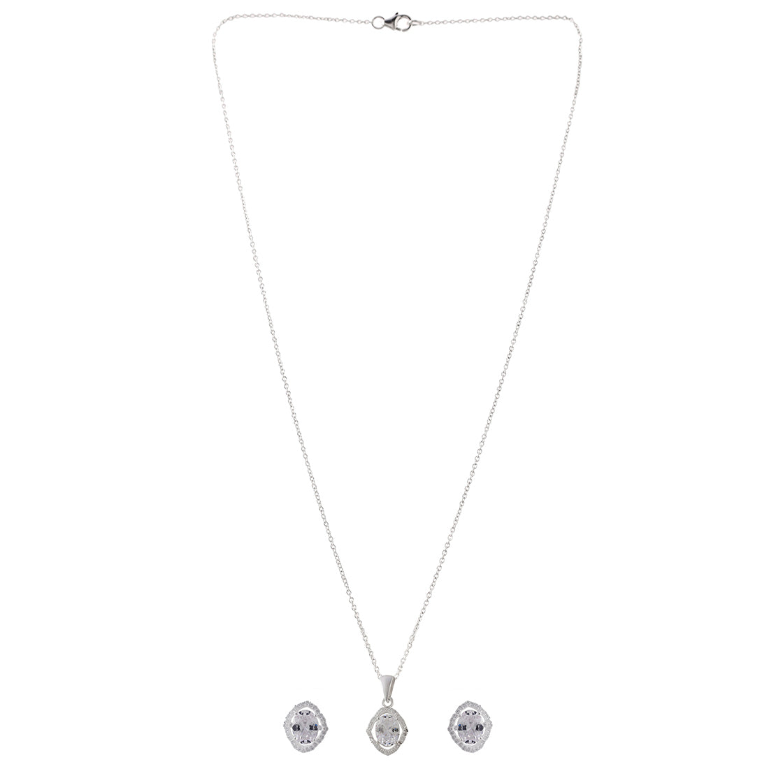 A lovely 925 sterling silver pendant set with white rhodium plating. The earrings and pendant (with chain) have been embellished with oval cut white zirconia gems. Pair with any of your favourite outfits.