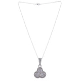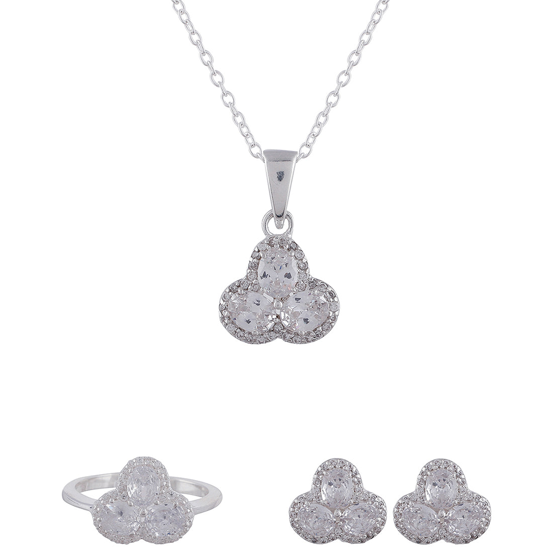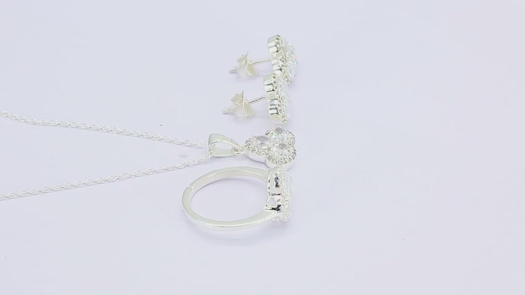 Shine like a princess with this exquisite jewel box set. This box includes a pendant with a chain, a ring, and a matching pair of earrings, featuring an elegant pattern with brilliant CZ diamonds. It is finished with a smooth polish giving it a rich look. Light in weight and also you can also save a lot of money as it's at an affordable price. Best for the gifting purpose.