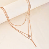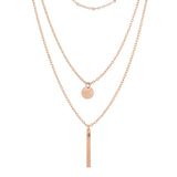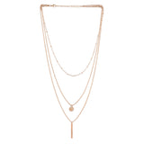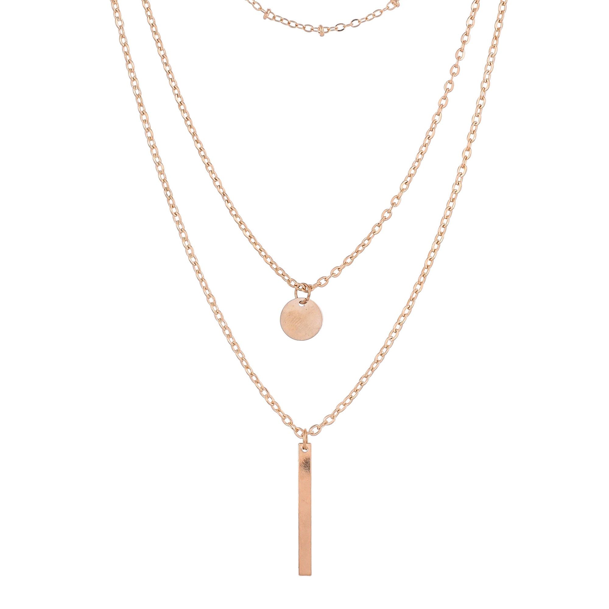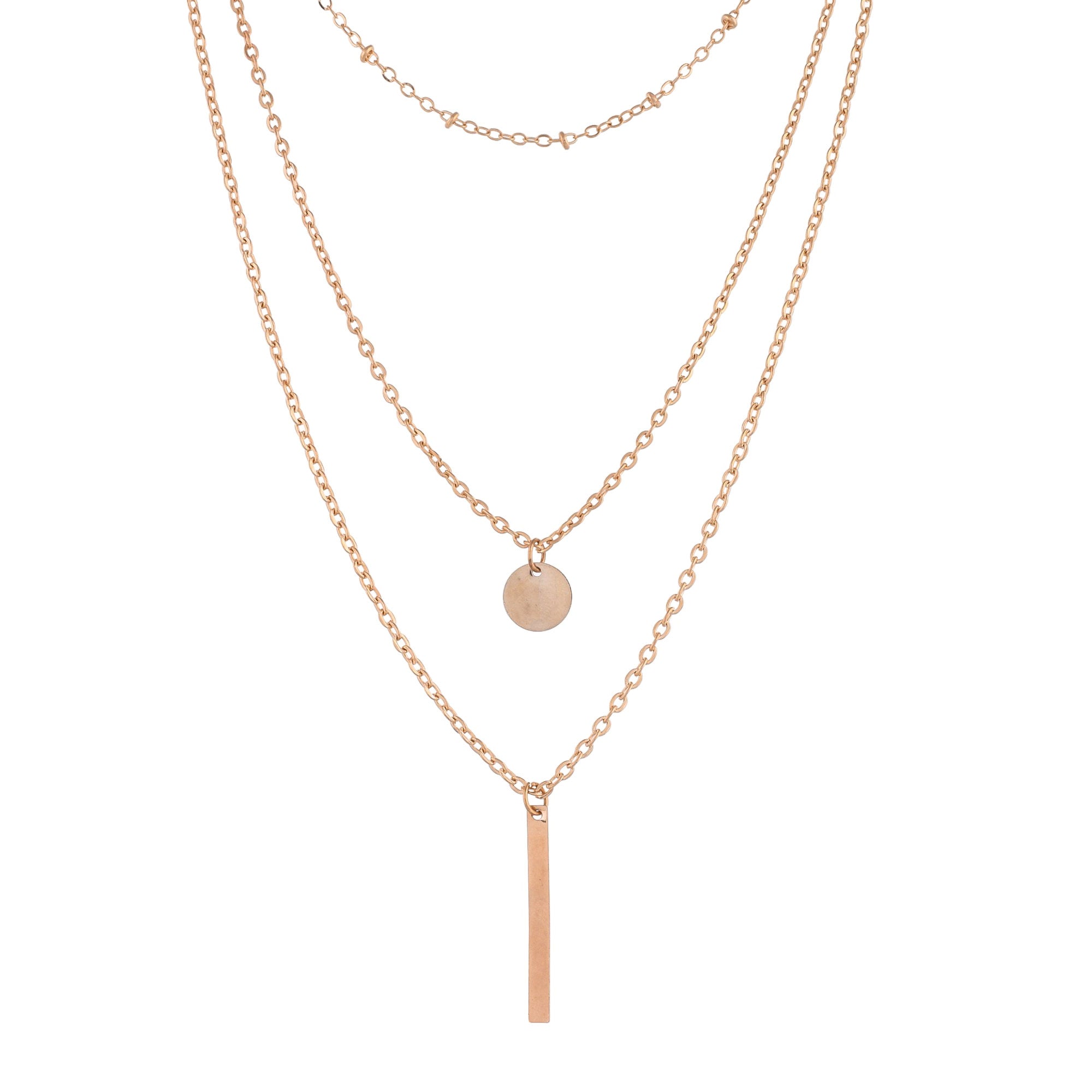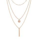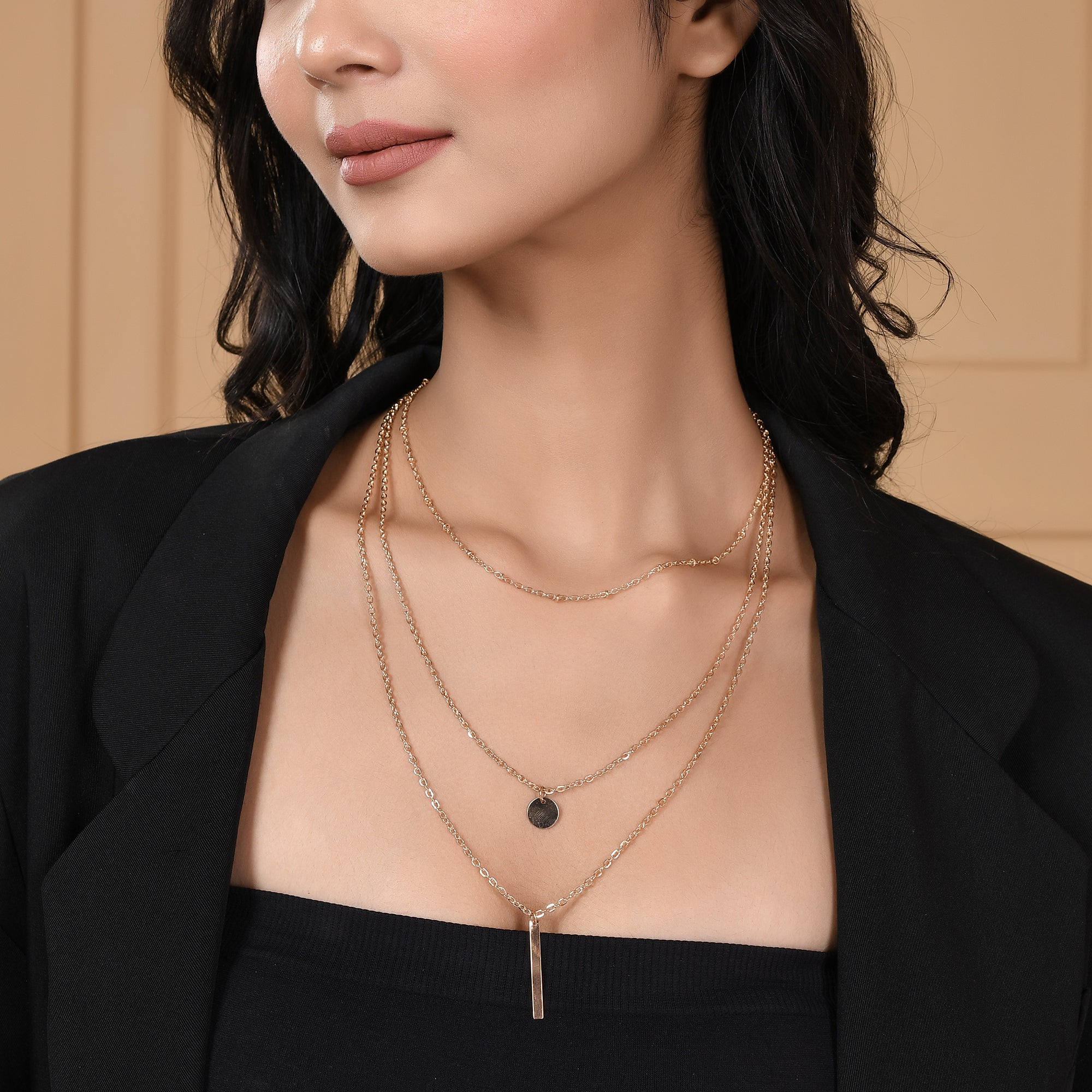 This beautiful necklace has accents of natural geometric shapes and is finished with three gold plated chains. Illustrated layered necklace includes a disc and bar charm attached to a fine layered chain necklace. This piece is so versatile you would find reaching for it again and again.