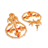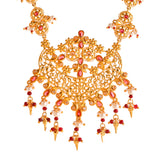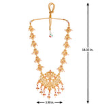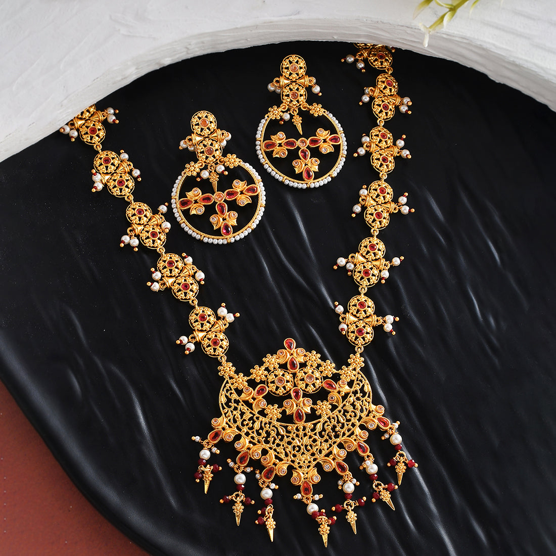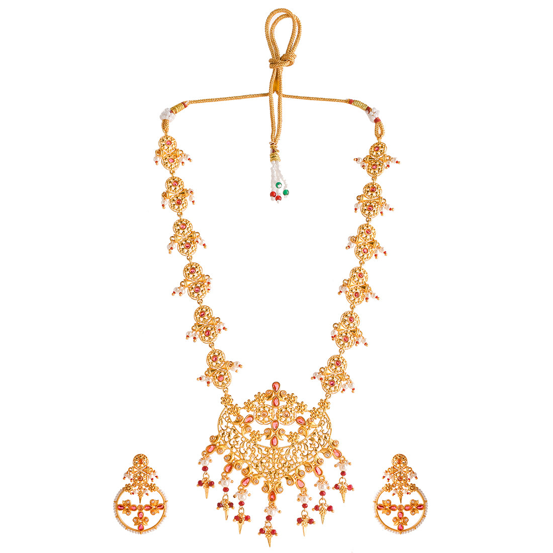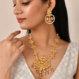 Opulent ethnic inspired jewellery set made from brass. The white pearls adorned earrings and necklace have been given a yellow gold plating. Pair with formal Indian outfits.
