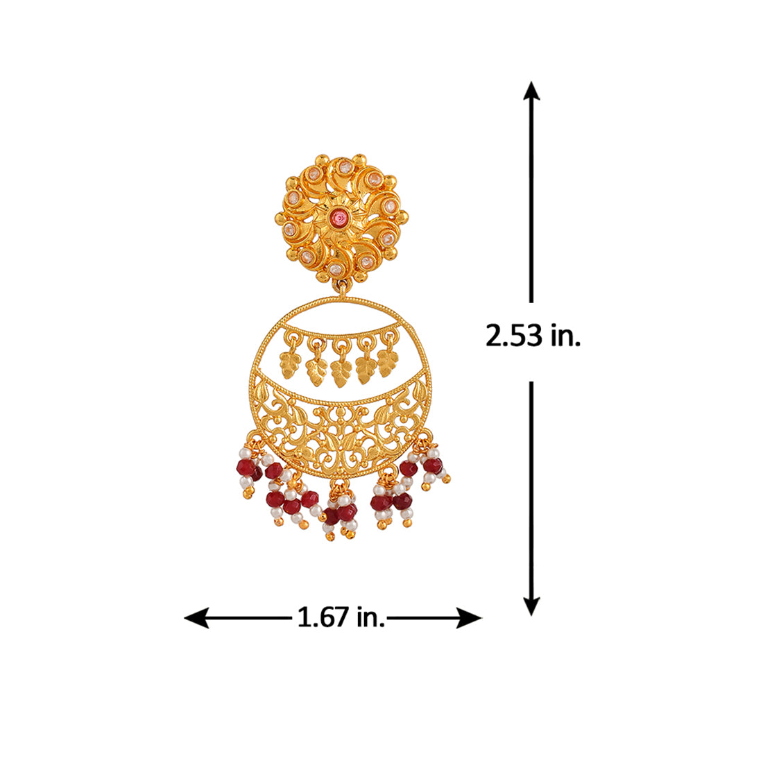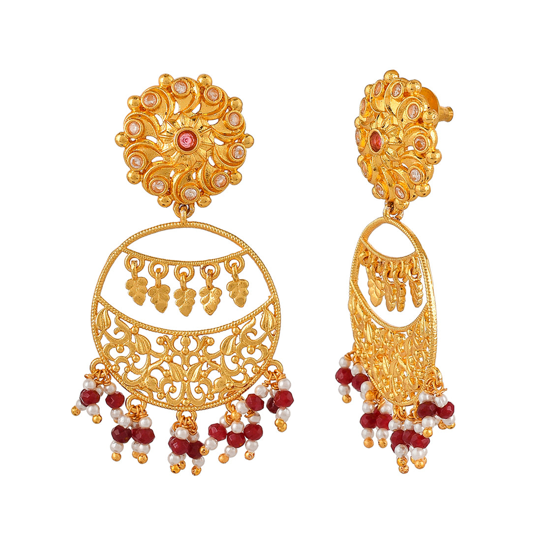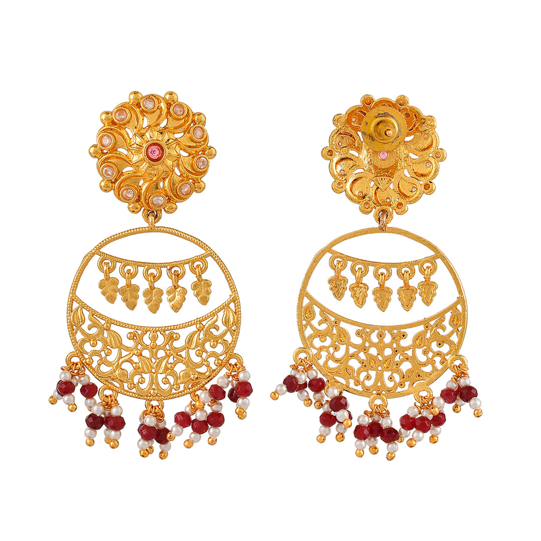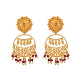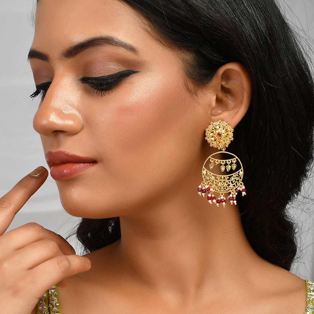 Delicate filigree design red stones and pearls embellished drop earrings. Made from brass and yellow gold plated. Pair with Indian attire.