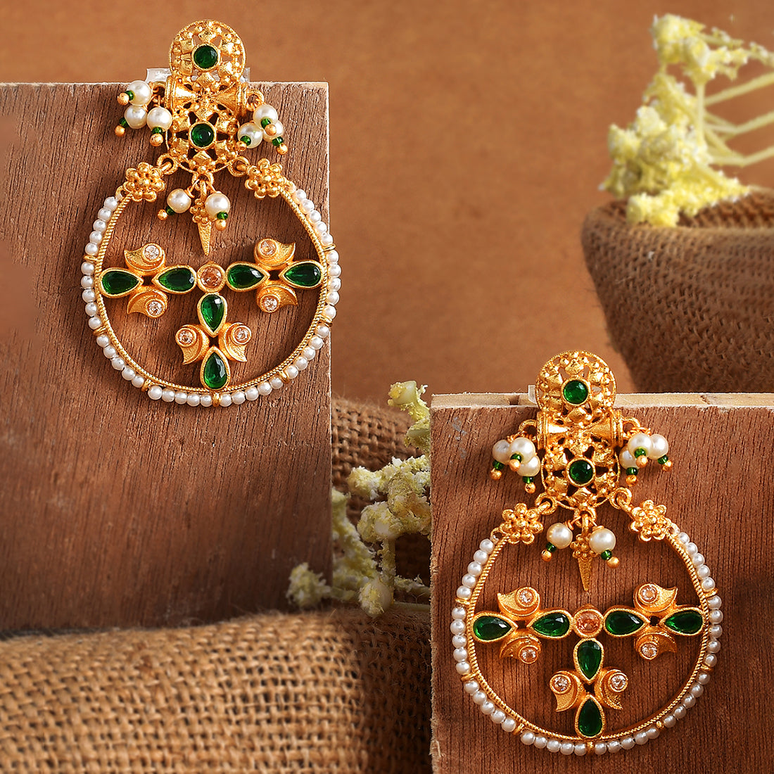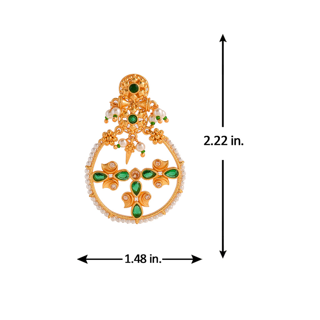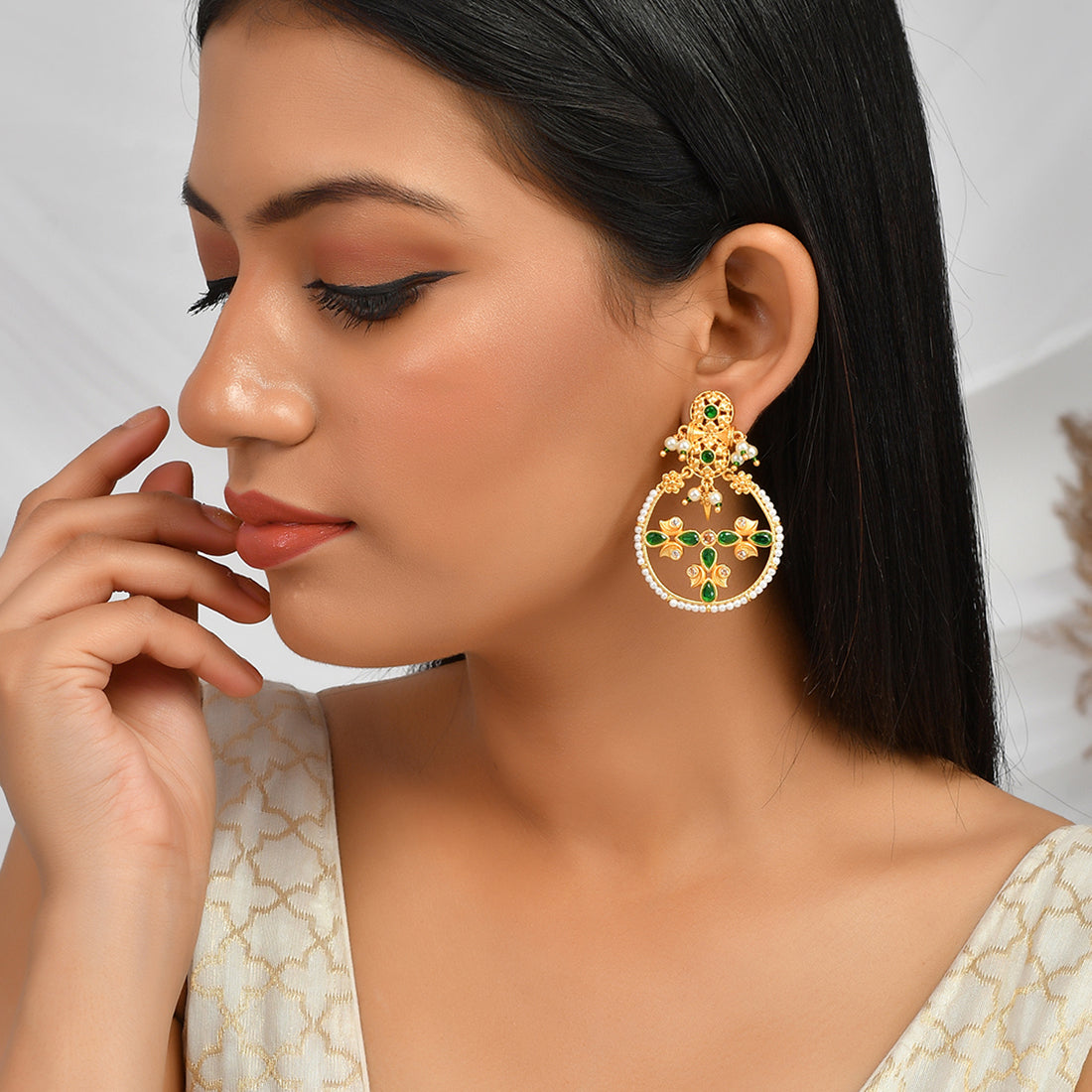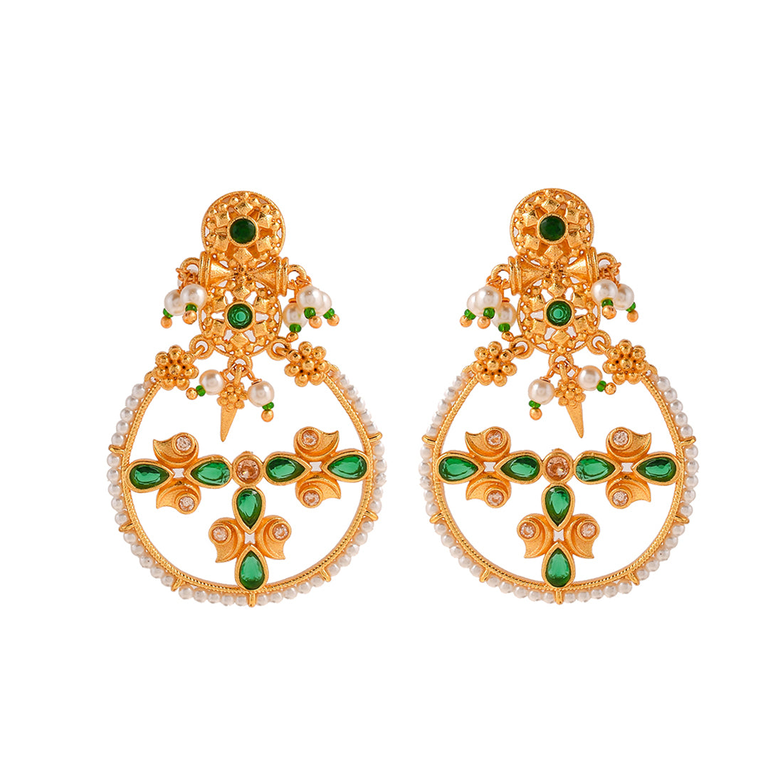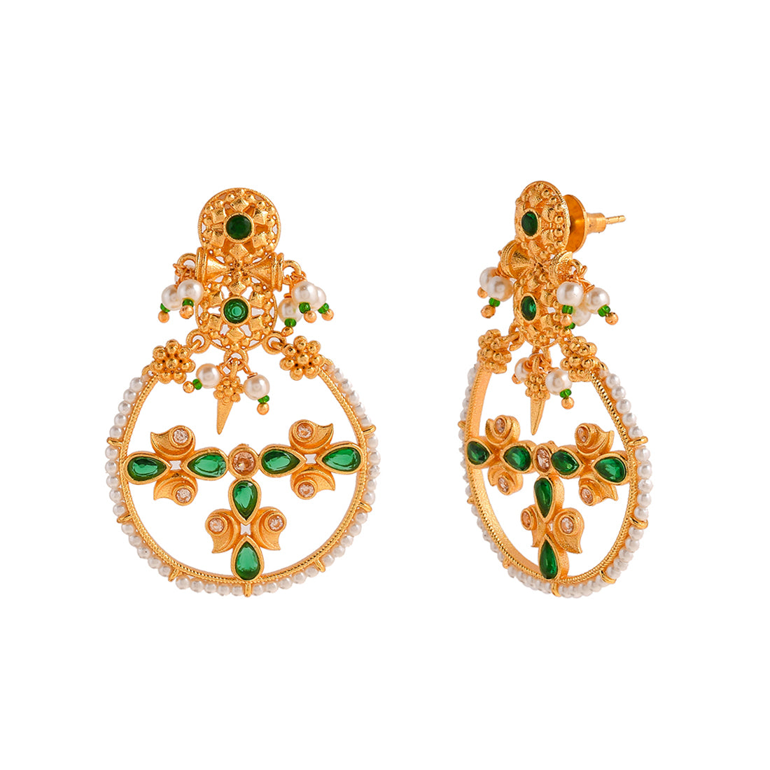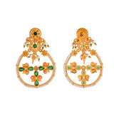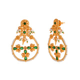 Floral motif ethnic style drop earrings made from brass and embellished with white pearls and teardrop cut green stones. Yellow gold plated for added glam.