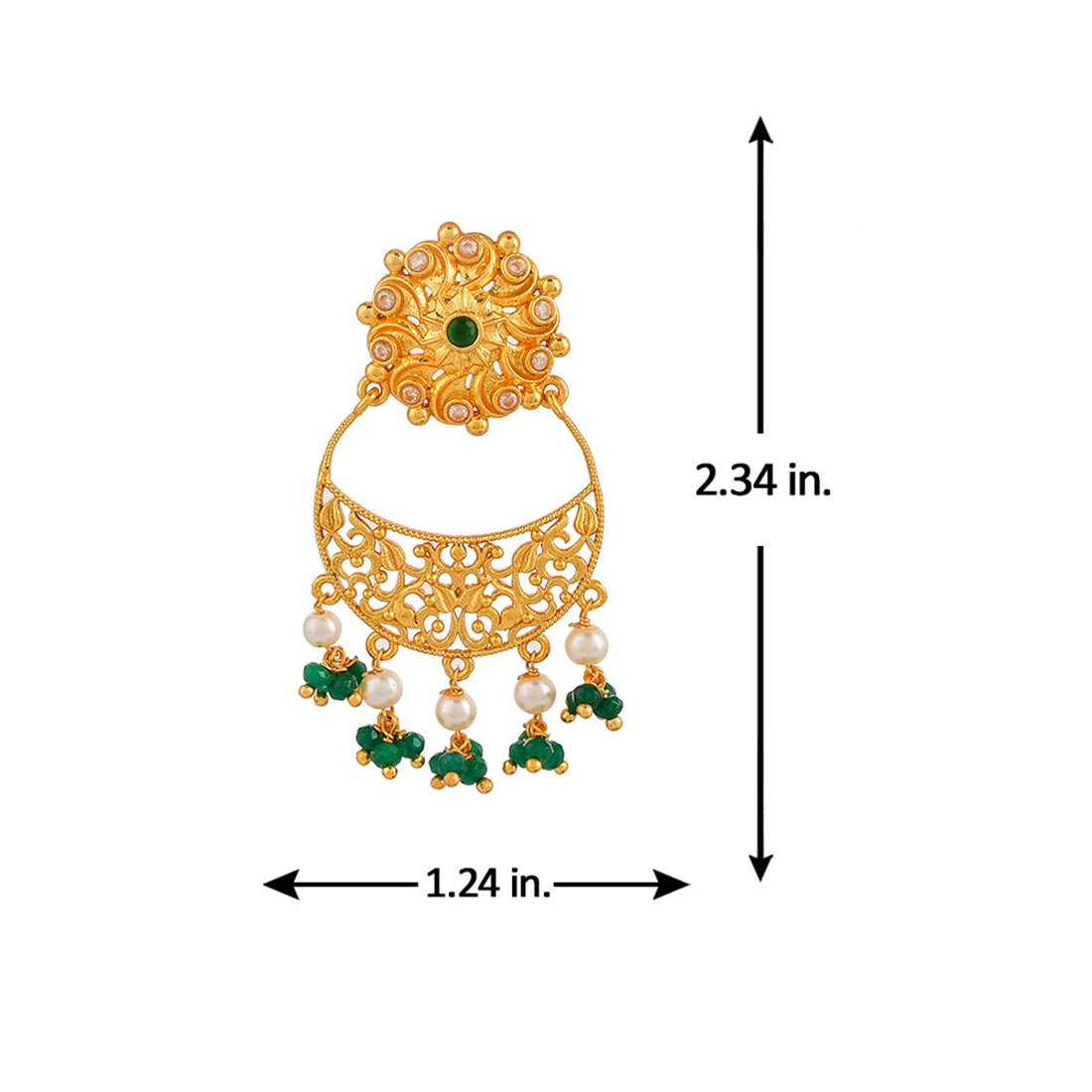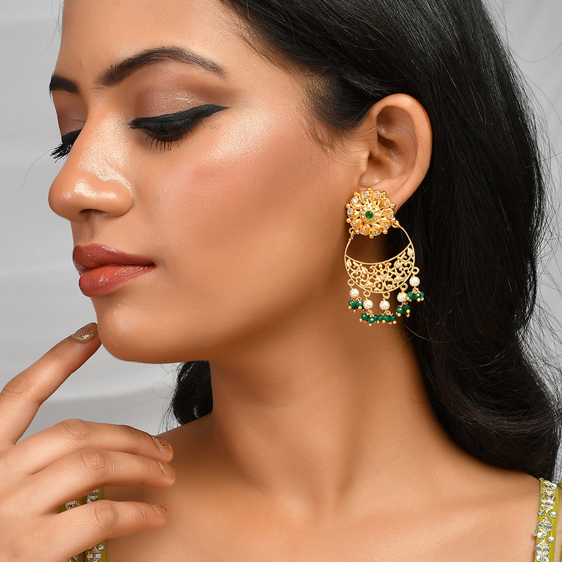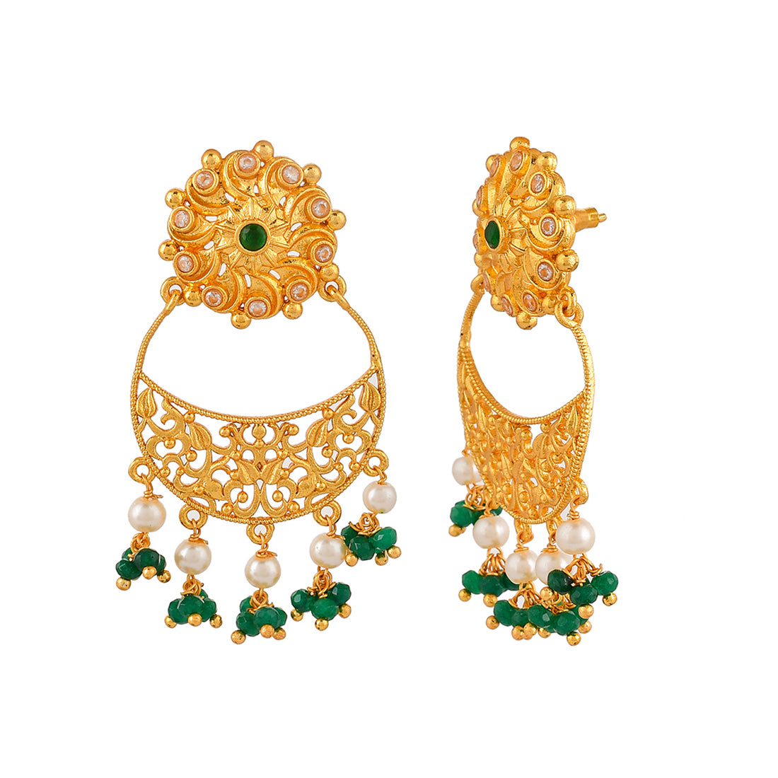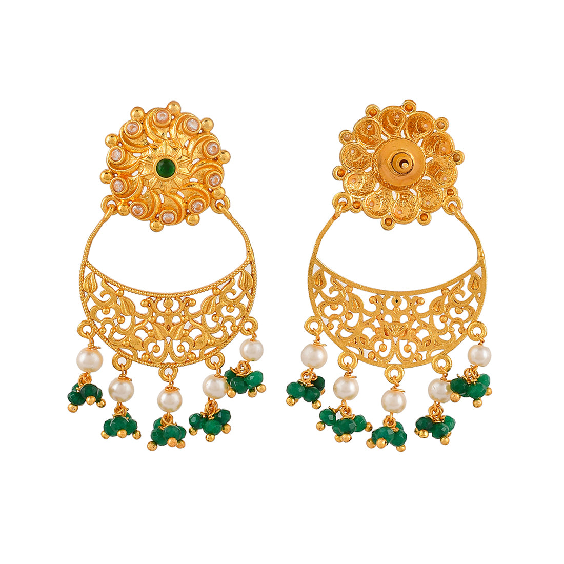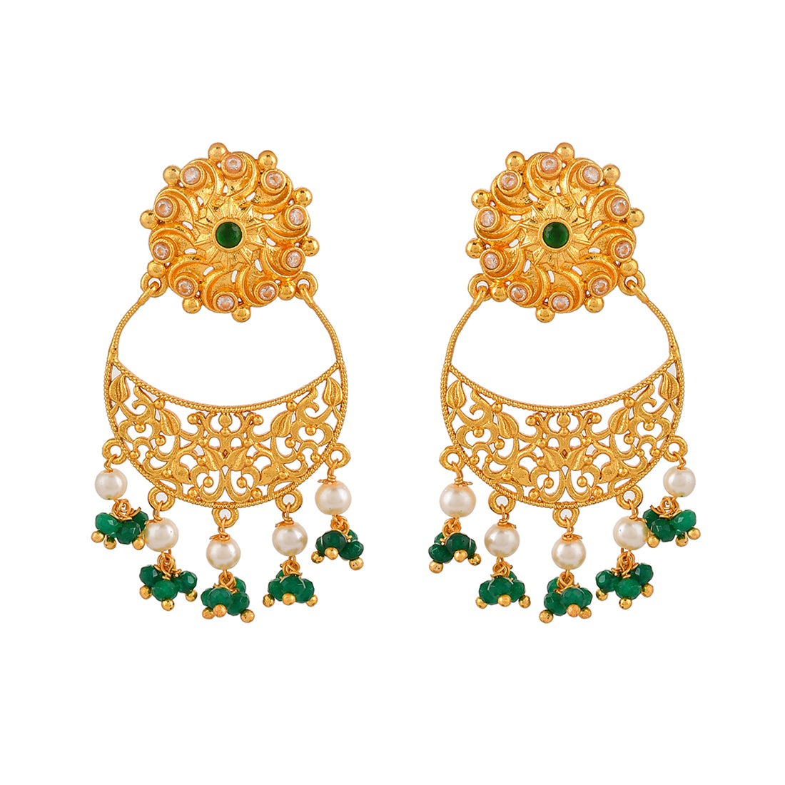 Green stone embellished drop earrings, made from brass and yellow gold plated. Featuring a filigree design, the earrings are lightweight, comfortable and versatile.