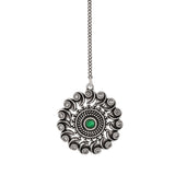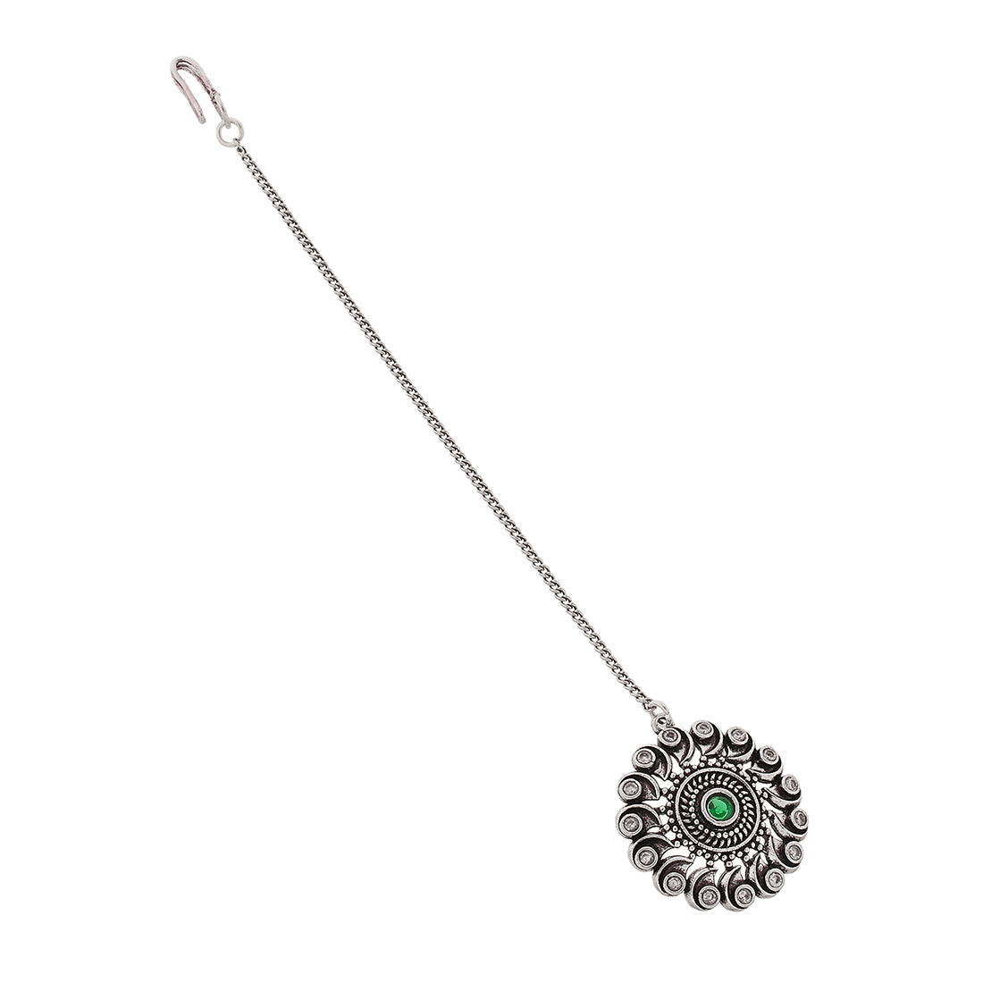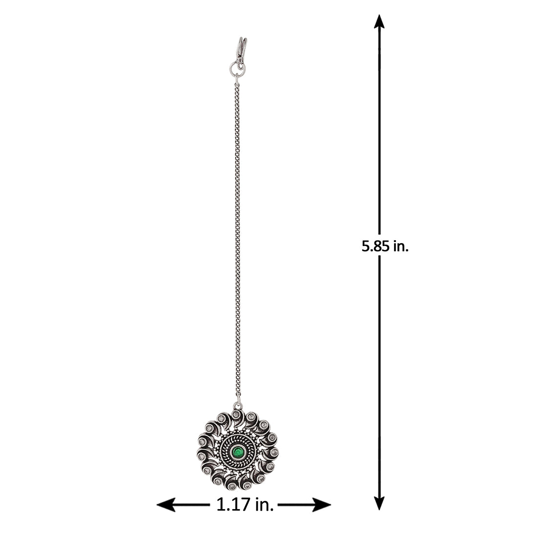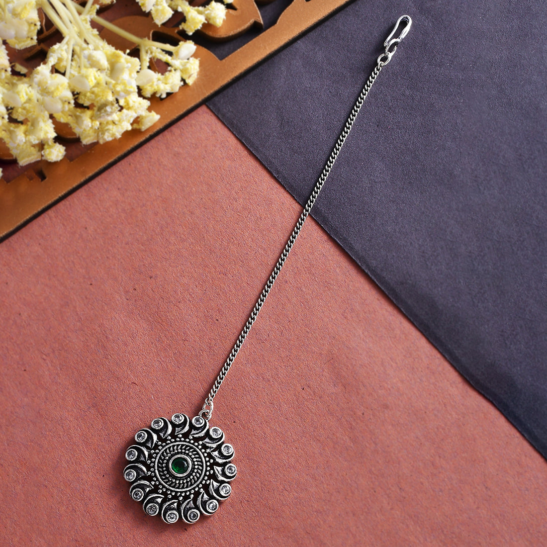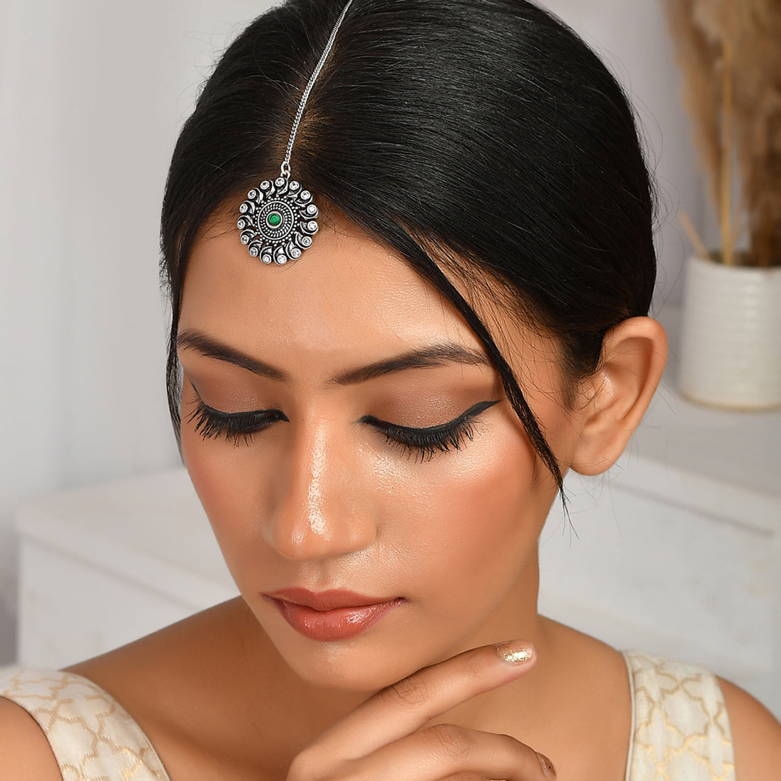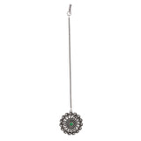 Oxidised silver plated maang tika made from brass. Embellished with round cut white and red stones. Pair with Indian and Indo-Western attire.
