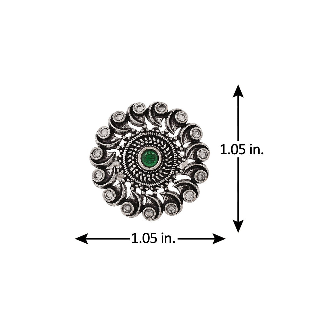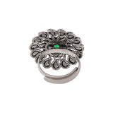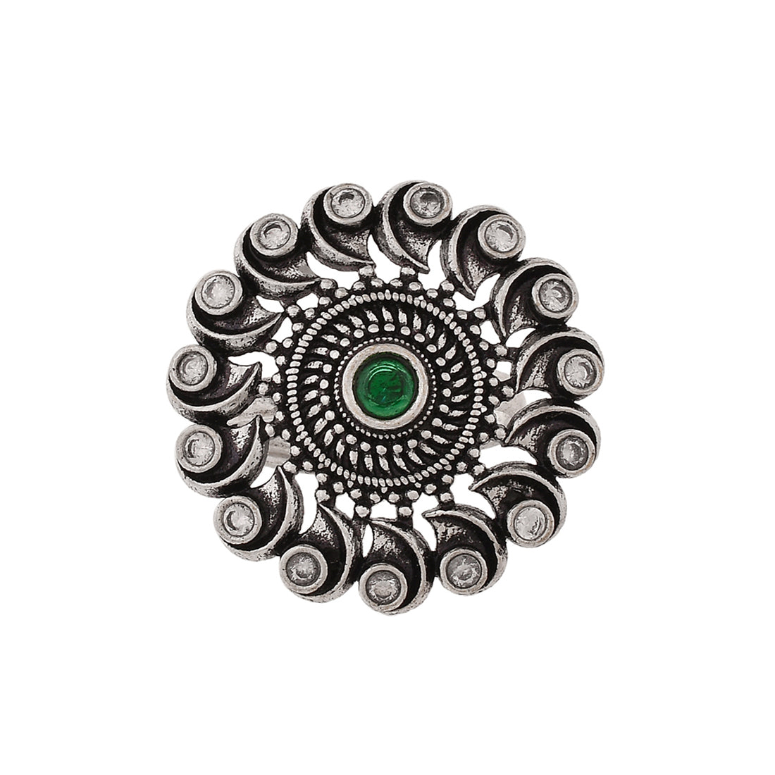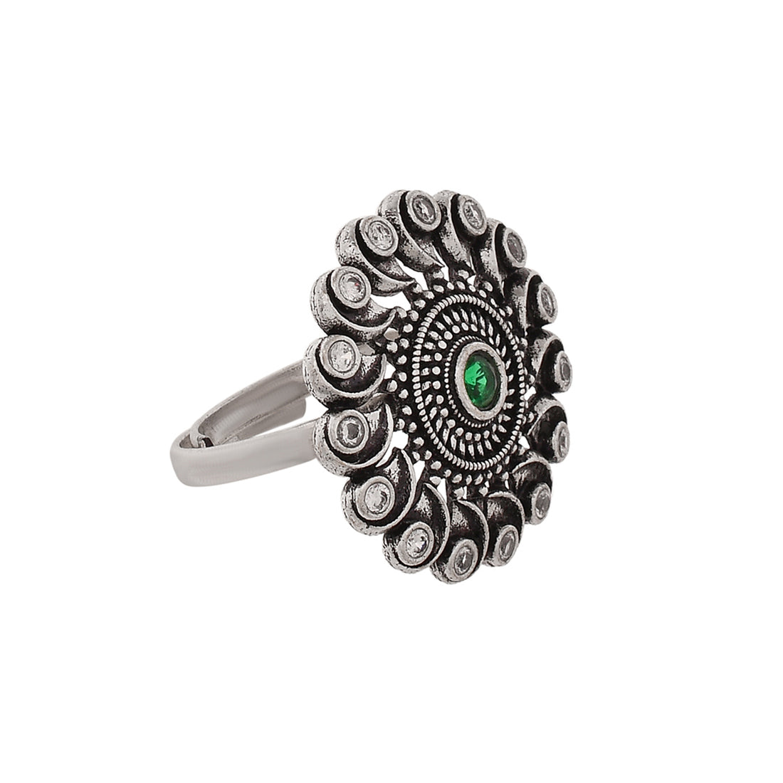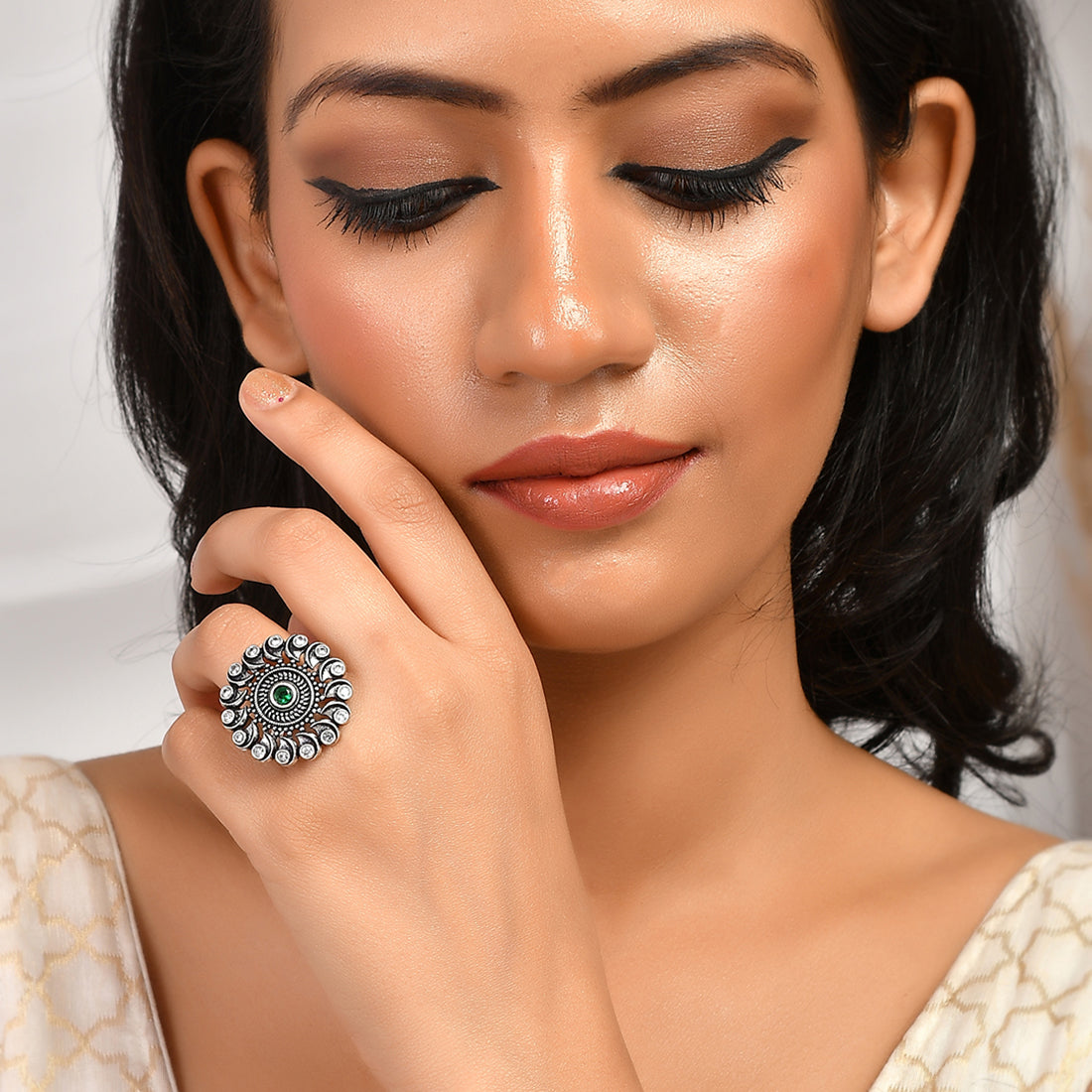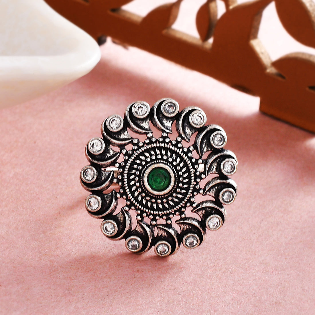 Oxidised silver plated ring made from brass. Embellished with round cut white and red stones. Lightweight, comfortable and versatile.