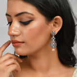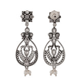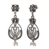 White pearls embellished brass drop earrings with oxidised silver plating. A good match for ethnic looks.