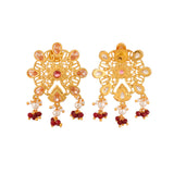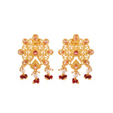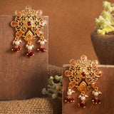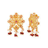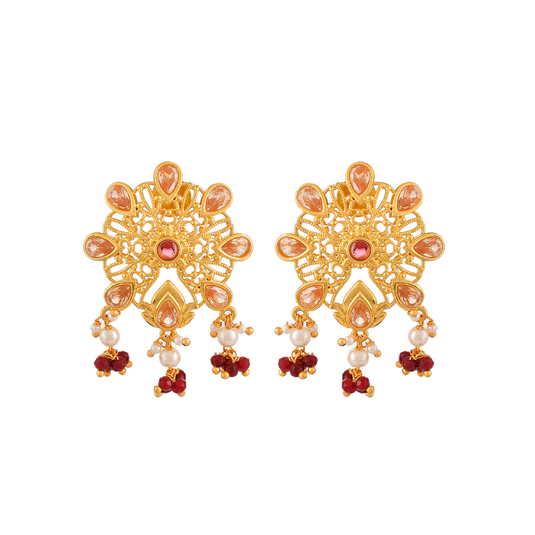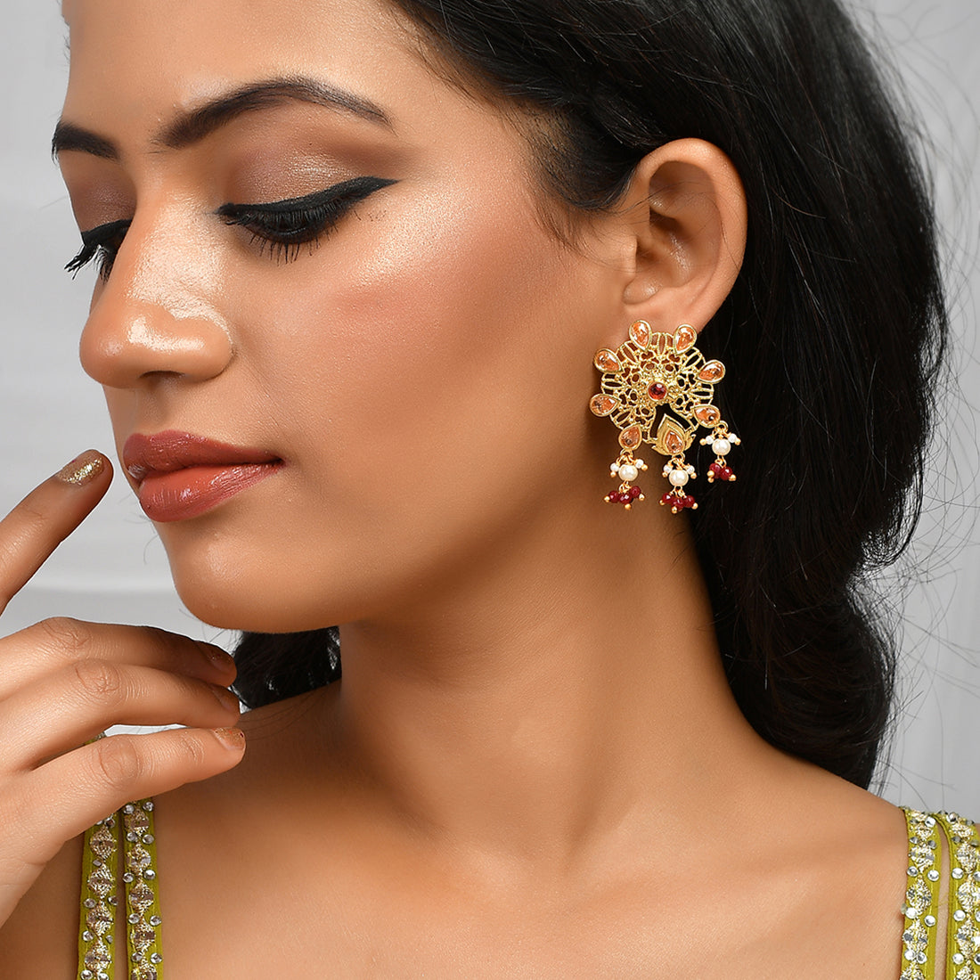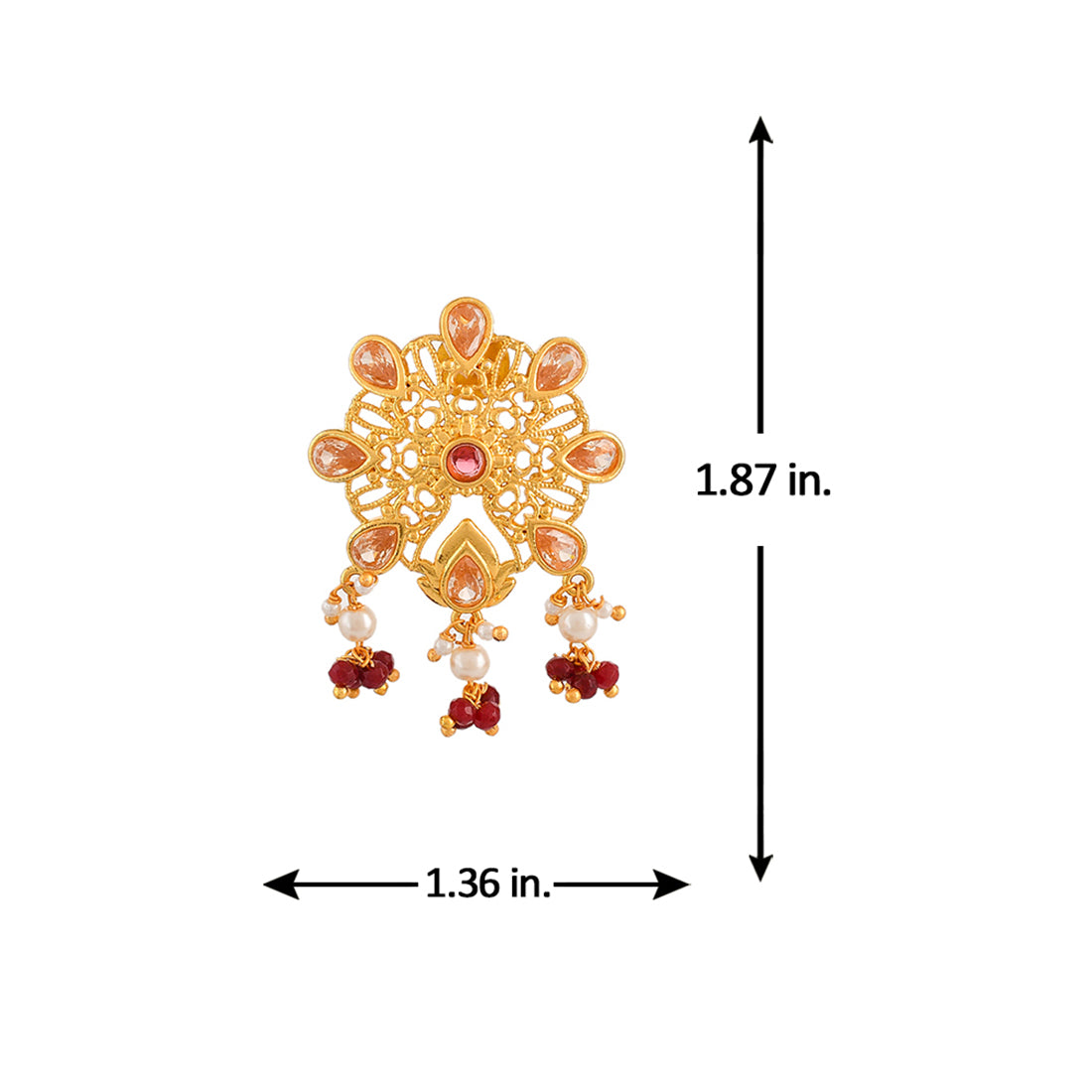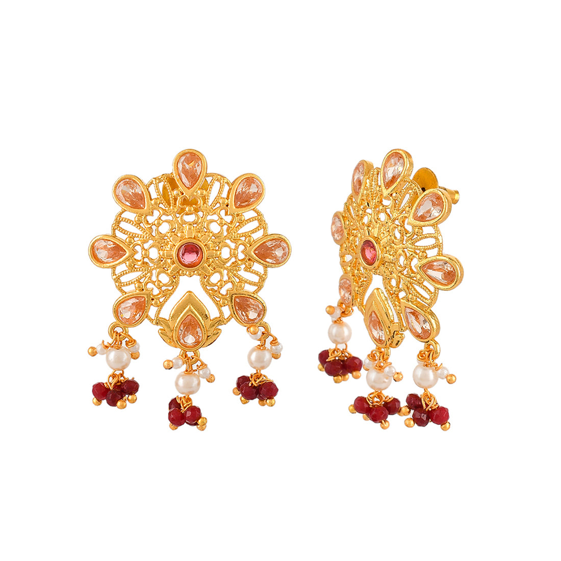 Floral motif stud earrings with pink and red stones. Made from brass and yellow gold plated. Good for casual as well as formal wear.