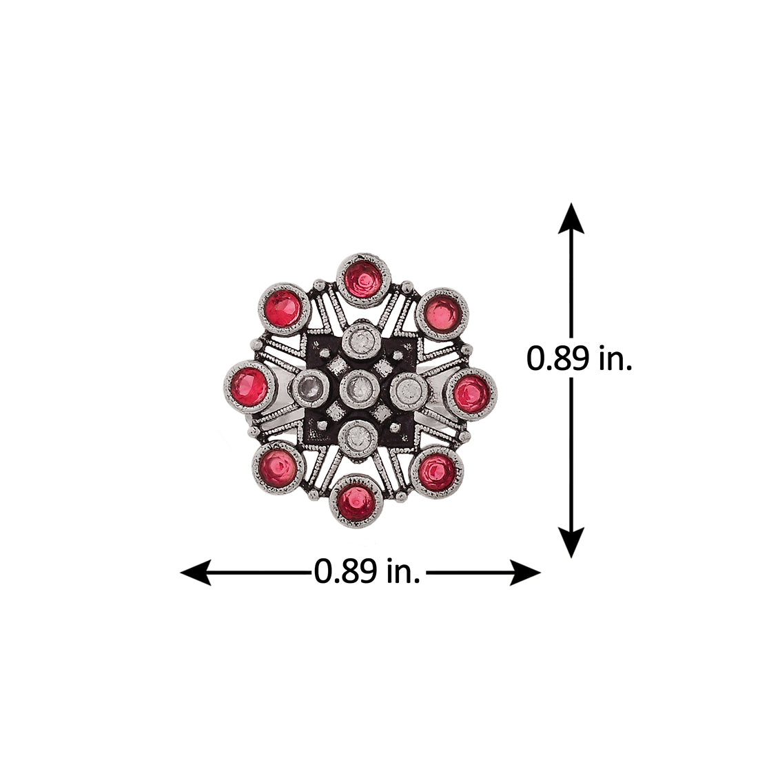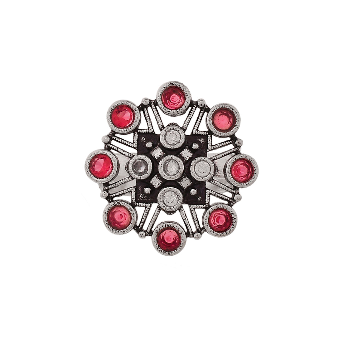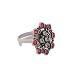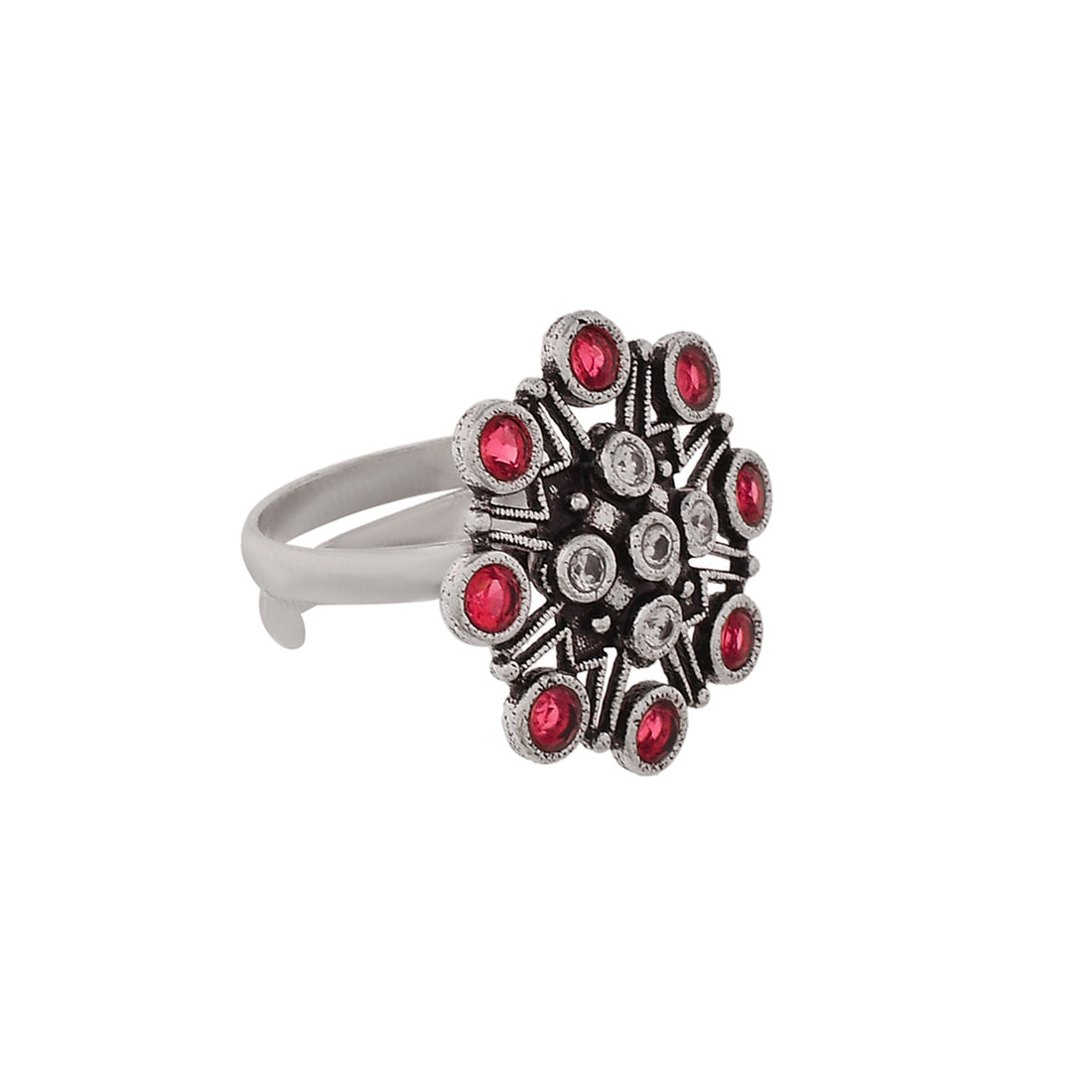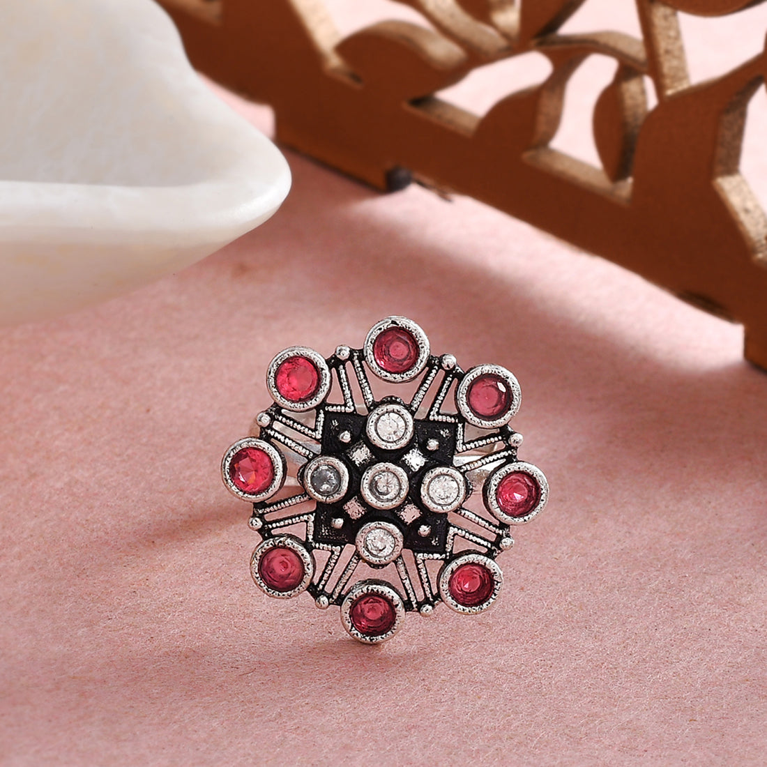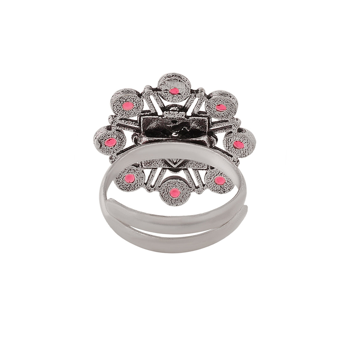 Floral ring embellished with round cut pink stone. Made from brass and oxidised silver plated. The ring promises to be a comfortable wear at all times.