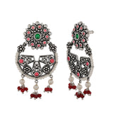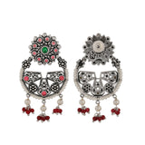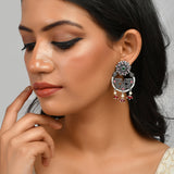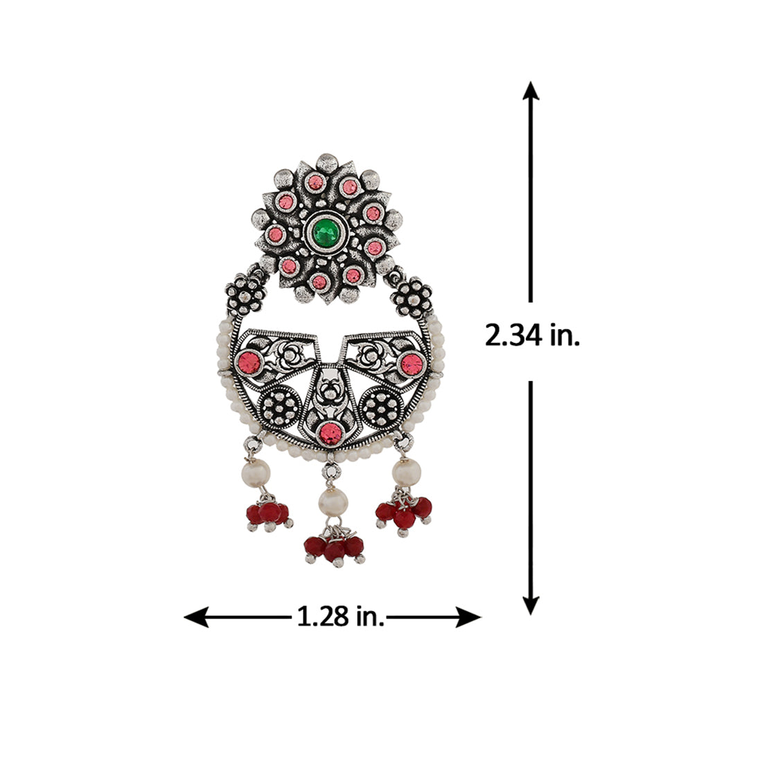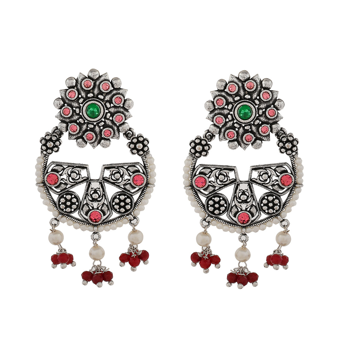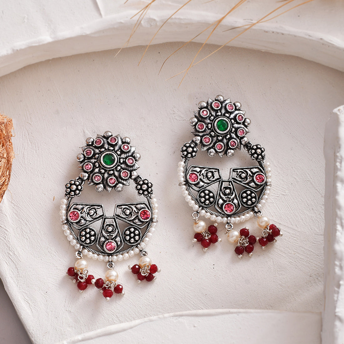 Brass floral earrings in an ethnic hoop design. Oxidised silver plated and embellished with white pearls and pink stones. Pair with Indian attire.