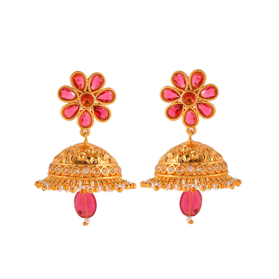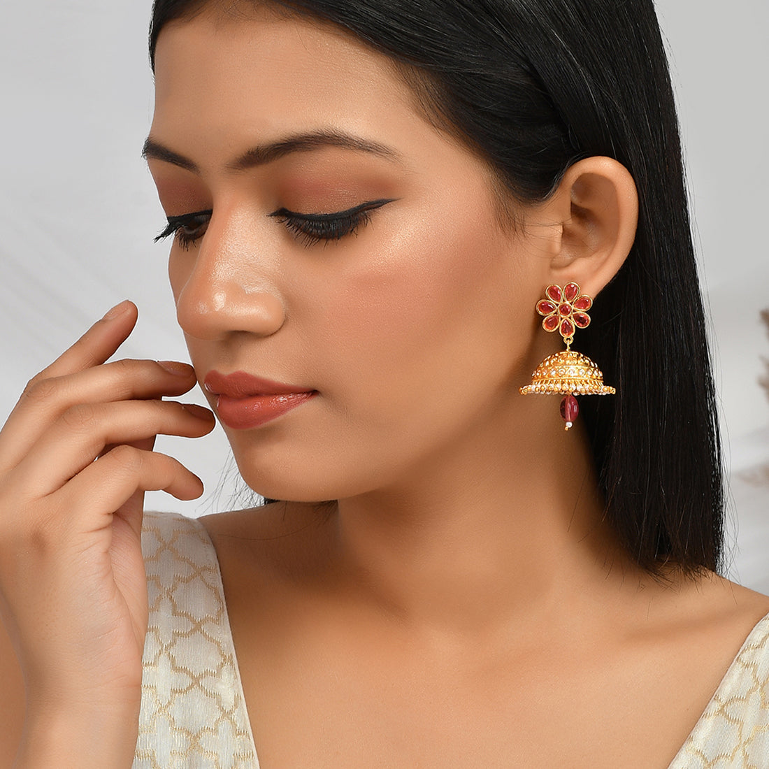 Ethnic jhumka earrings embellished with red stones and pearls. Yellow gold plated and good for formal as well as casual wear.