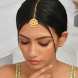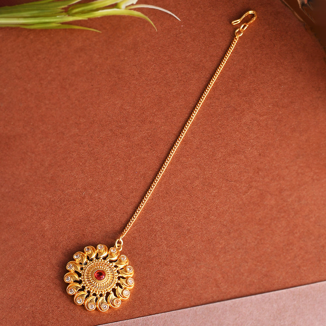 Floral motif ethnic maang tika with red stones. Made from brass and yellow gold plated. Good for Indian and Indo-Western looks.
