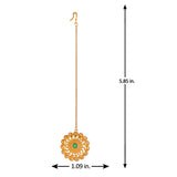 Ethnic maang tika, made from brass and yellow gold plated. Embellished with a round cut green stone. Pair with Indian attire.