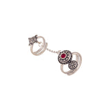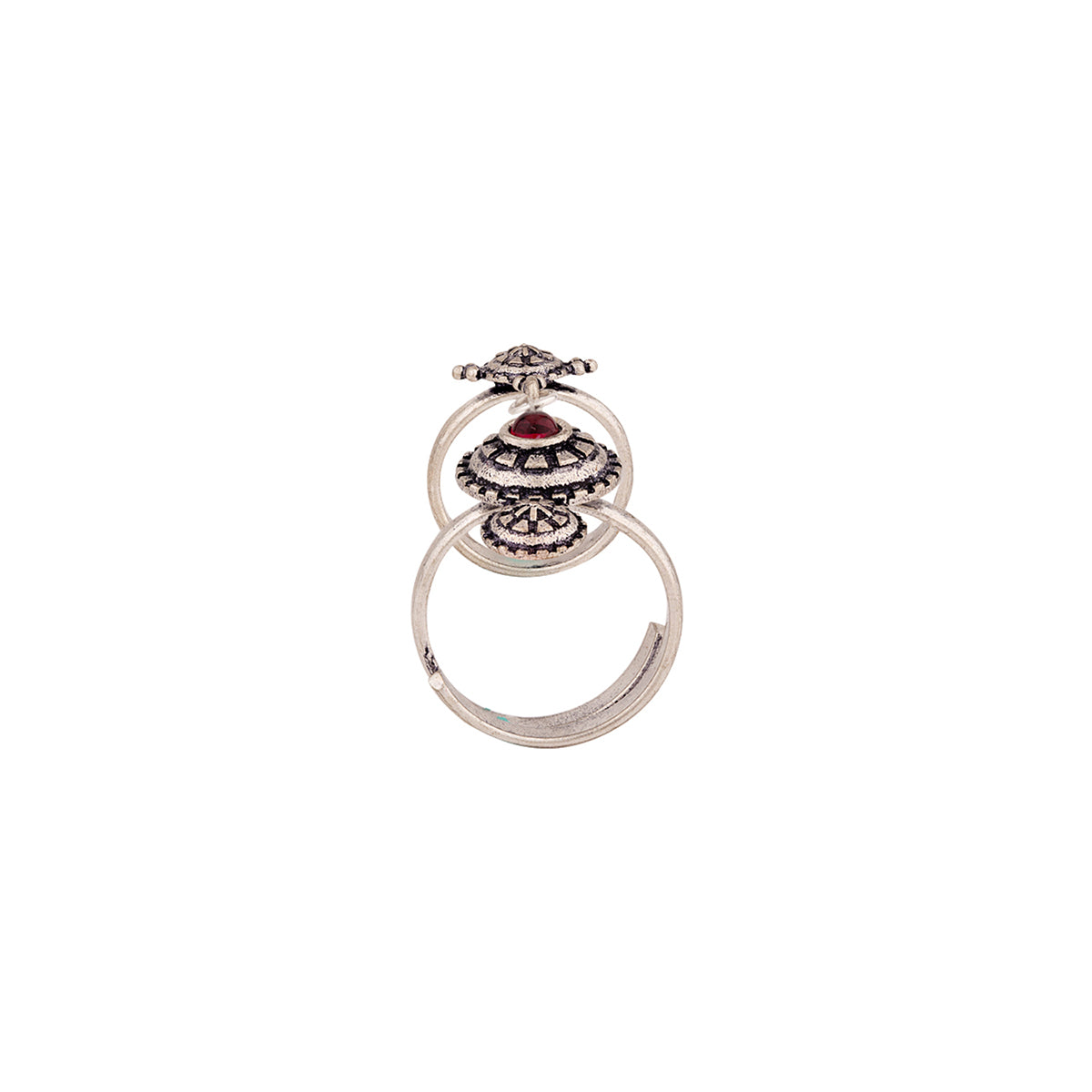 Two finger adjustable ring made from brass. Lightly embellished and oxidized silver plated. A good match for casual ethnic and Indo-Western looks.