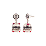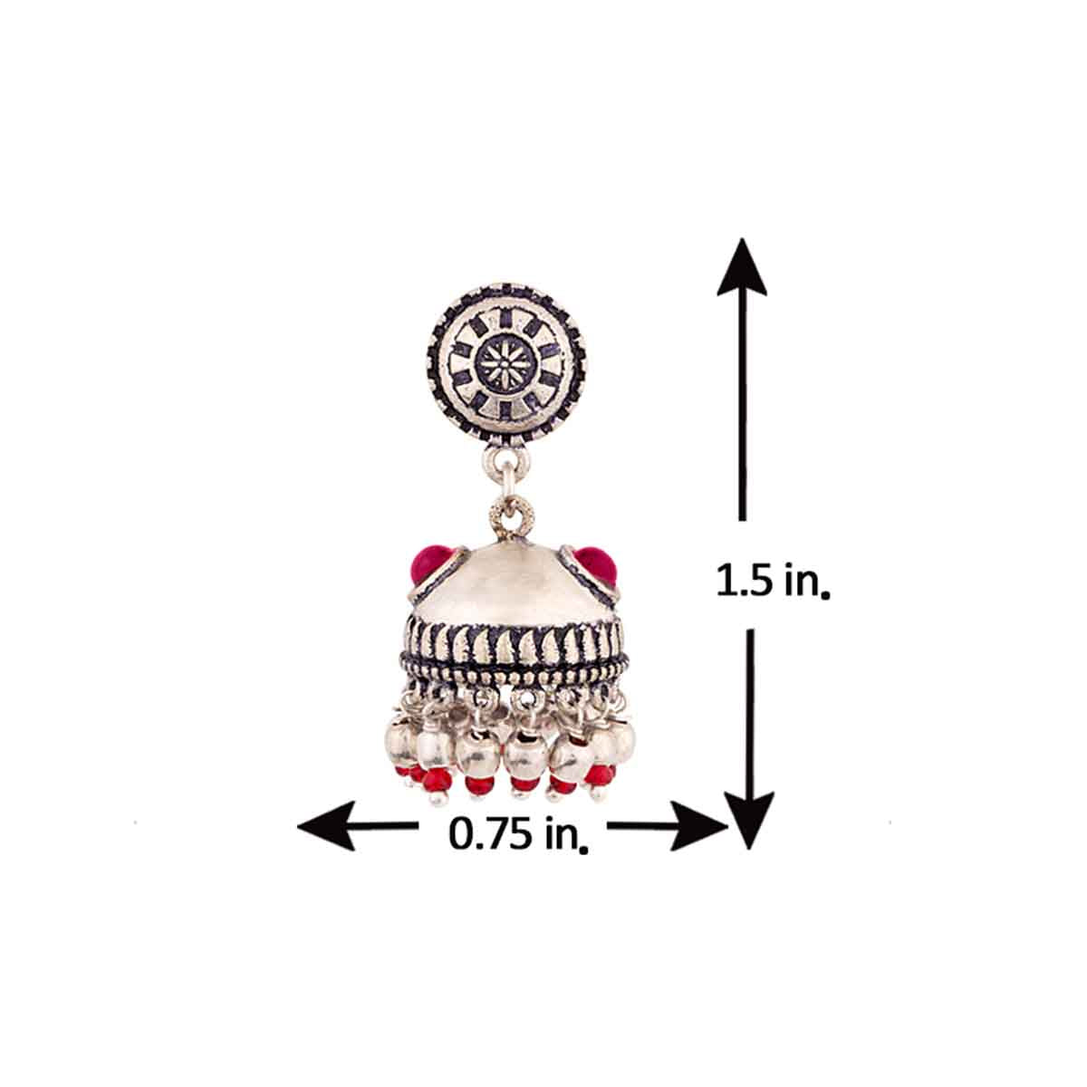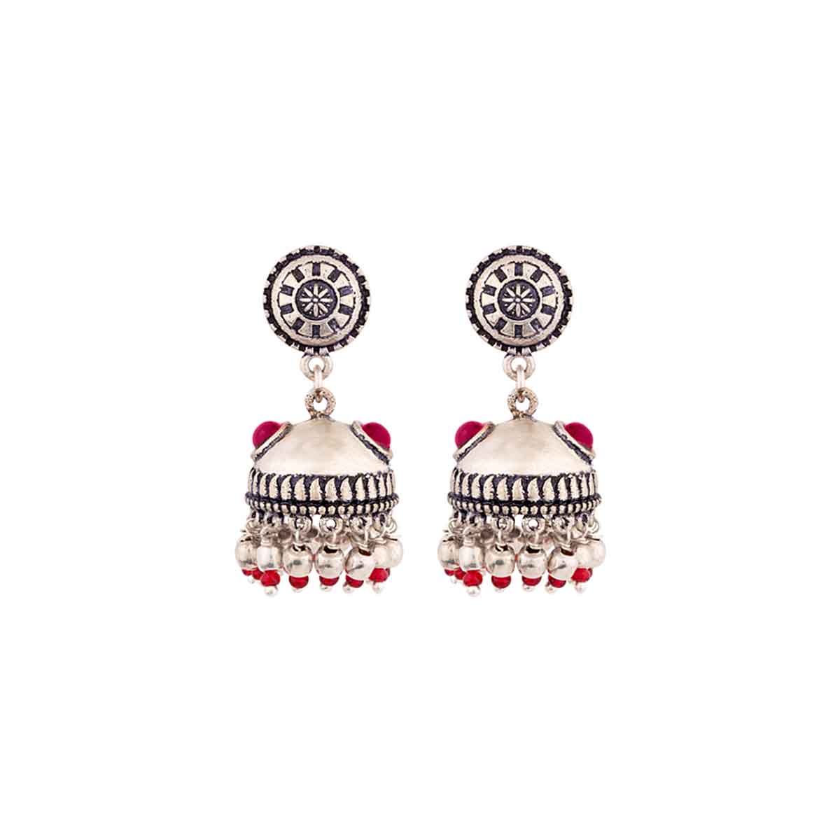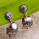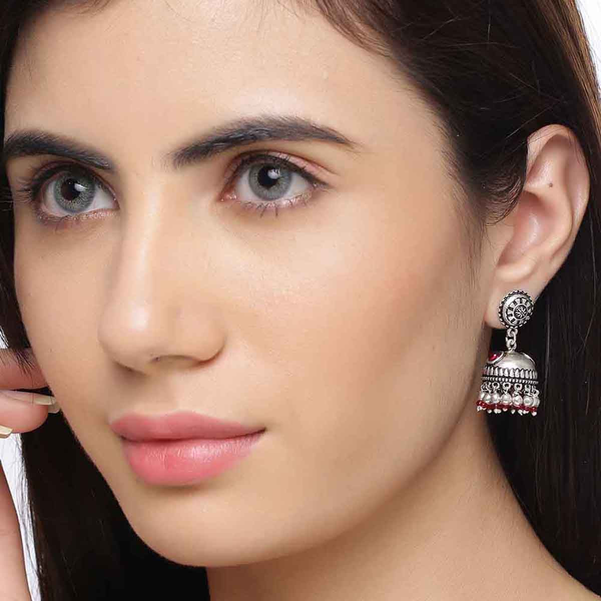 Jhumka earrings with metal embellishments. Made from brass, oxidized silver plated and good for casual ethnic looks.