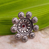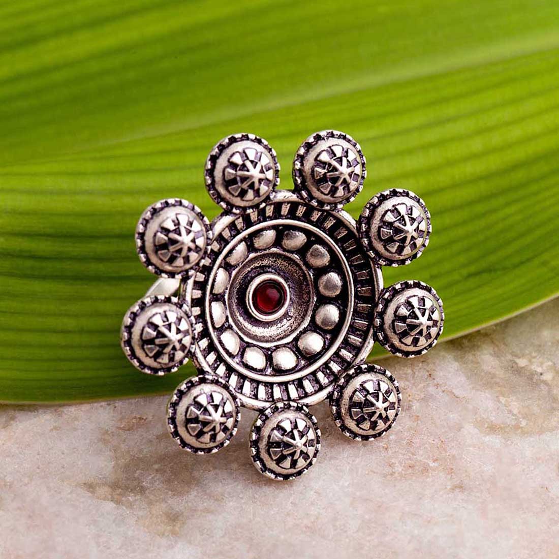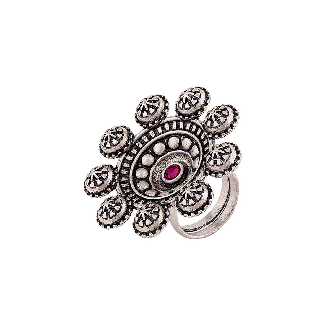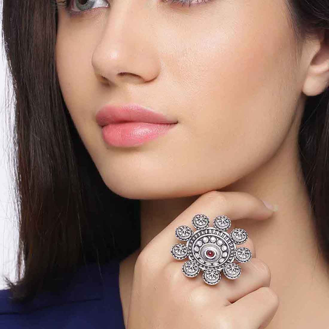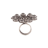 Brass statement ring with light embellishments. Oxidized silver plated. Wear with an ethnic skirt-and-kurta outfit. This piece of jewelry comes with the Voylla assurance of quality and durability.