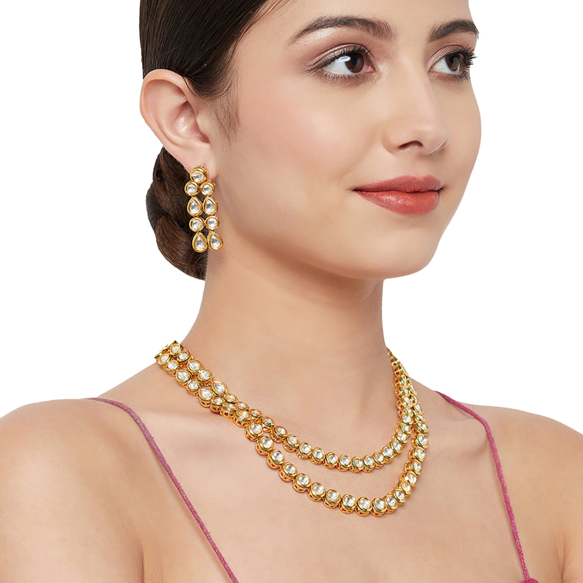 Traditional inspired jewellery set, fashioned out of brass. The necklace and drop earrings have been embellished with kundan gems in a teardrop cut. Yellow gold plating adds to the charm of this set, which will look splendid when paired with a traditional silk saree.