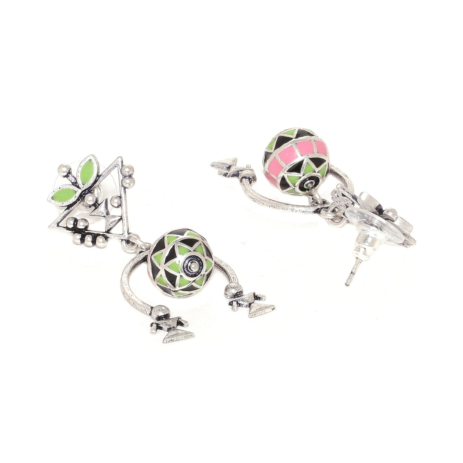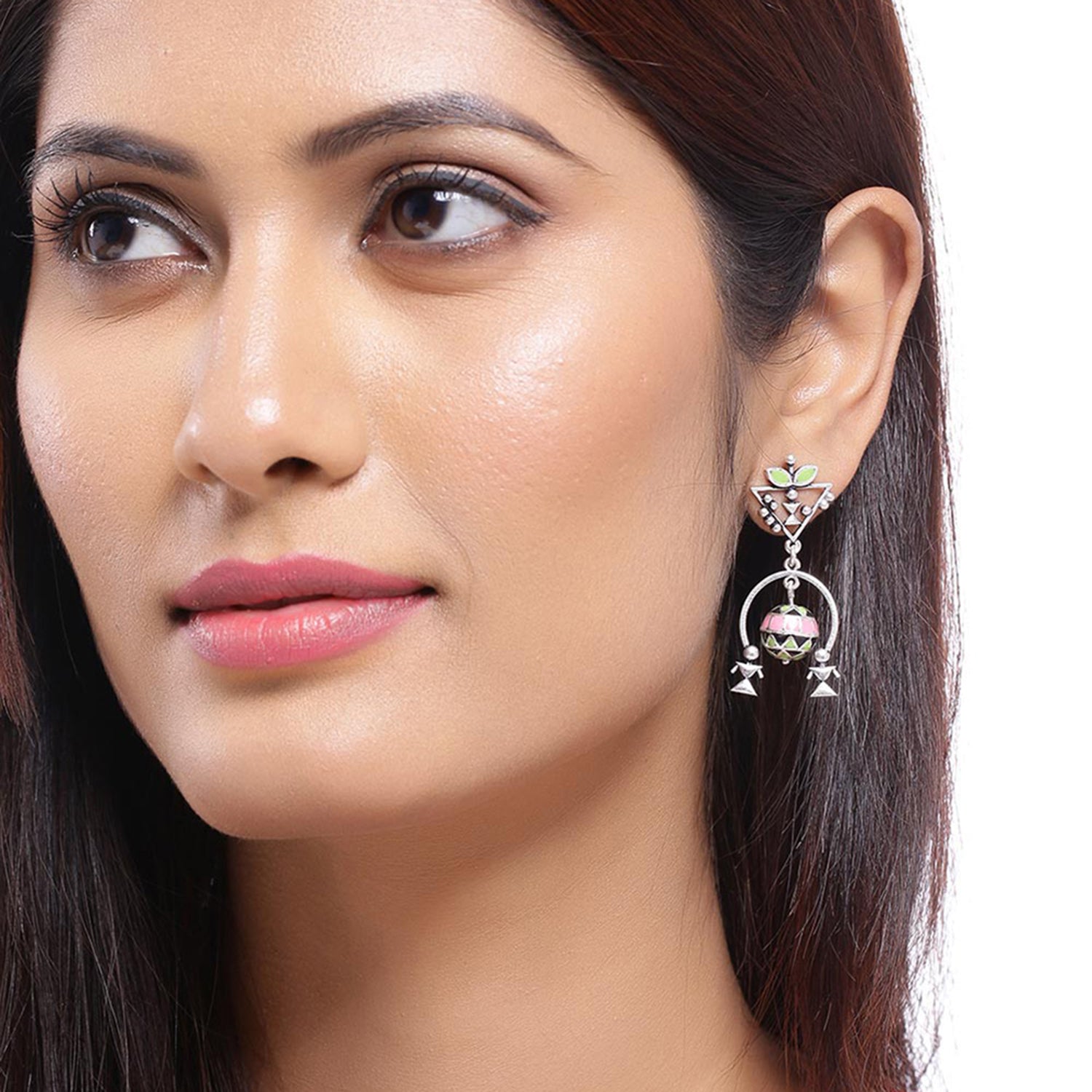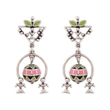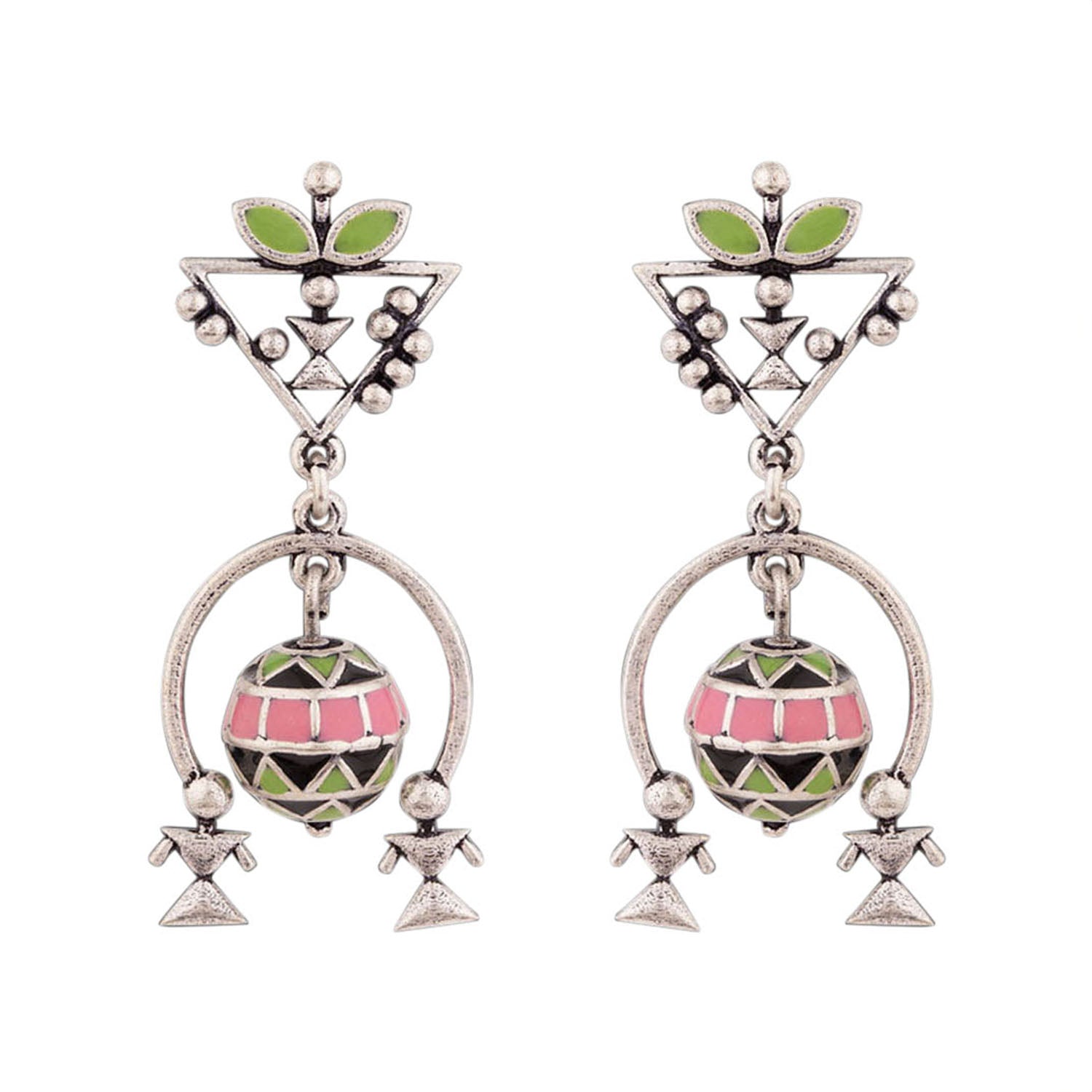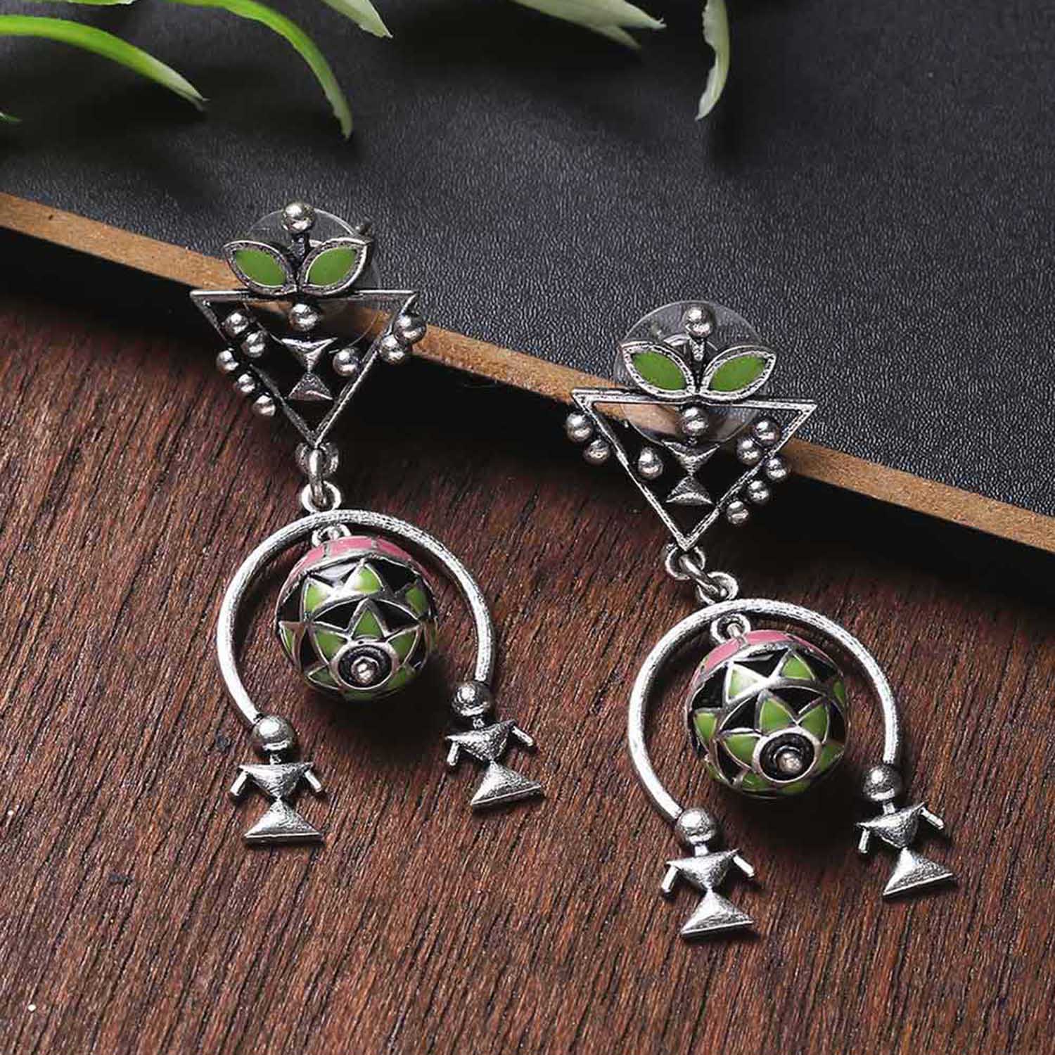 Lightly layered earrings with floral and tribal motifs fashioned after pattern found in Warli art. Made from brass and oxidised silver plated. Pair with casual sarees.