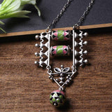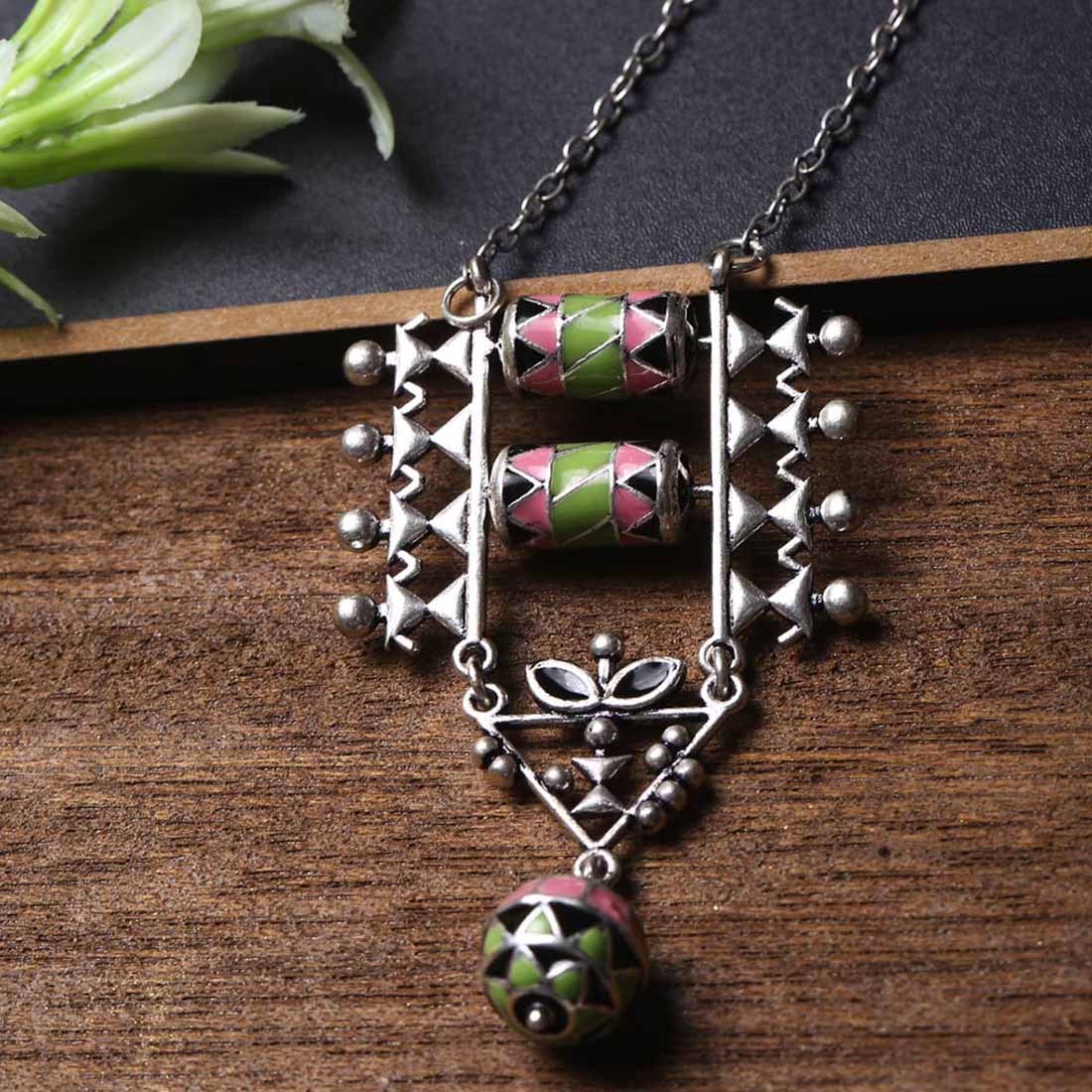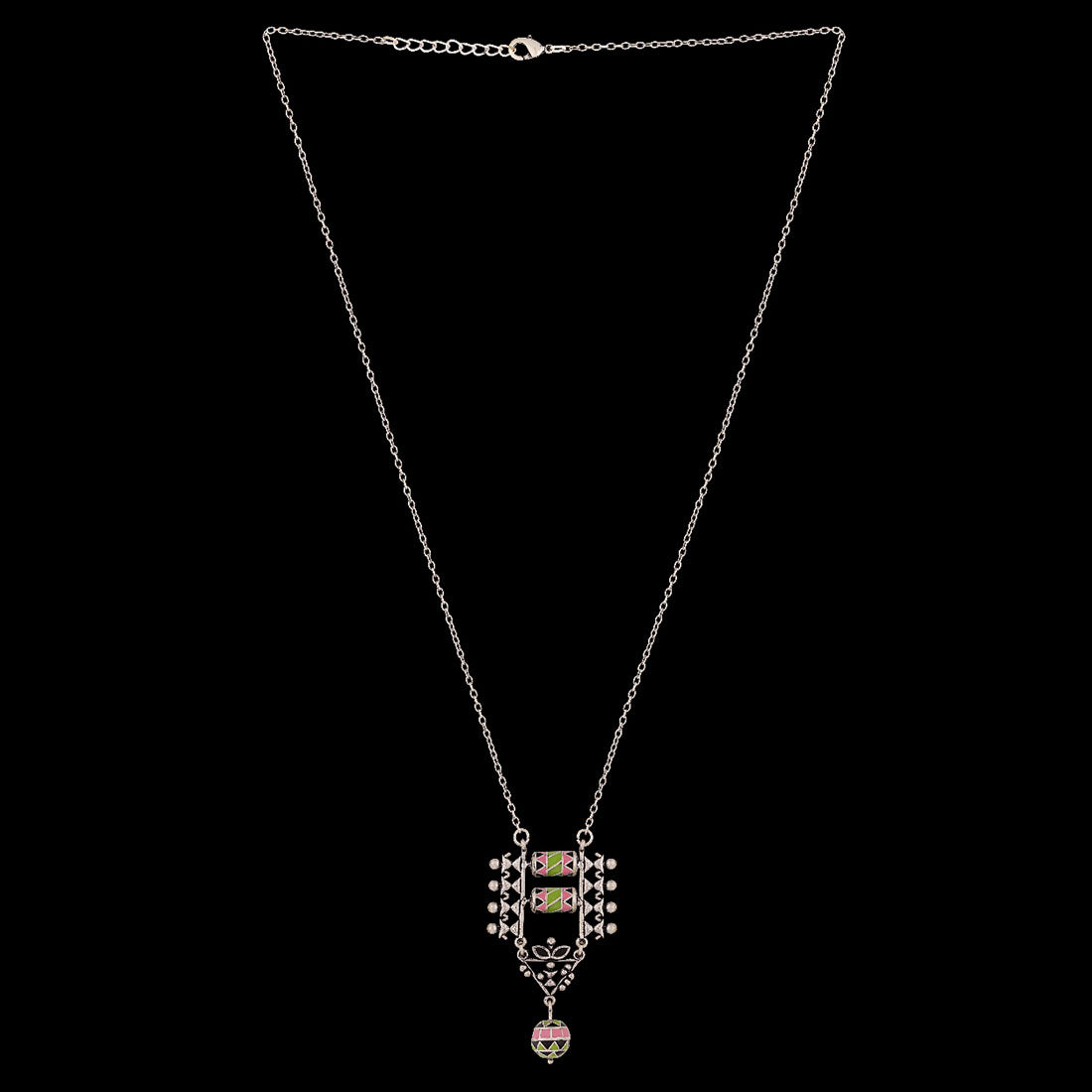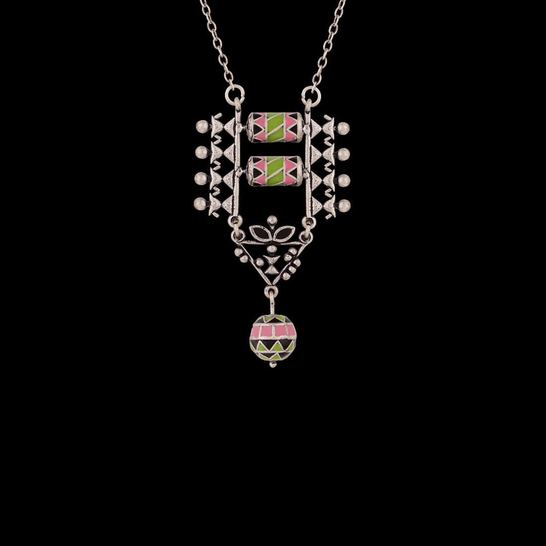 Ethnic style necklace made from brass and fashioned after designs found in Warli paintings. Oxidised silver plating and good for everyday wear.